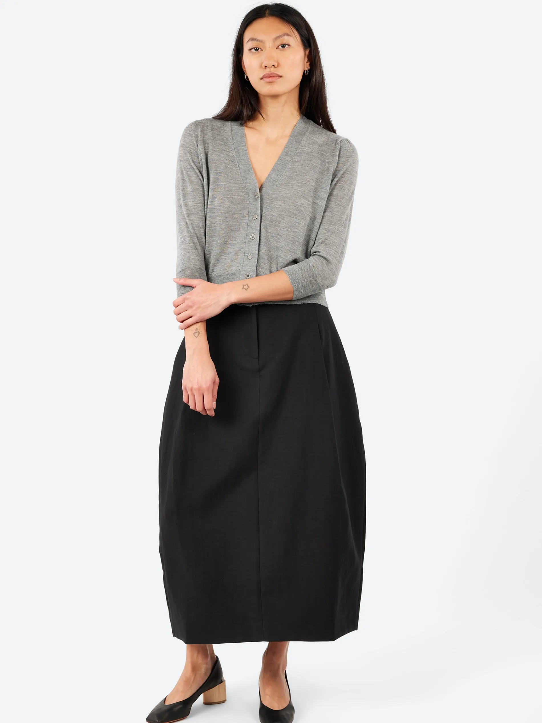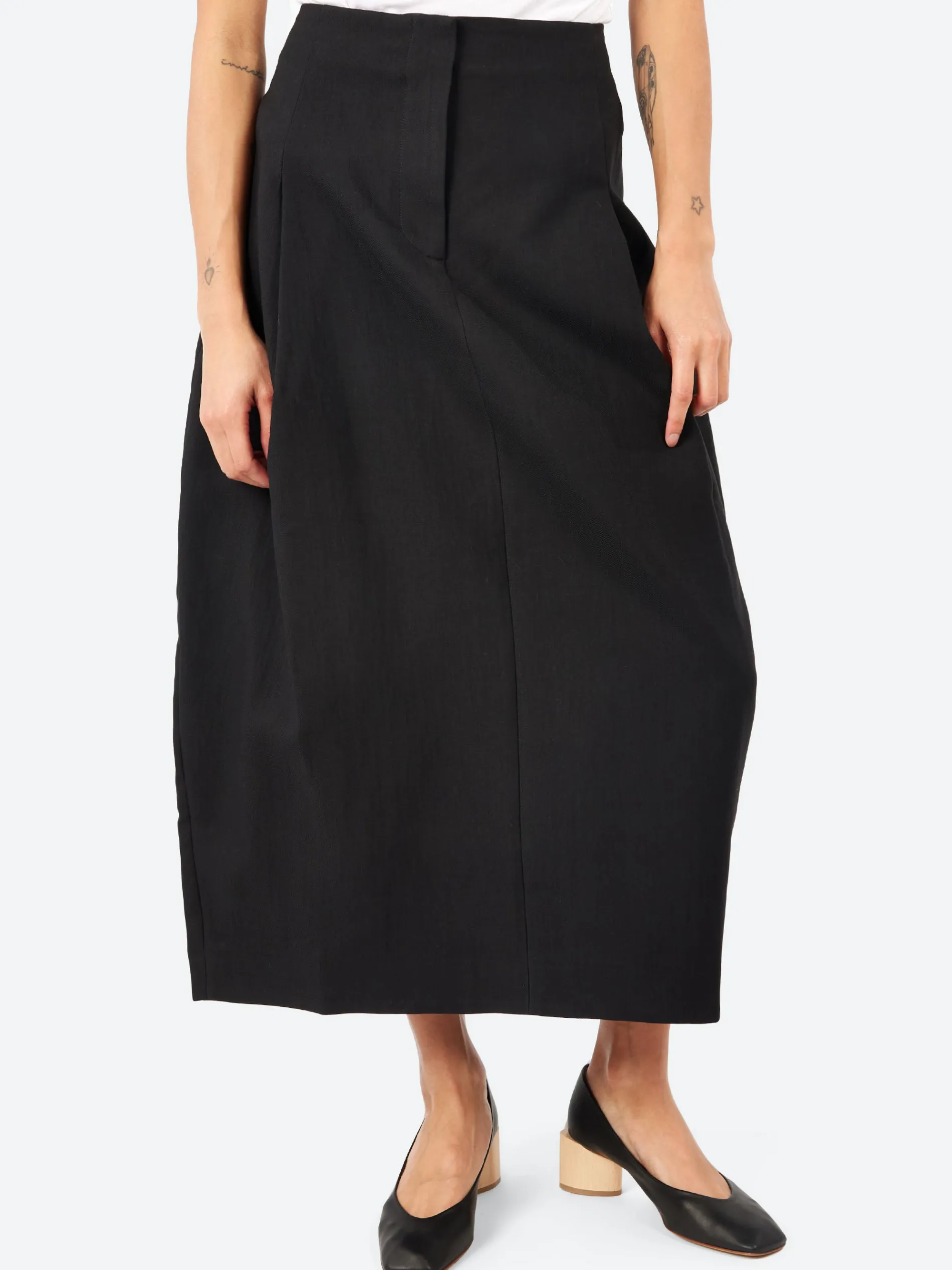 The Carson skirt is cut from a textured double cotton that’s woven to a twill weave, creating a soft structure that helps lend a sculptural bell-like shape to the silhouette. It has deep inverted pleats that are cleverly folded to create extra volume and which also draw the eye down to a thick folded midi hem that stops at the calf.