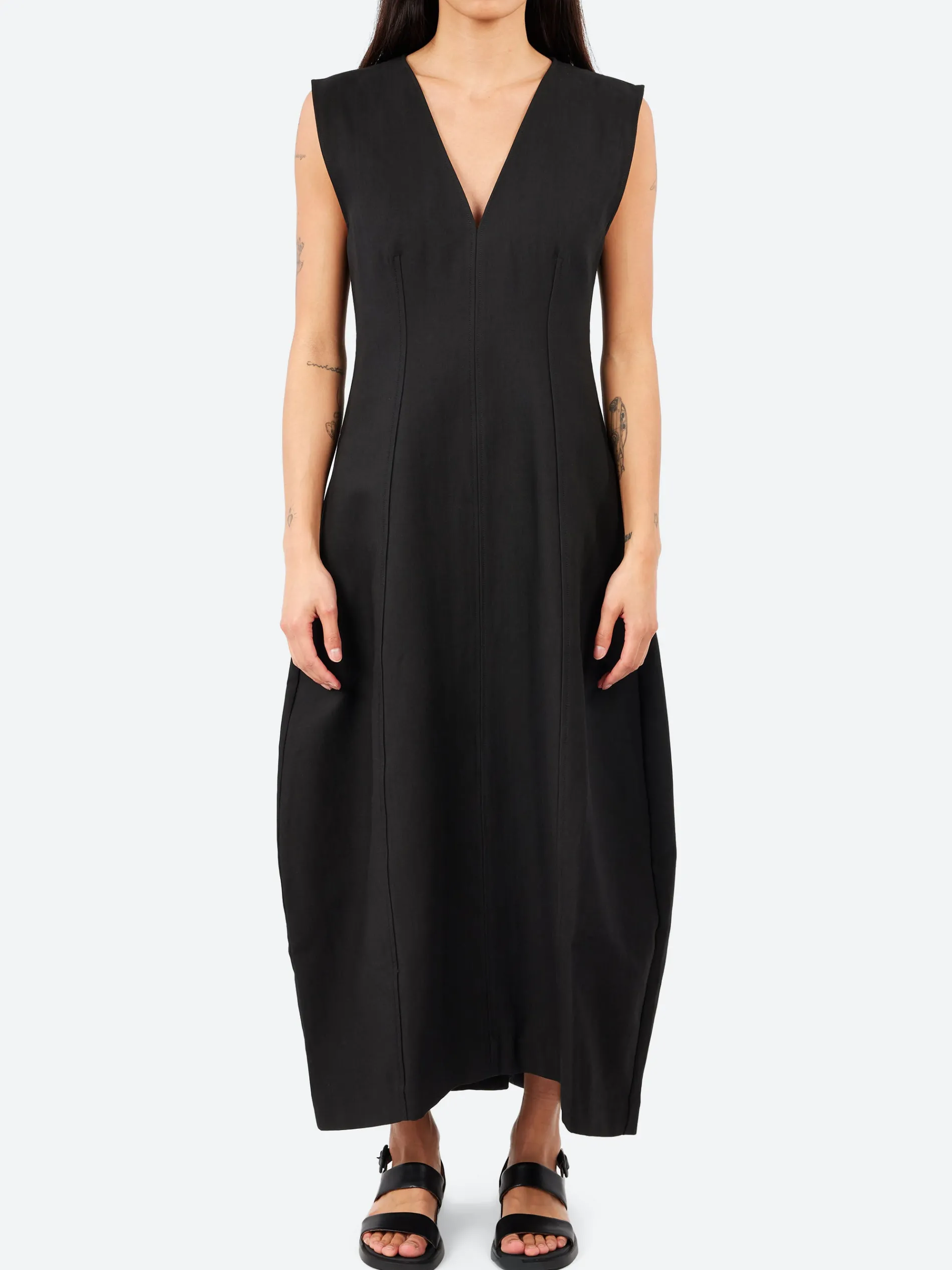 The Enna dress is cut from a textured double cotton twill that’s imbued with a soft structure that’s further molded with shaping seams through the bodice. This V-neck style has handy side slit pockets and is finished with a back vent to ensure ease of movement through the midi-length skirt.