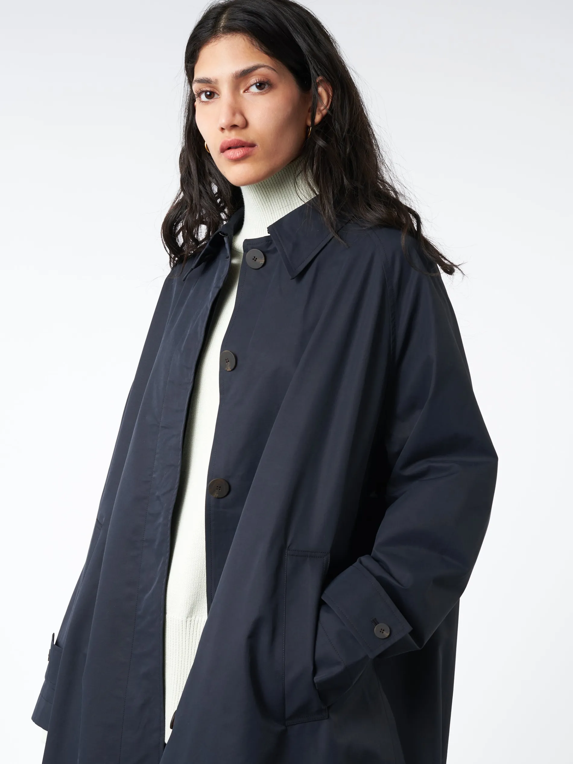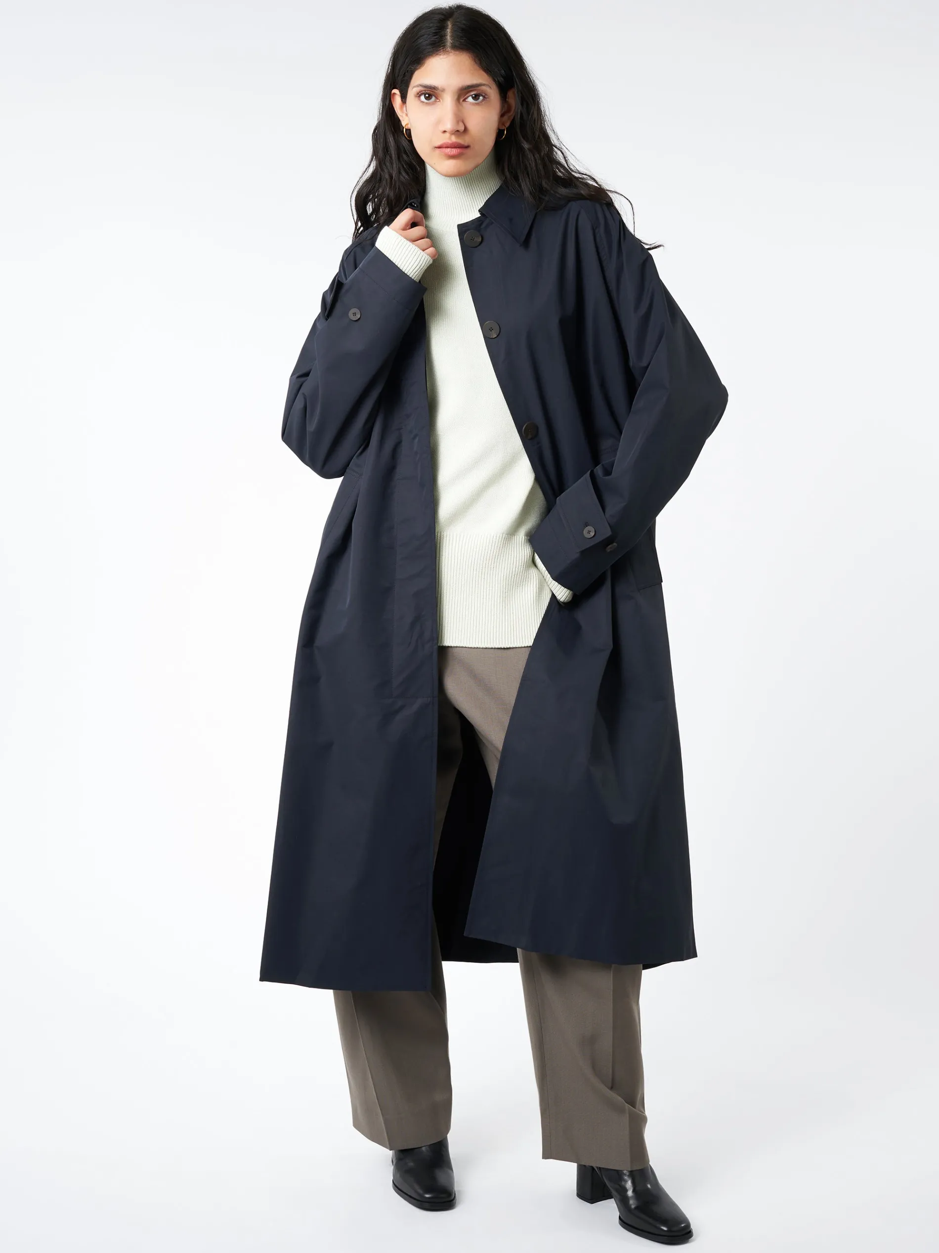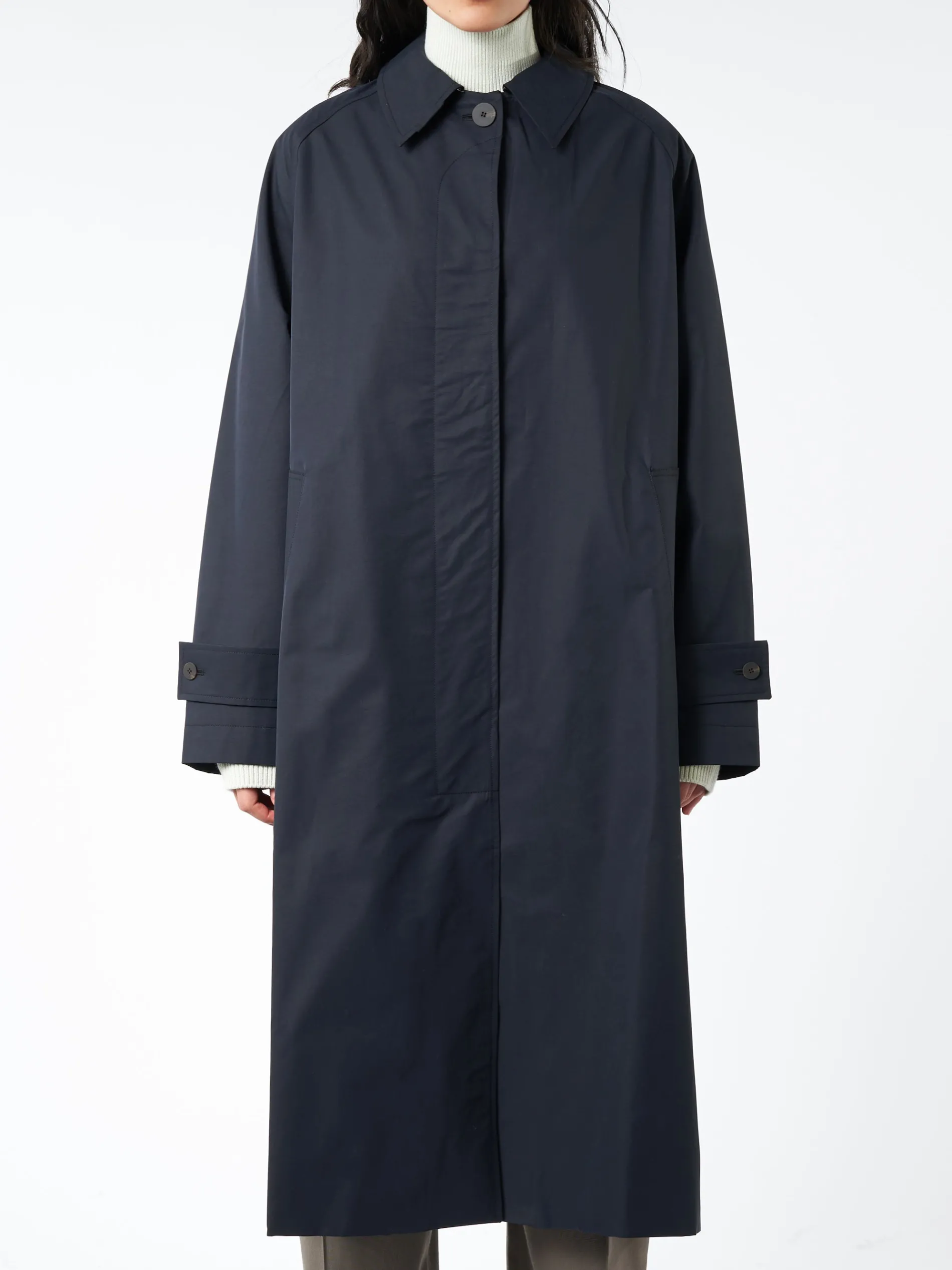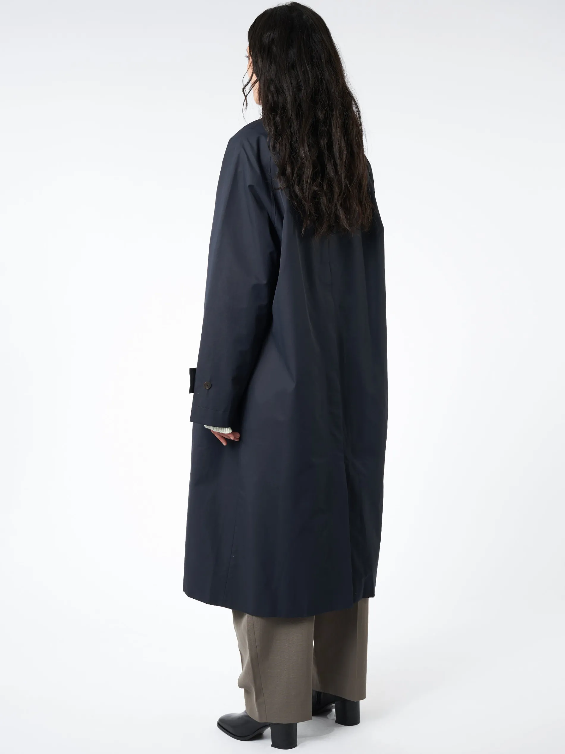 A loving tribute to classic trench coats, Studio Nicholson Holin’s raglan shoulder and full, voluminous cut make it sophisticated but easy to wear. The fabric is a crisp, performance-style cotton blend, with water repellent qualities.