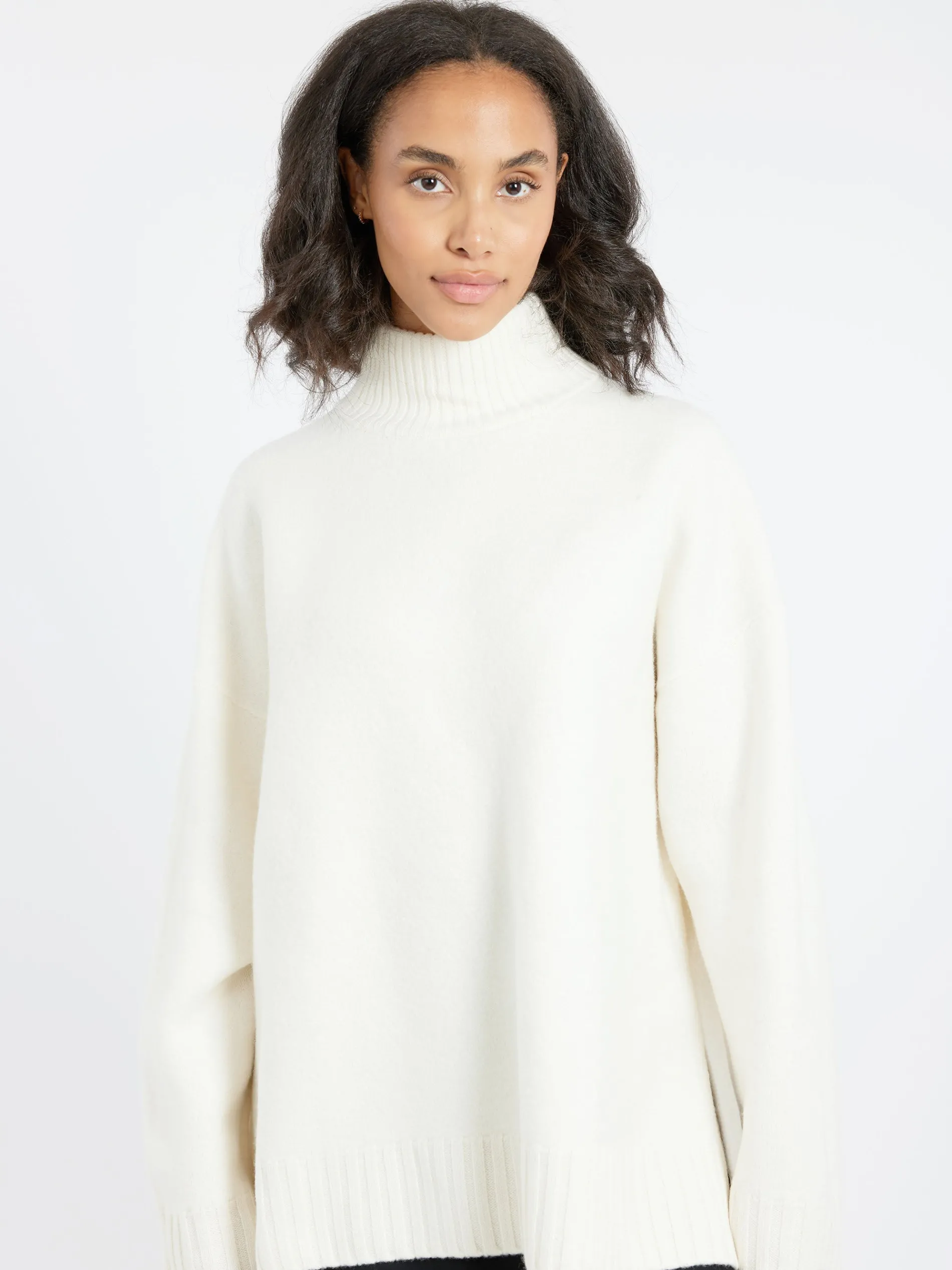 Hozu has a square body shape and a high neck that combine to create a flattering, minimalist silhouette. The softly boiled wool has an extraordinarily fleecy texture.