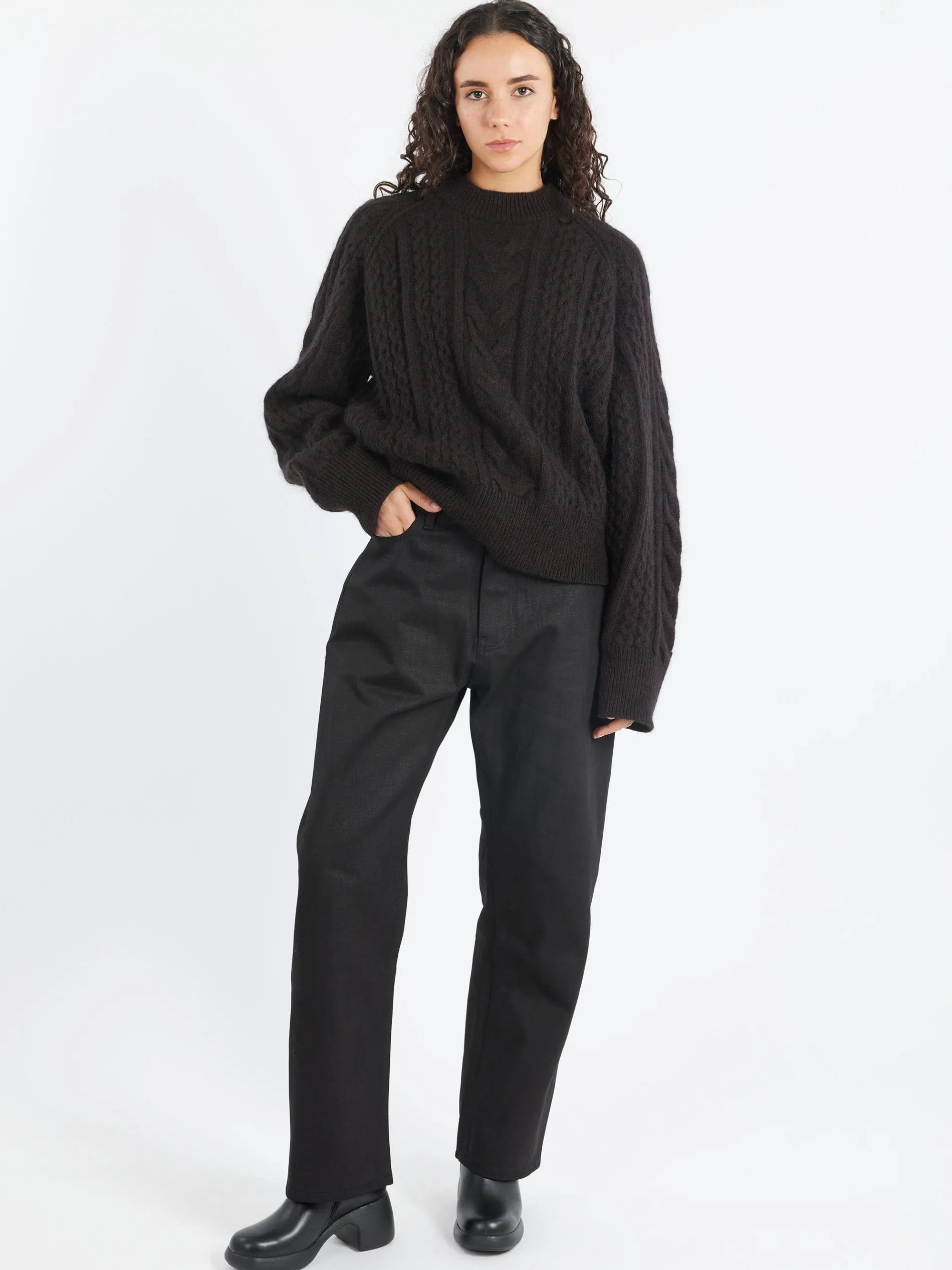 Studio Nicholson Molve jumper is spun from unbrushed mohair Aran yarns that result in a soft, fluffy handle and gentle luster. It is accented with cable knits in varying sizes for textural interest and has chunky ribbed stitching at the neck and hem to hold its shape.