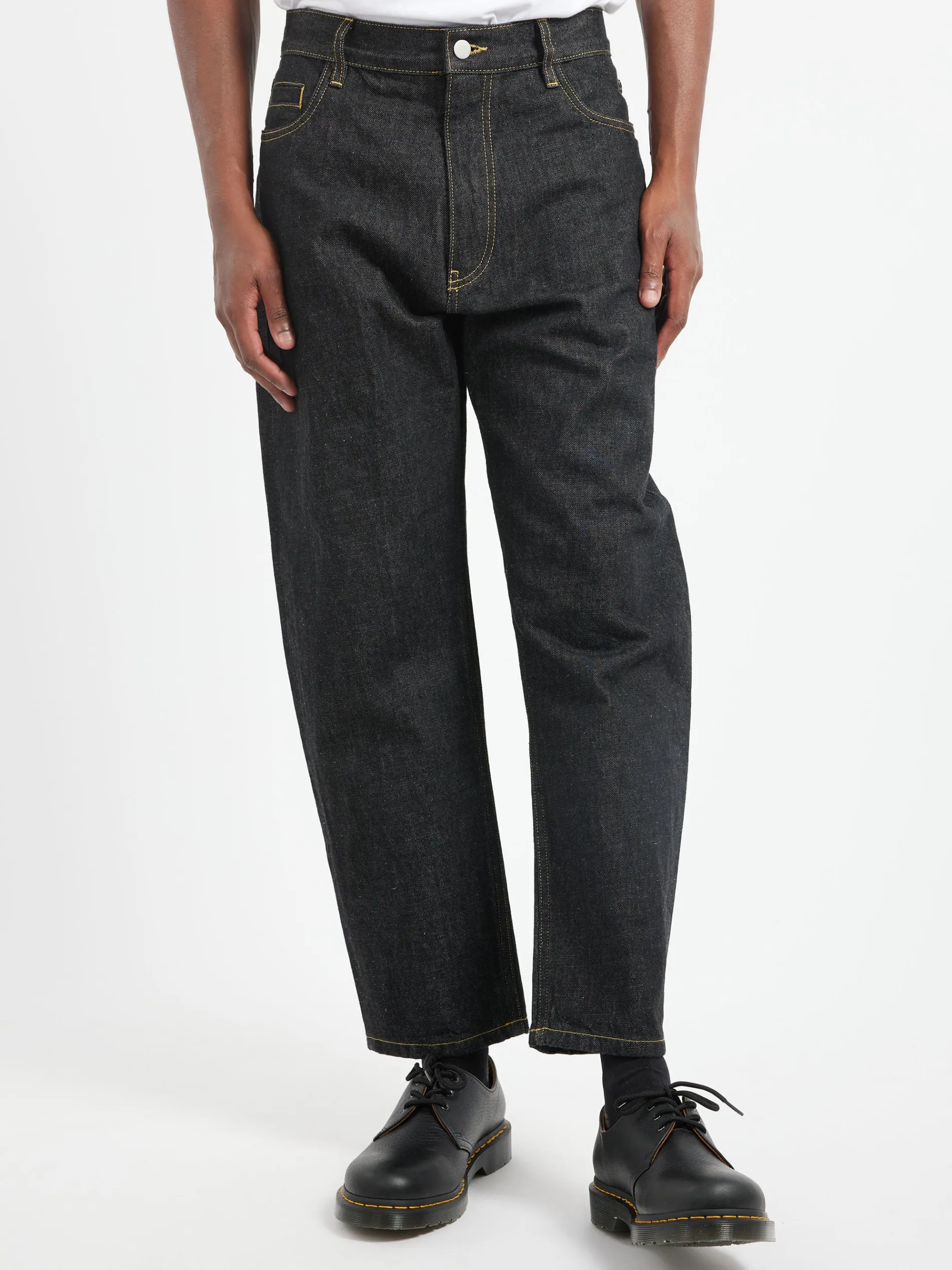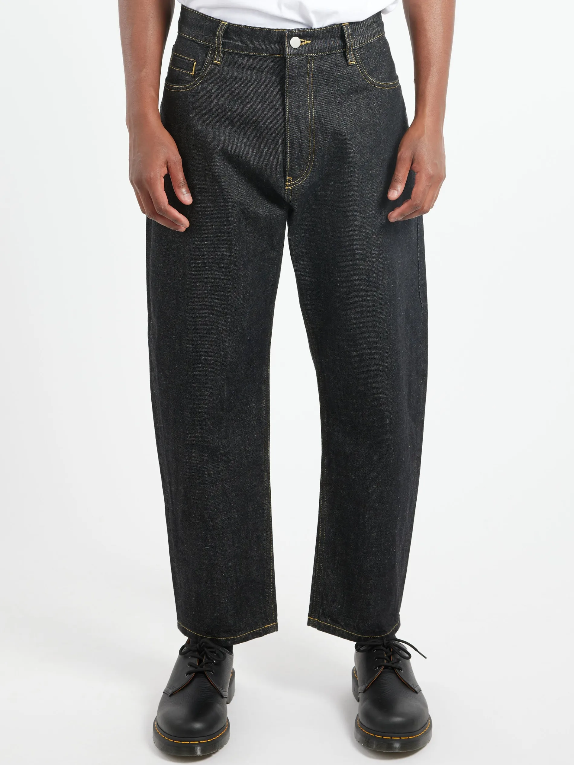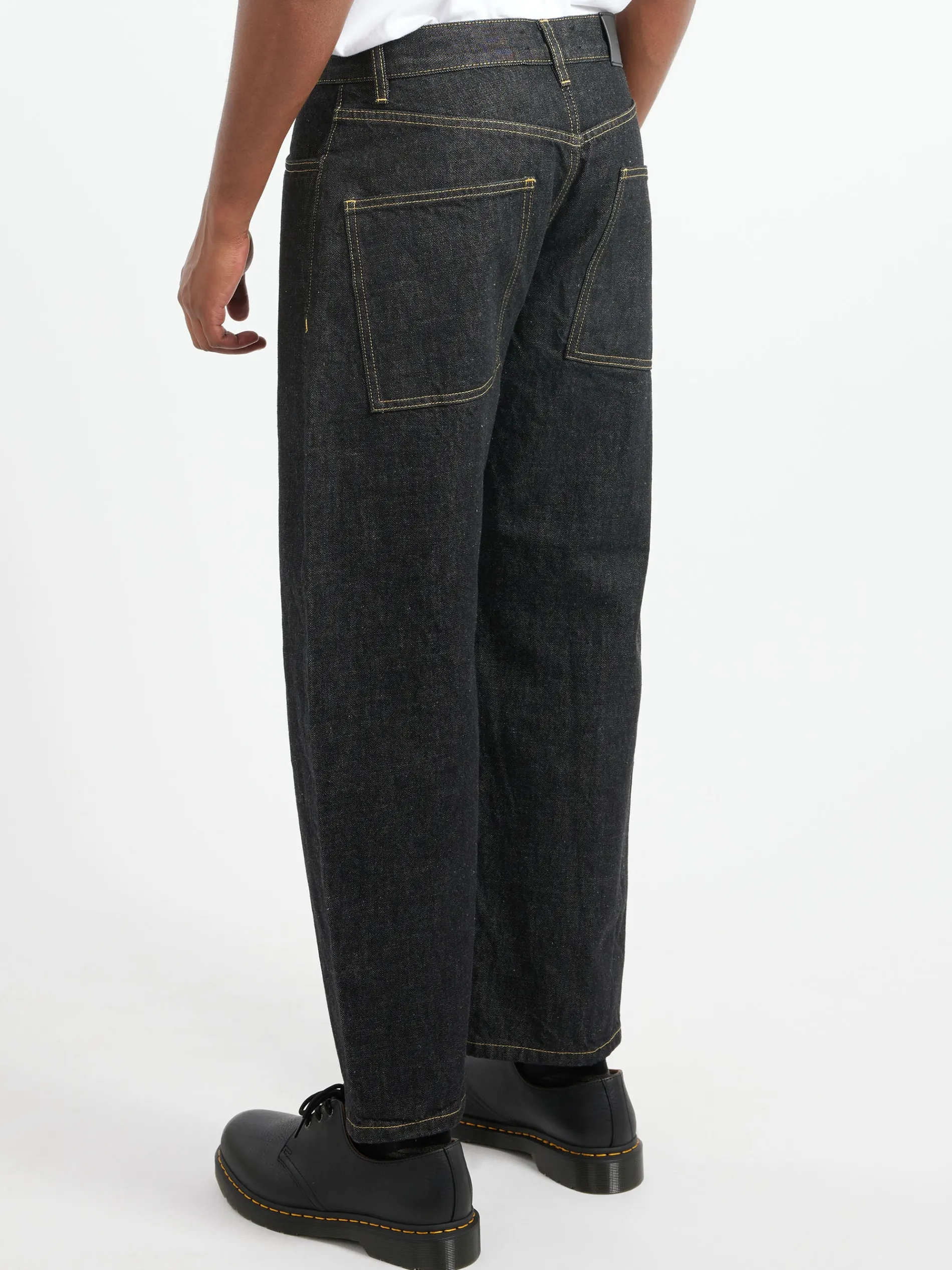The Tannaro is a high-waisted, tapered leg pant in raw Italian denim, with oversized square rear pockets.