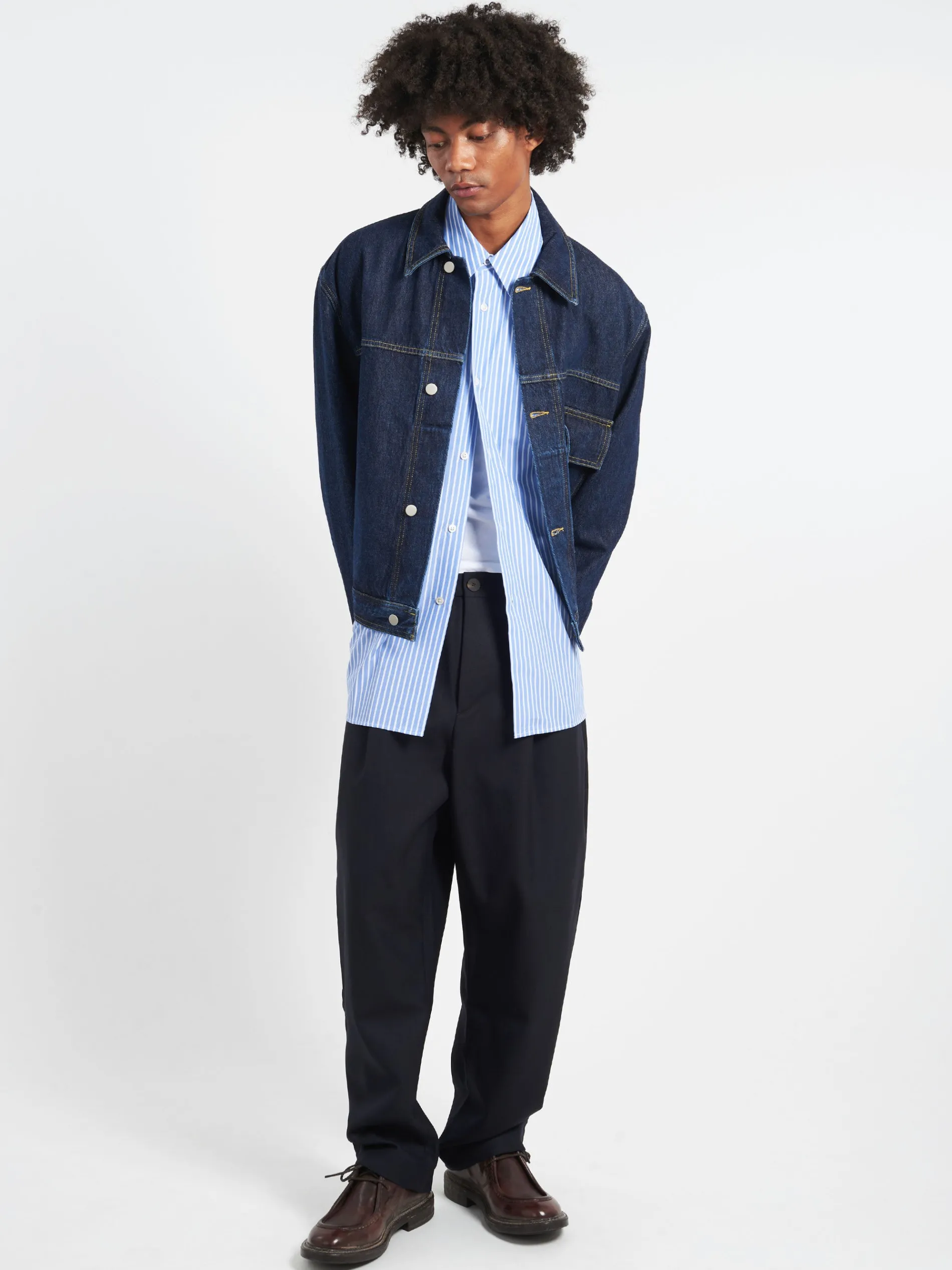 The Tuck pants have a cropped leg with a gently rounded shape. A single pleat front and mid-rise nod to traditional tailoring. They are cut from springy, airy tropical wool fabric.