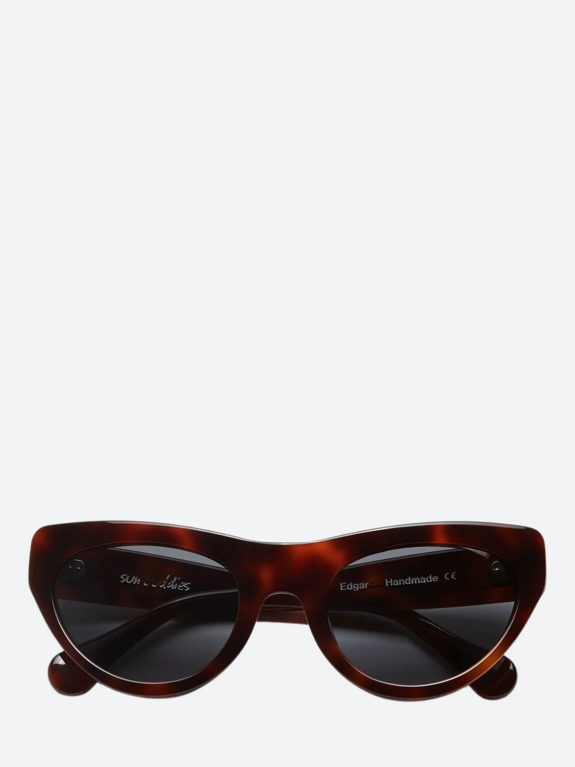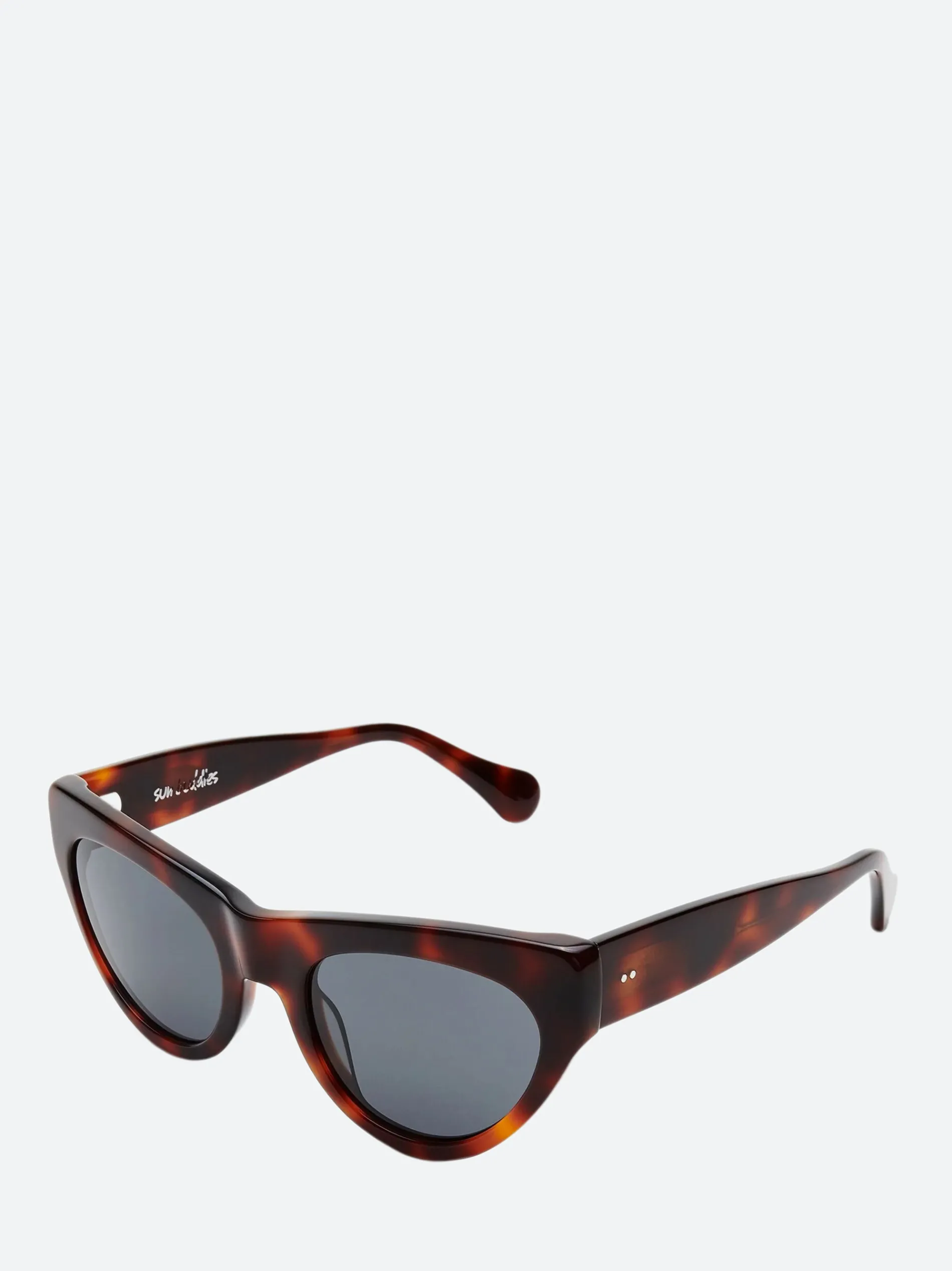 Semi translucent sports inspired curved frame in tortoise, handmade of Italian acetate. Contrasting silver mirror Carl Zeiss lenses with 100% UV protection and a seven bar hinge with two visible rivets on the temple.