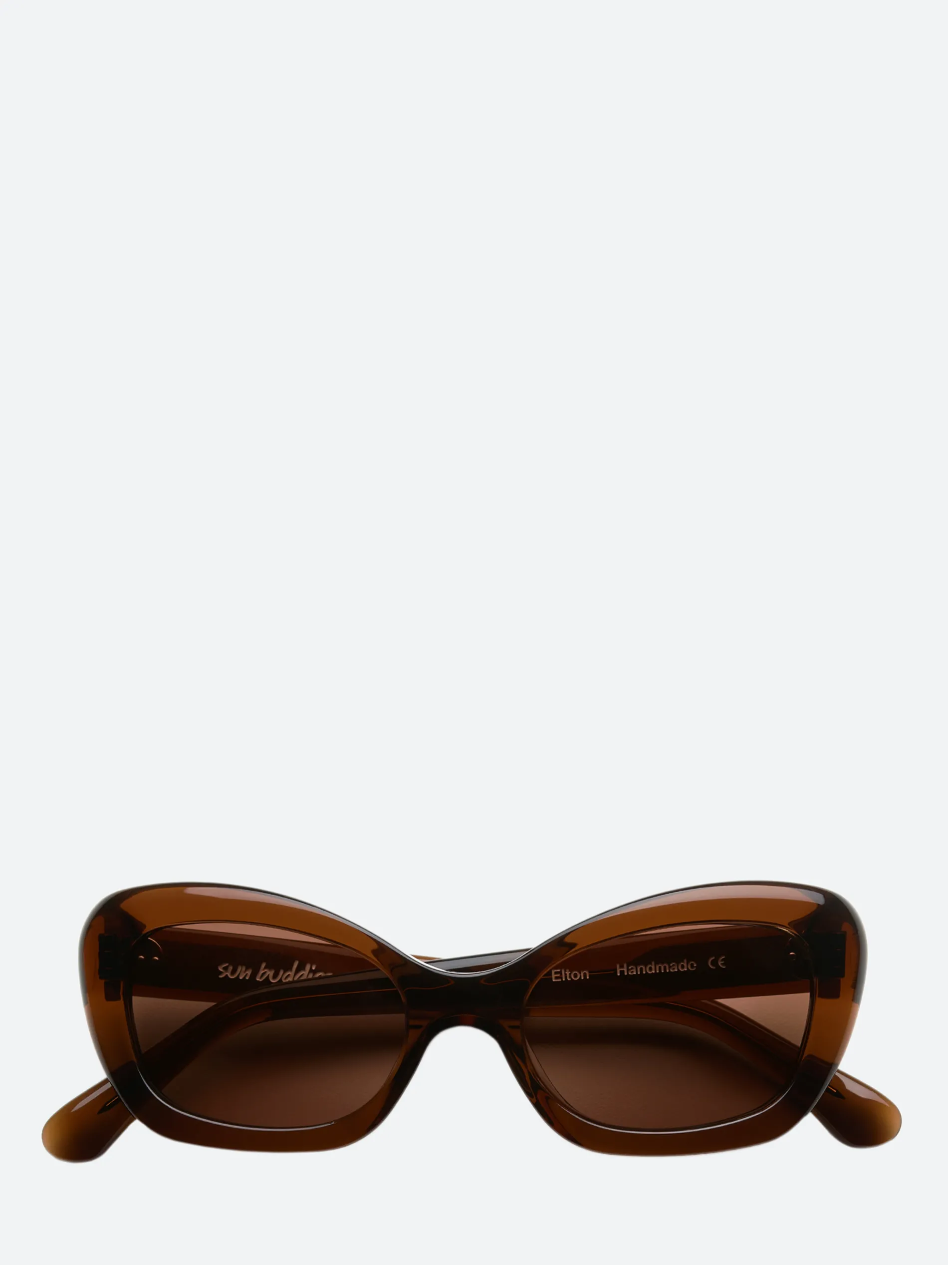 Transparent, slightly thicker square cat eye frame with rounded corners in a brown colorway, handmade of Italian acetate.