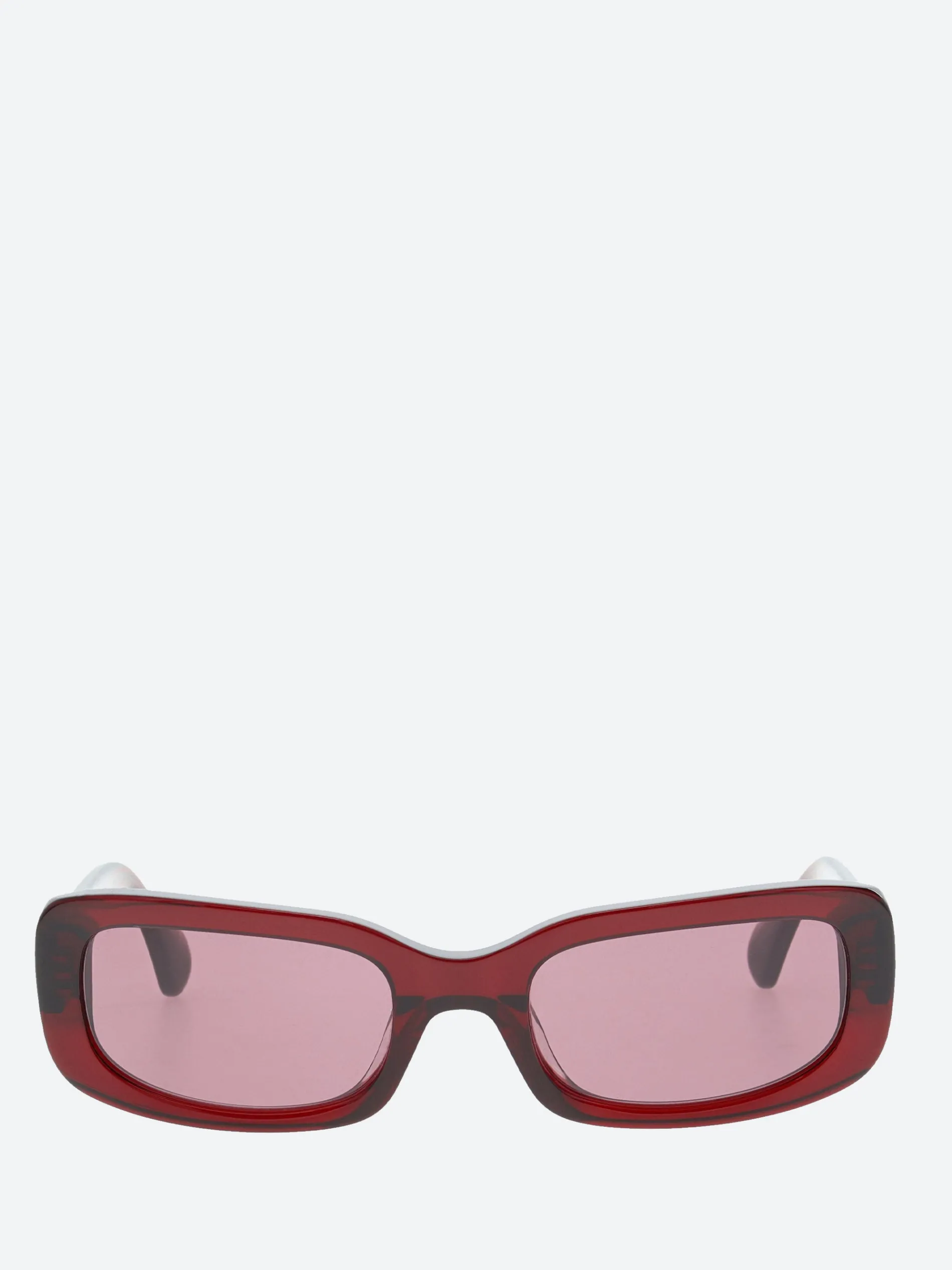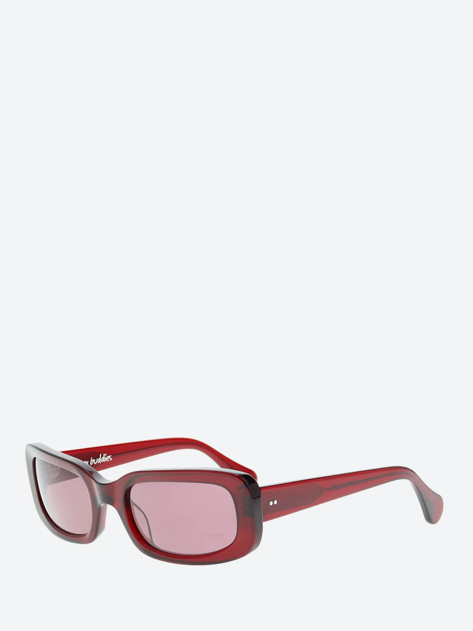 Semi transparent 70’s inspired square shaped and slightly thinner frame in a red tone, handmade of Italian acetate.