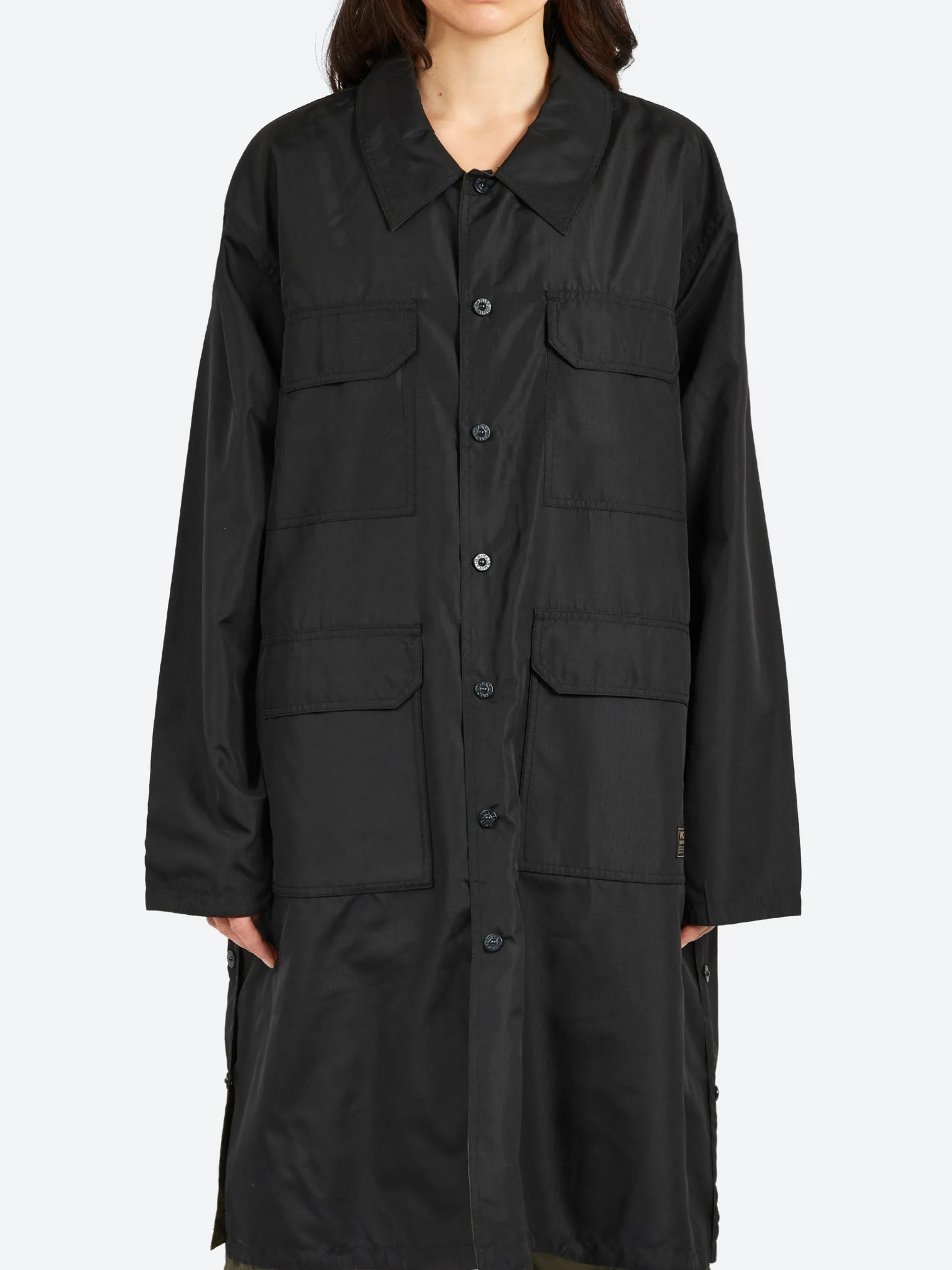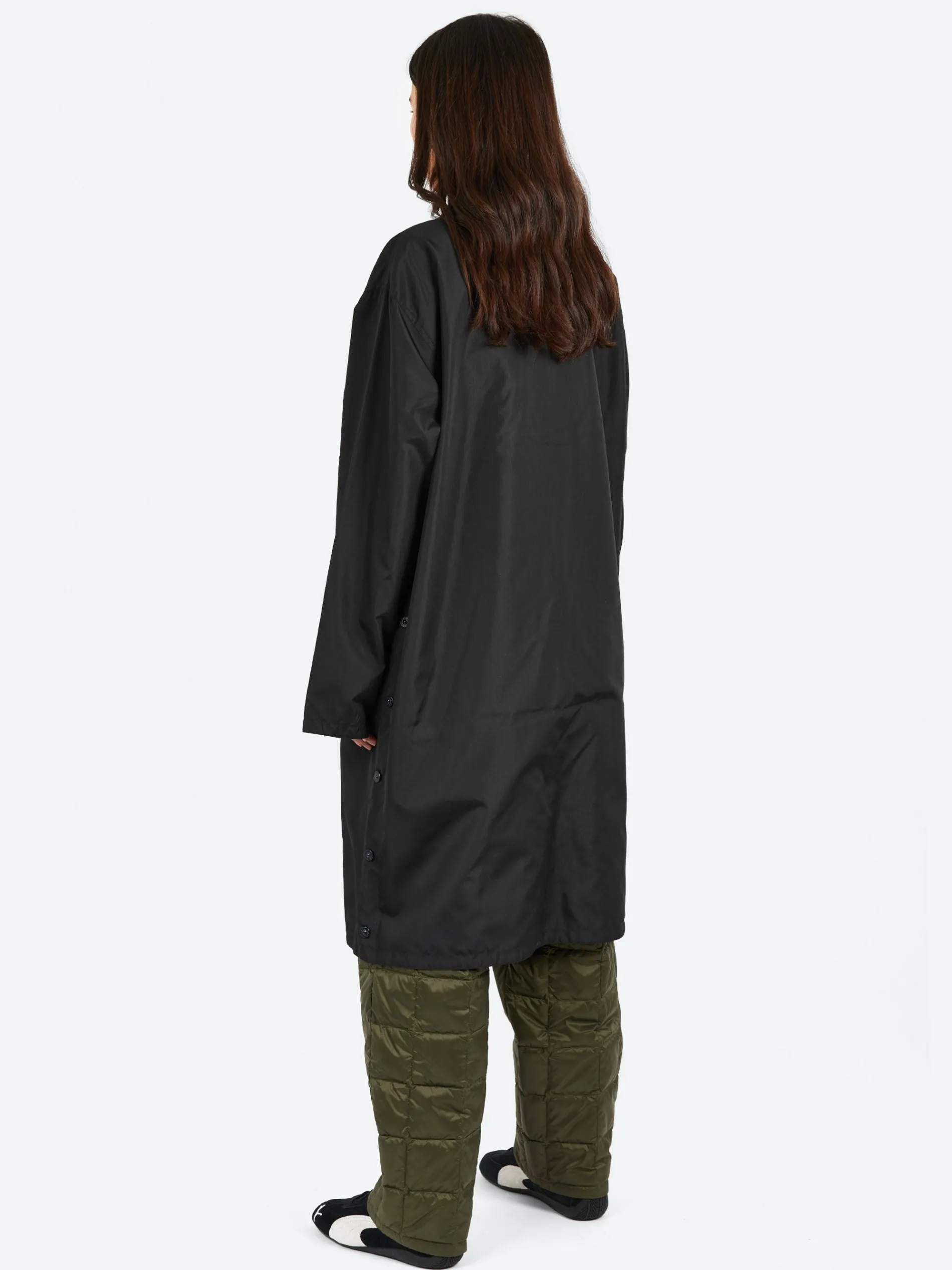 TAION’s military reversible bal collar coat provides versatile wear with its lightweight, stain-resistant fabric. Its long length and metal button details add style, while the design allows it to be worn casually like a shirt. Button slits on both sides increase mobility, making it easier to move, and the bottom pockets are easily accessible for added convenience.