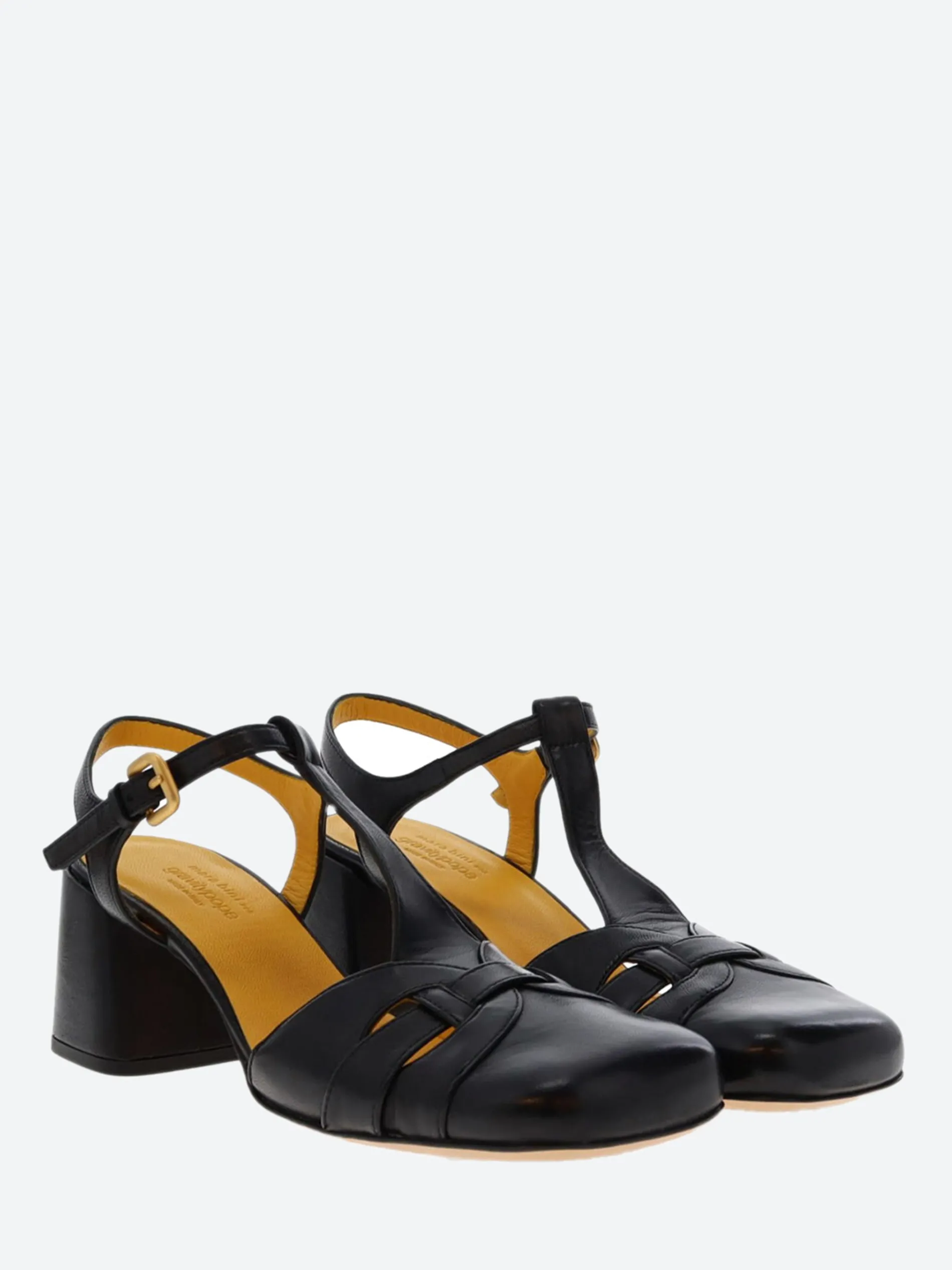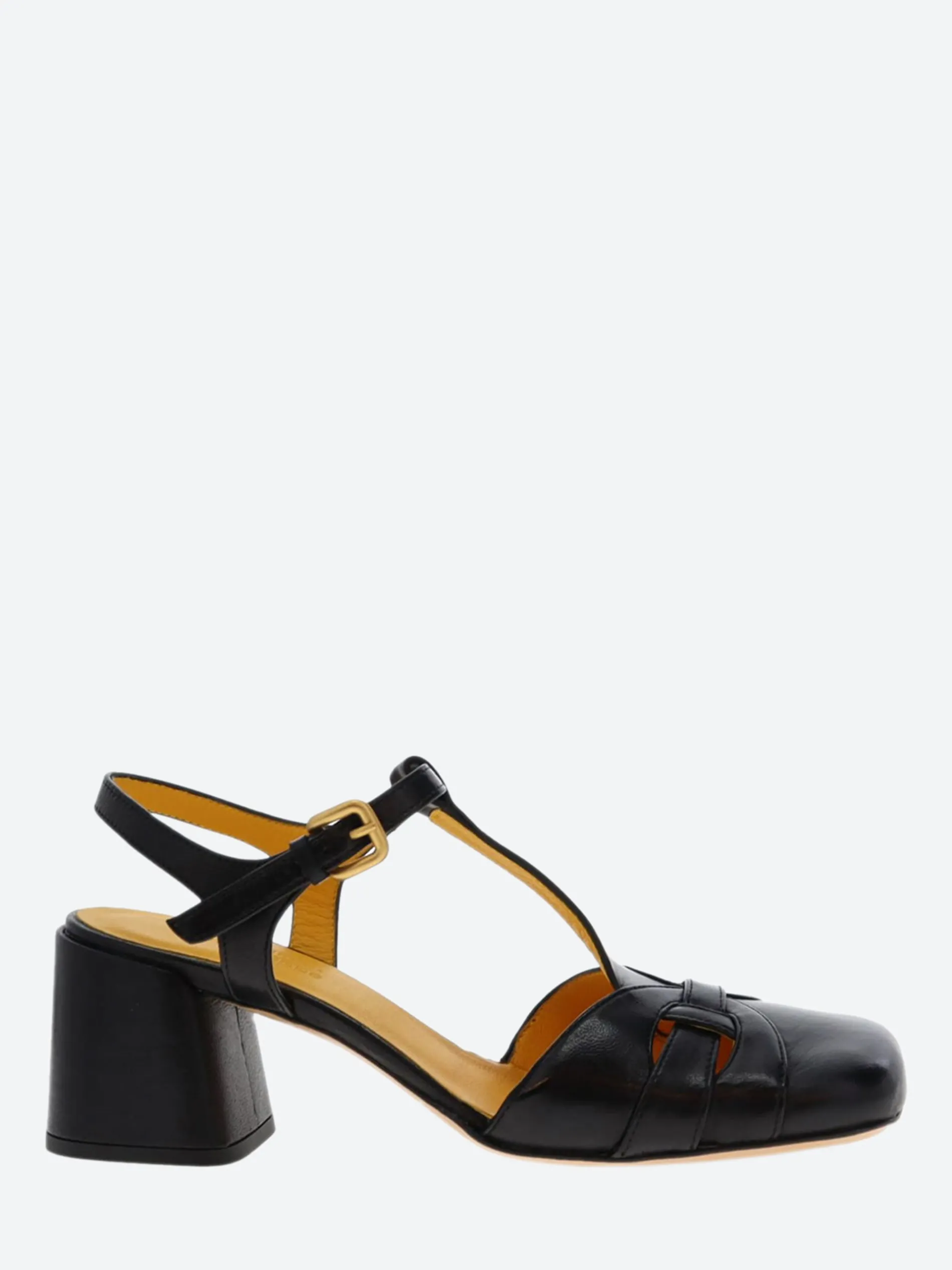 - Adjustable T-strap with gold-tone buckle