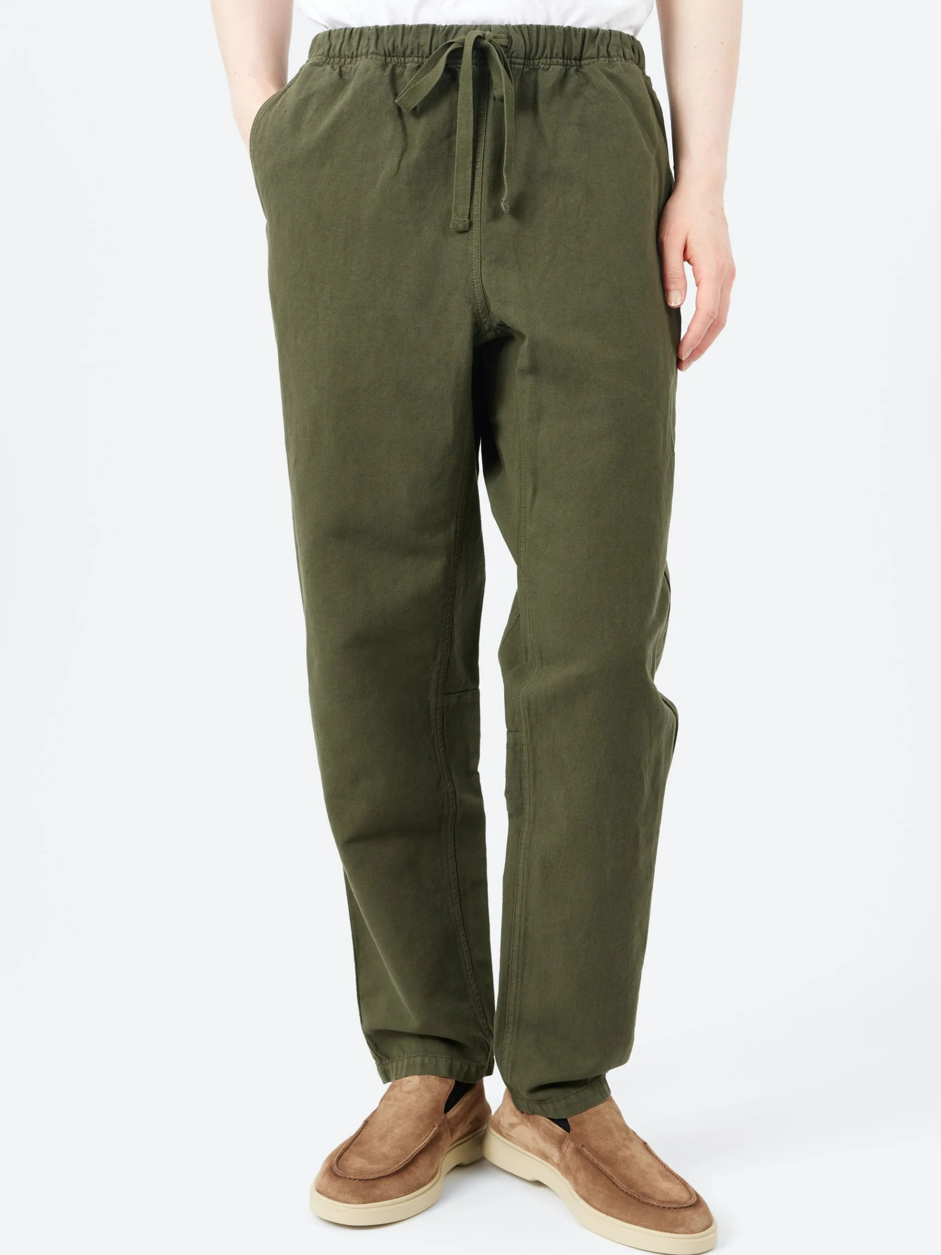 Alfie trousers are made from supple herringbone woven in Italy, which is garment-dyed, a process which gives each piece a unique texture and natural color variation. Shaped with an elasticated drawstring waist for comfort, falling to tapered legs with inner panels, then finished with back patch pockets.