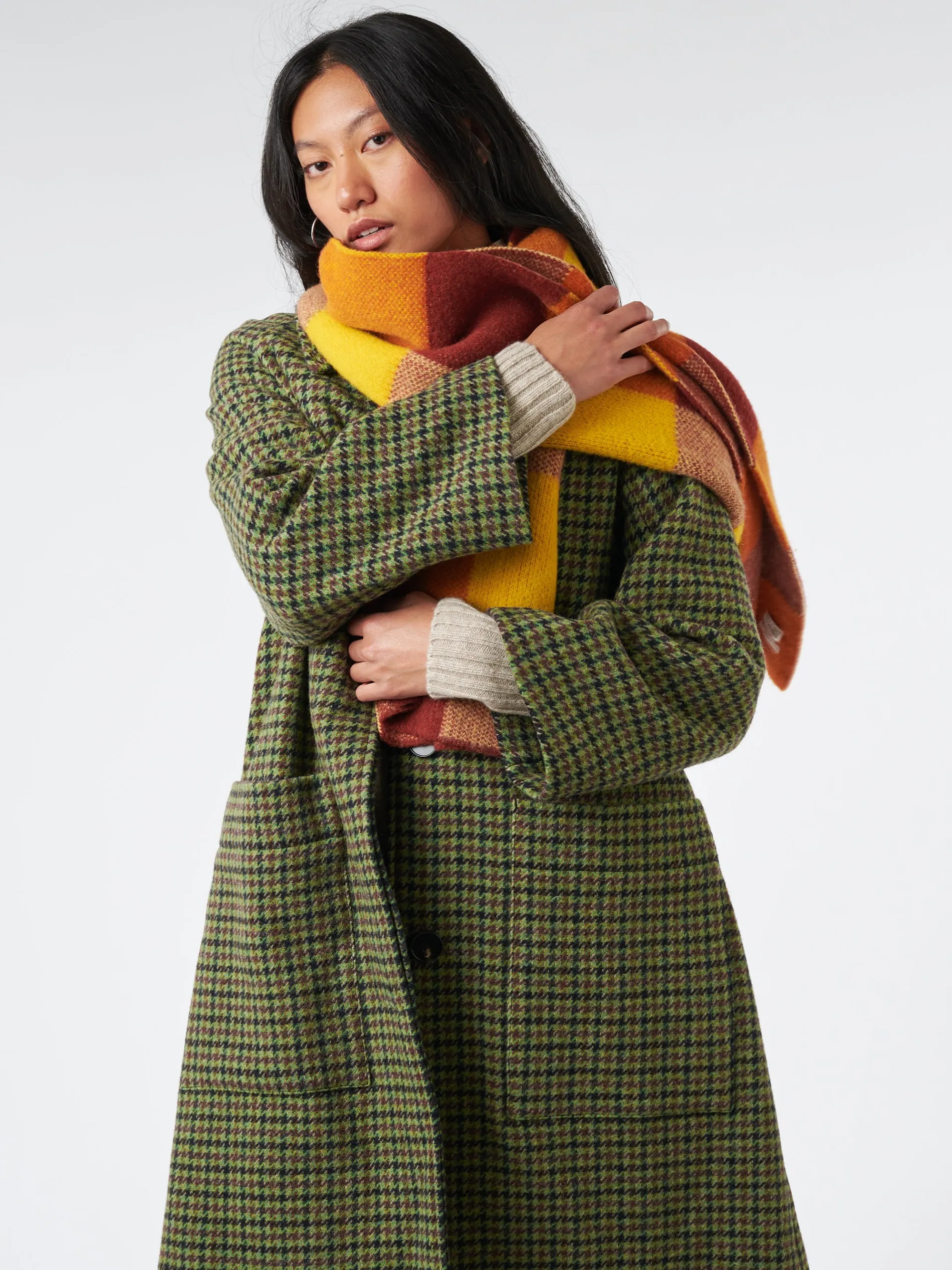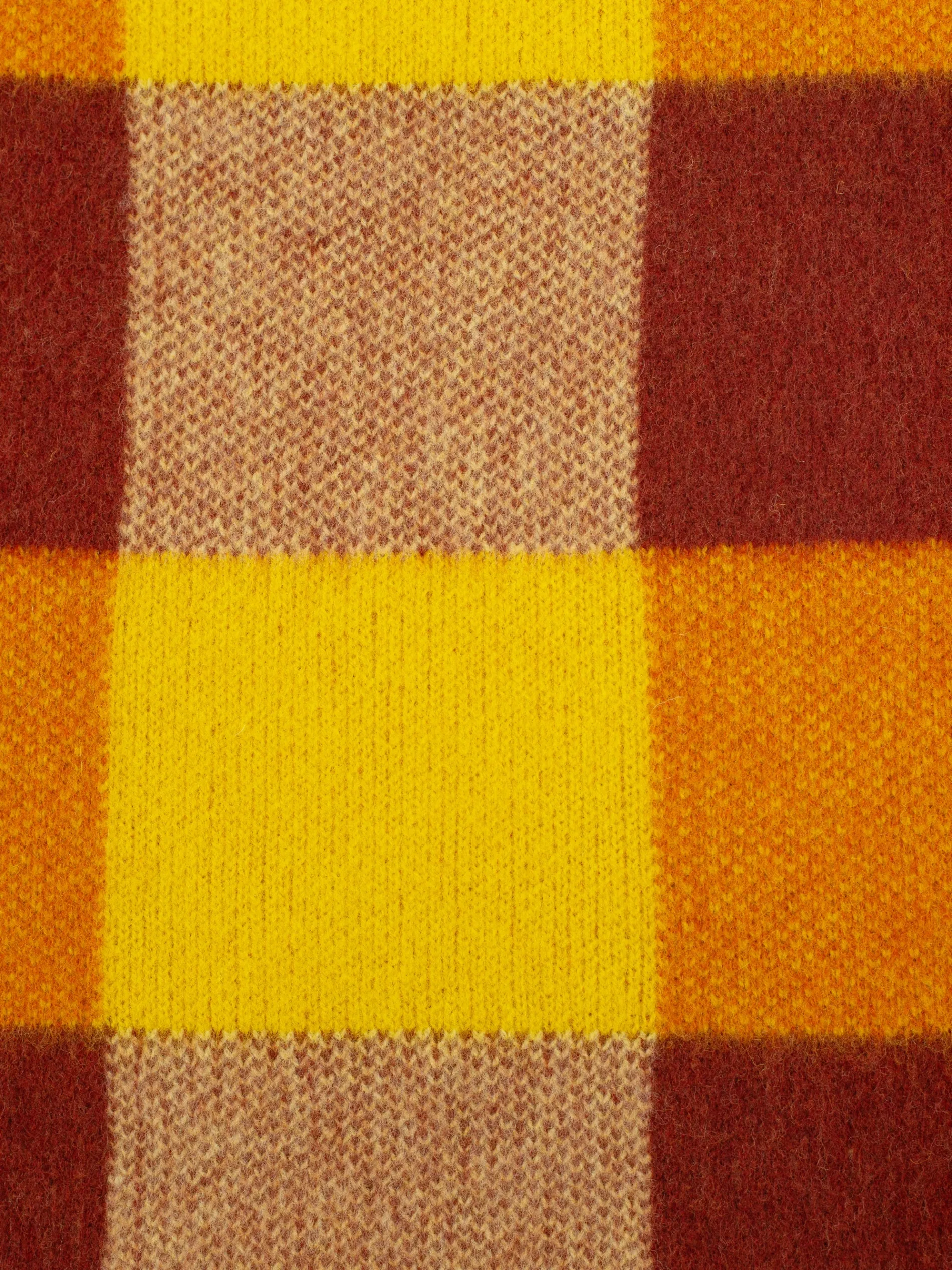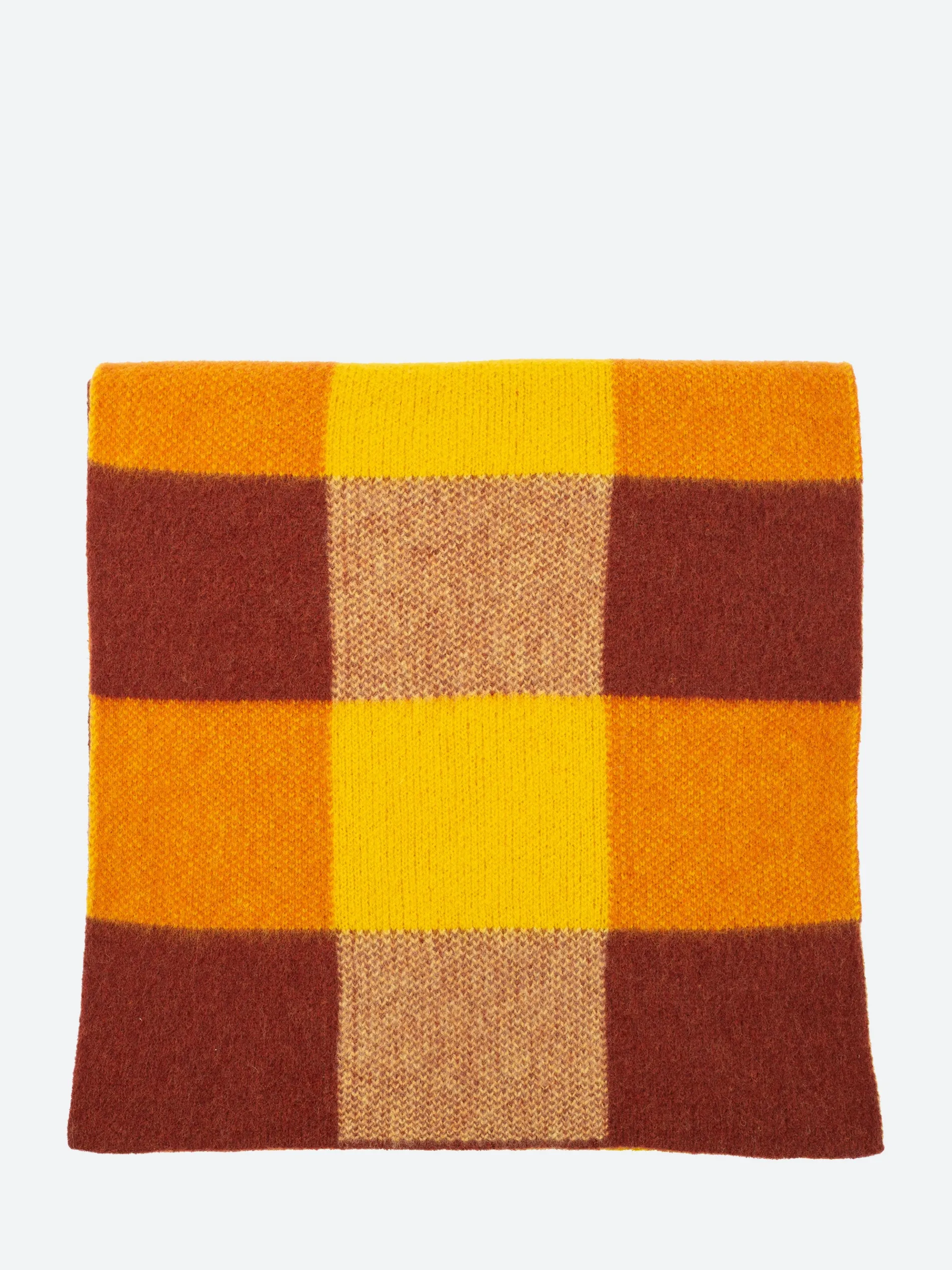 A warm and vibrant colour-block scarf, knitted in Scotland from UK-spun wool. With a checked jacquard pattern that makes it reversible, and soft, gently felted finish.
