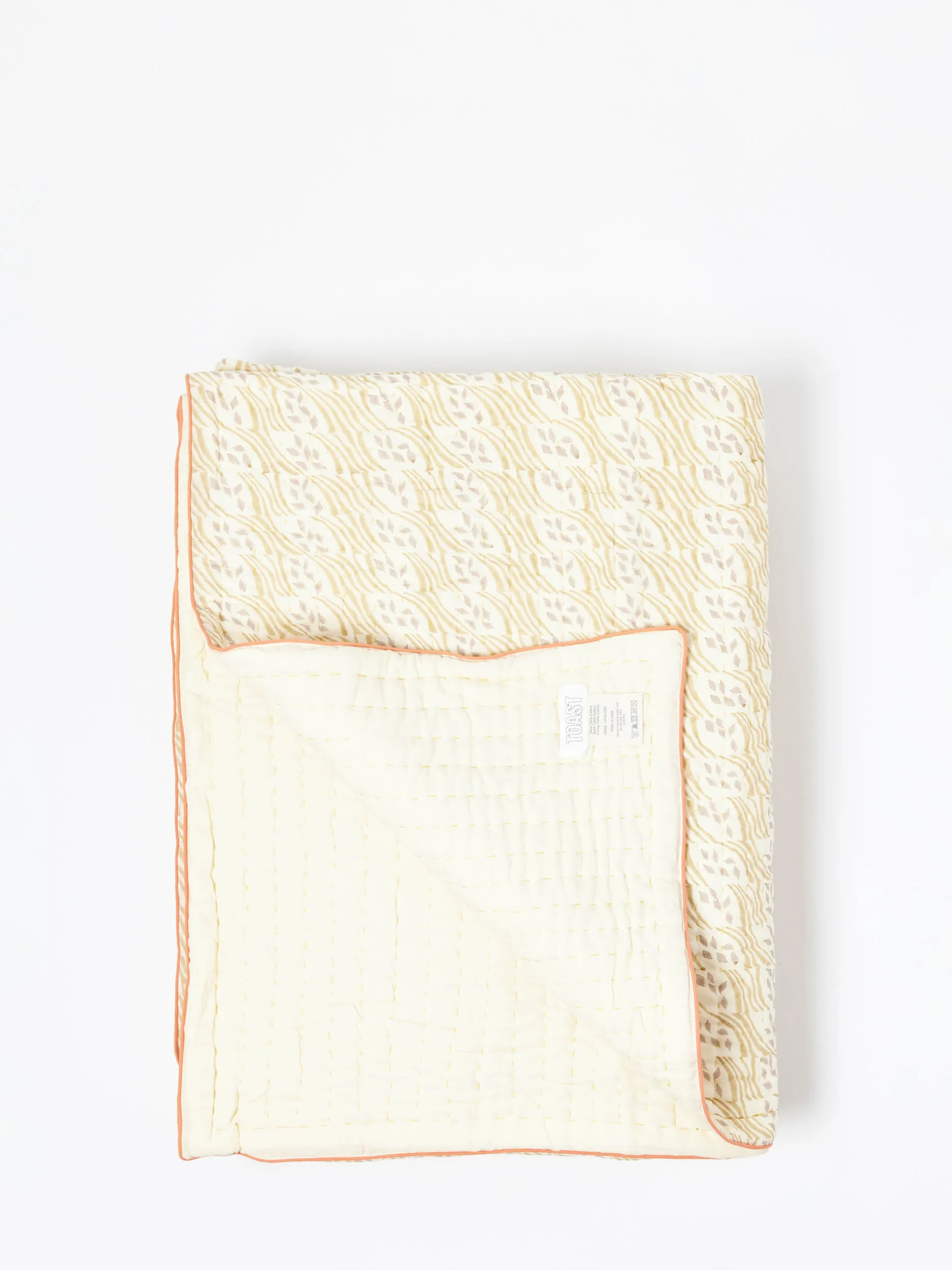 Soft cotton quilt hand block-printed by artisans in Jaipur. Filled with cotton wadding, then hand-stitched. With a plain cotton reverse and contrasting piped edge.