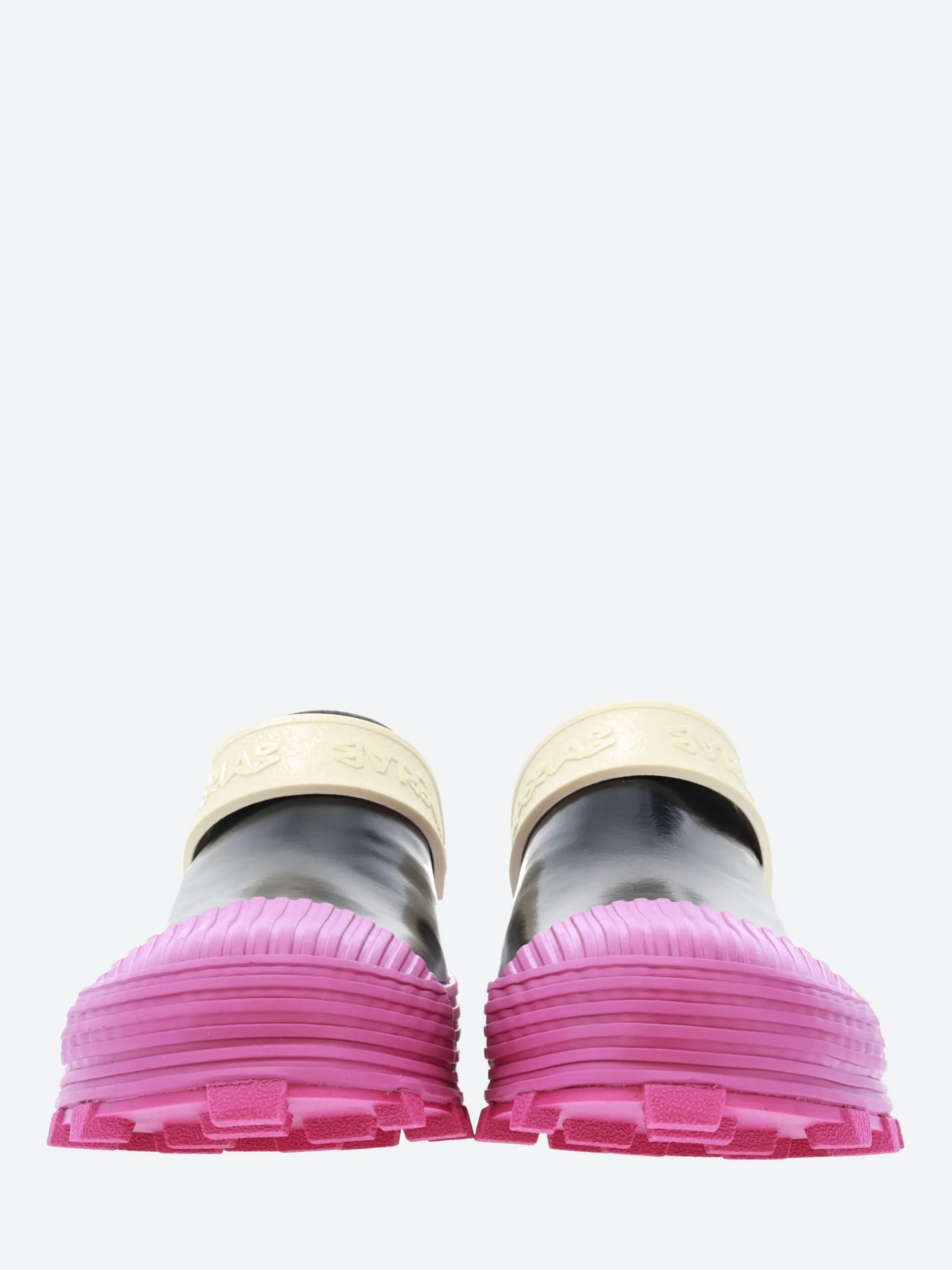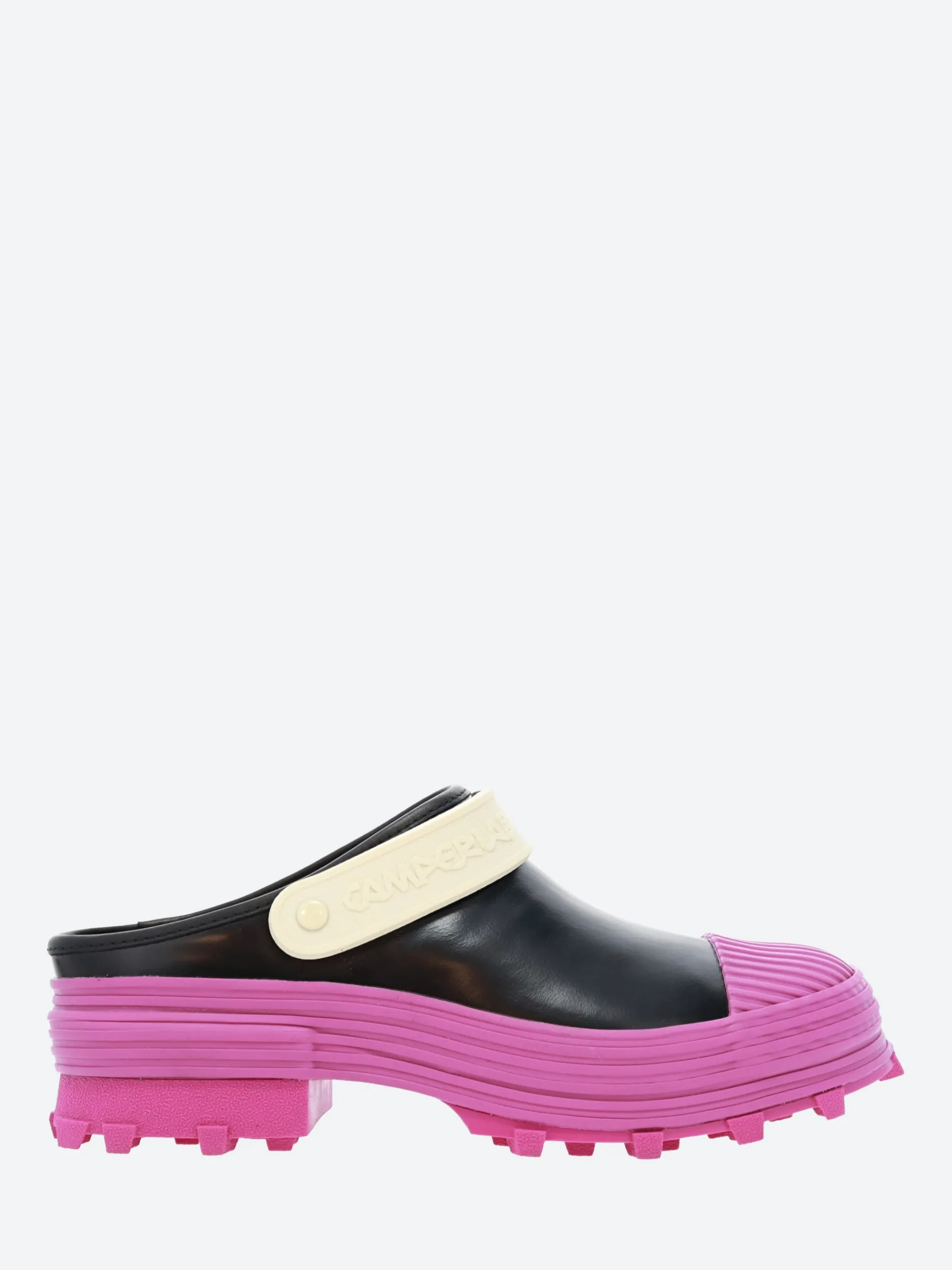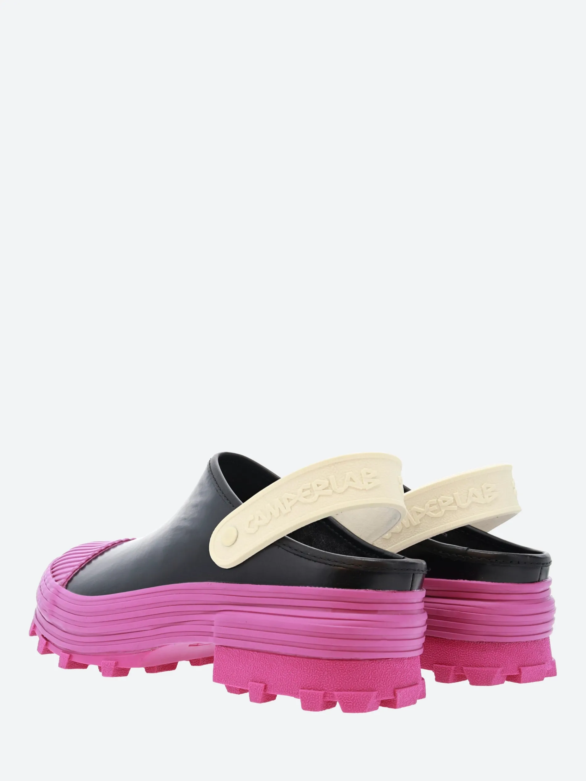 CamperLAB vulcanized leather clogs with slingback straps and toothed rubber outsoles.