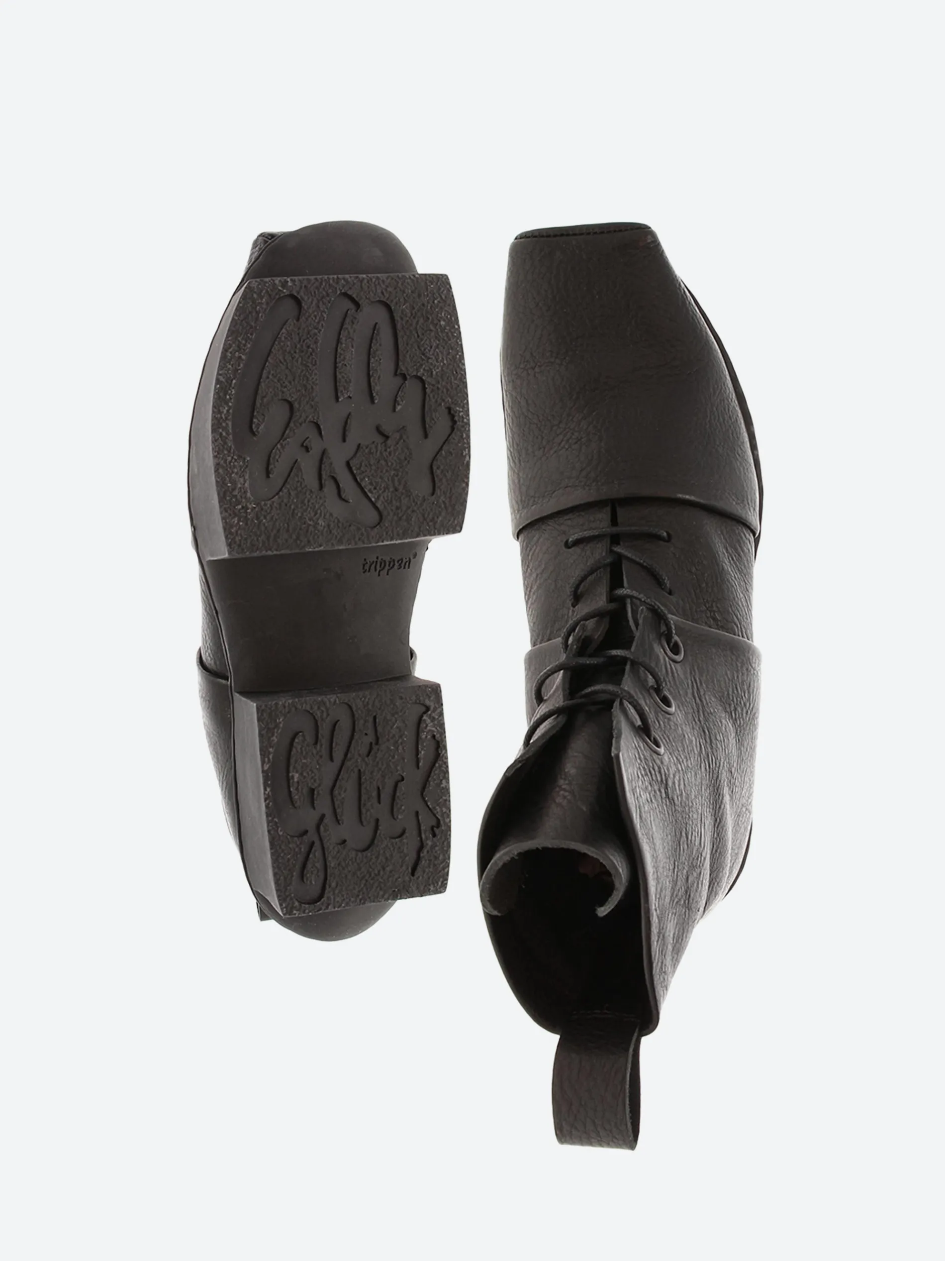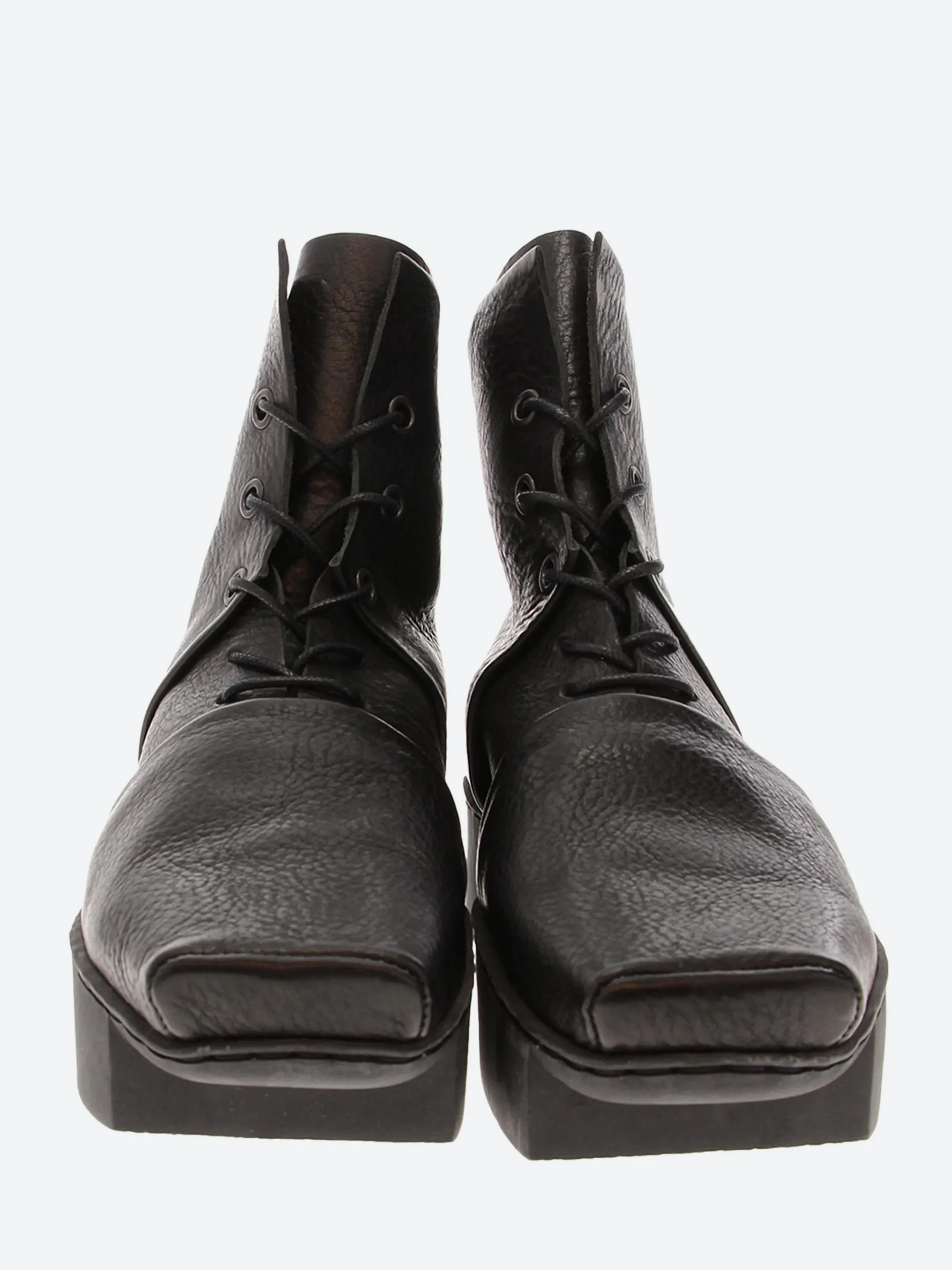 This boot evolves from a padded square toe into a classic lace-up with striking eyelets after a visual break in the middle.