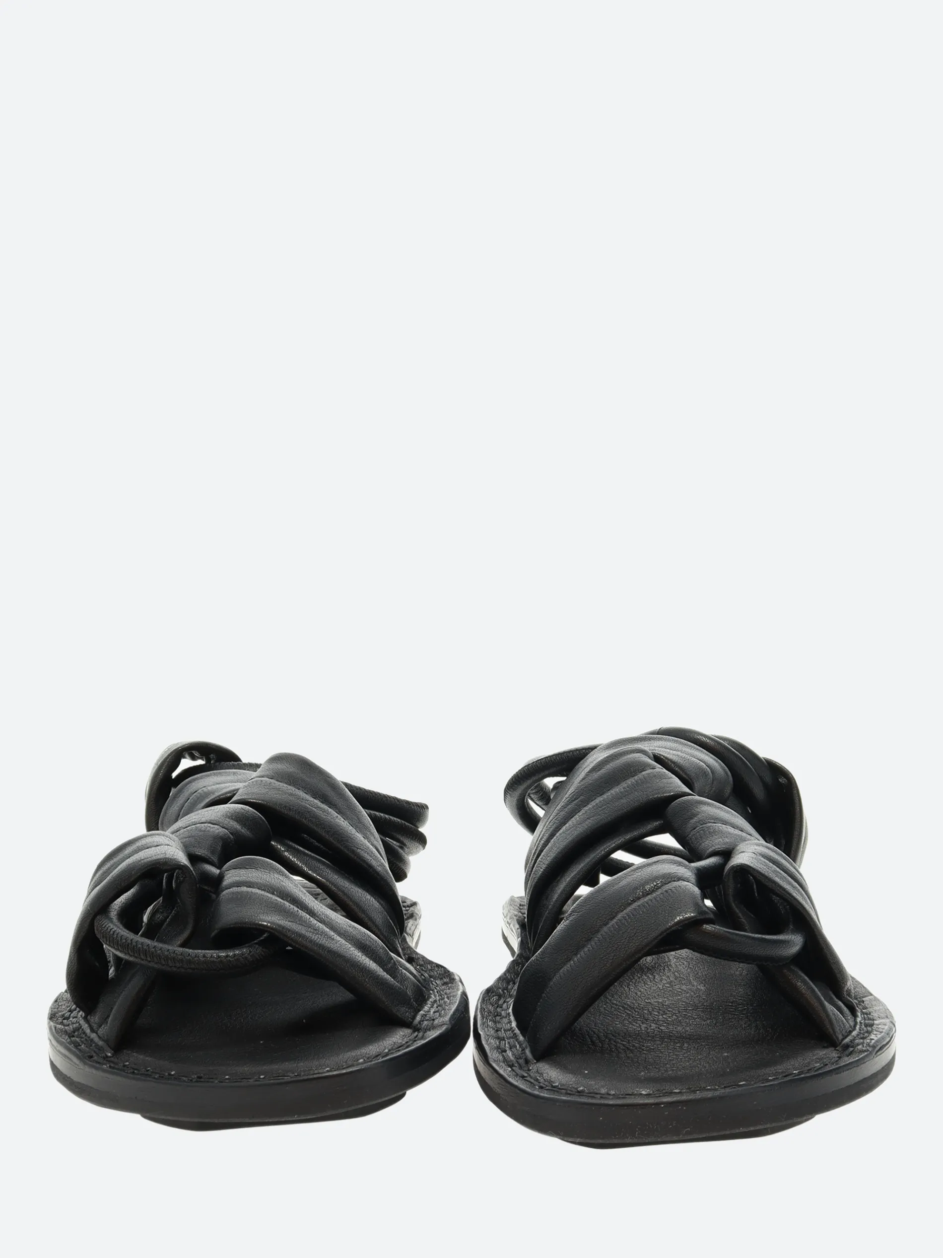 In an asymmetrical curved wave, a leather lace is passed through three soft leather loops on each side and tied up around the ankle.