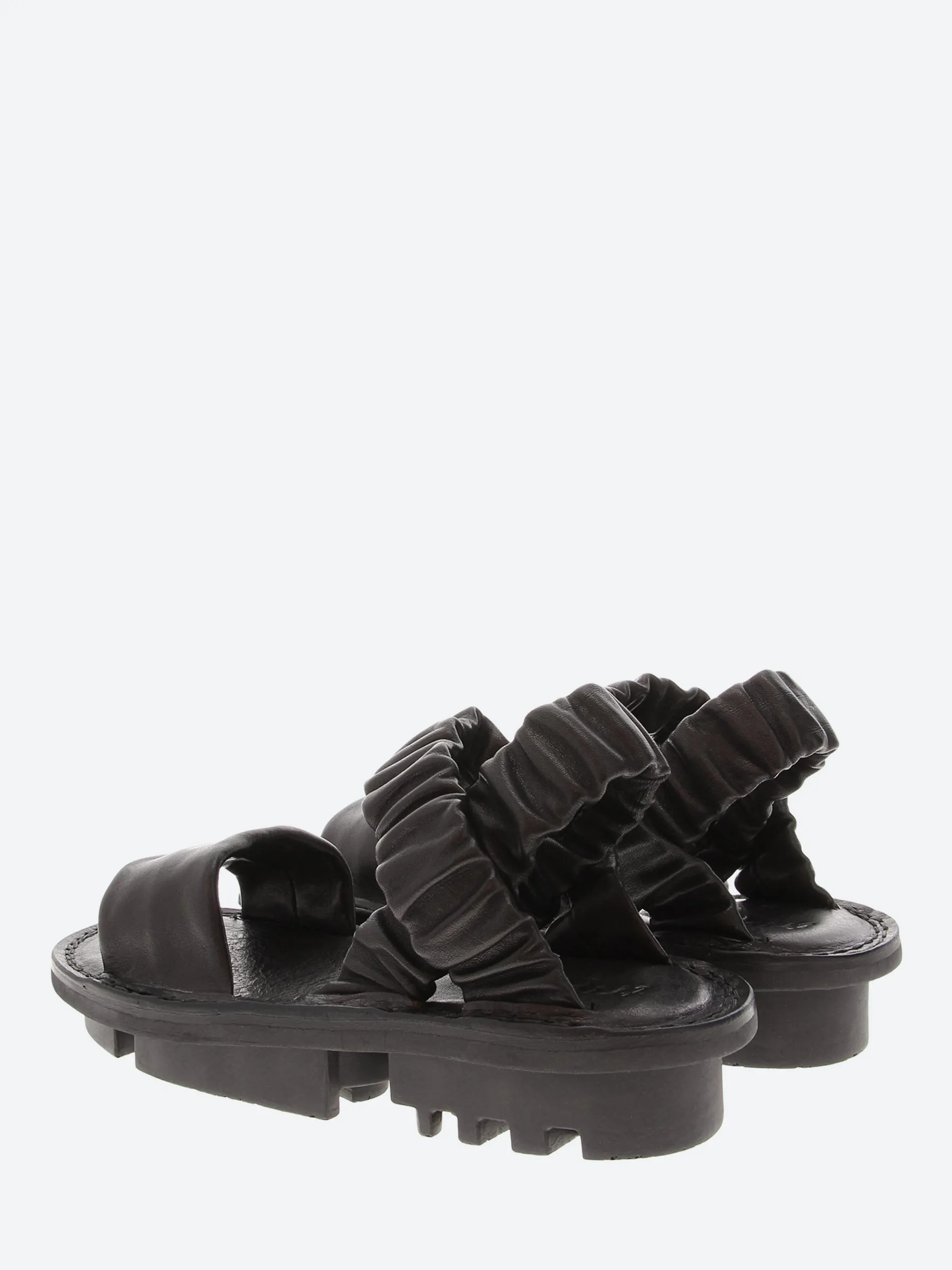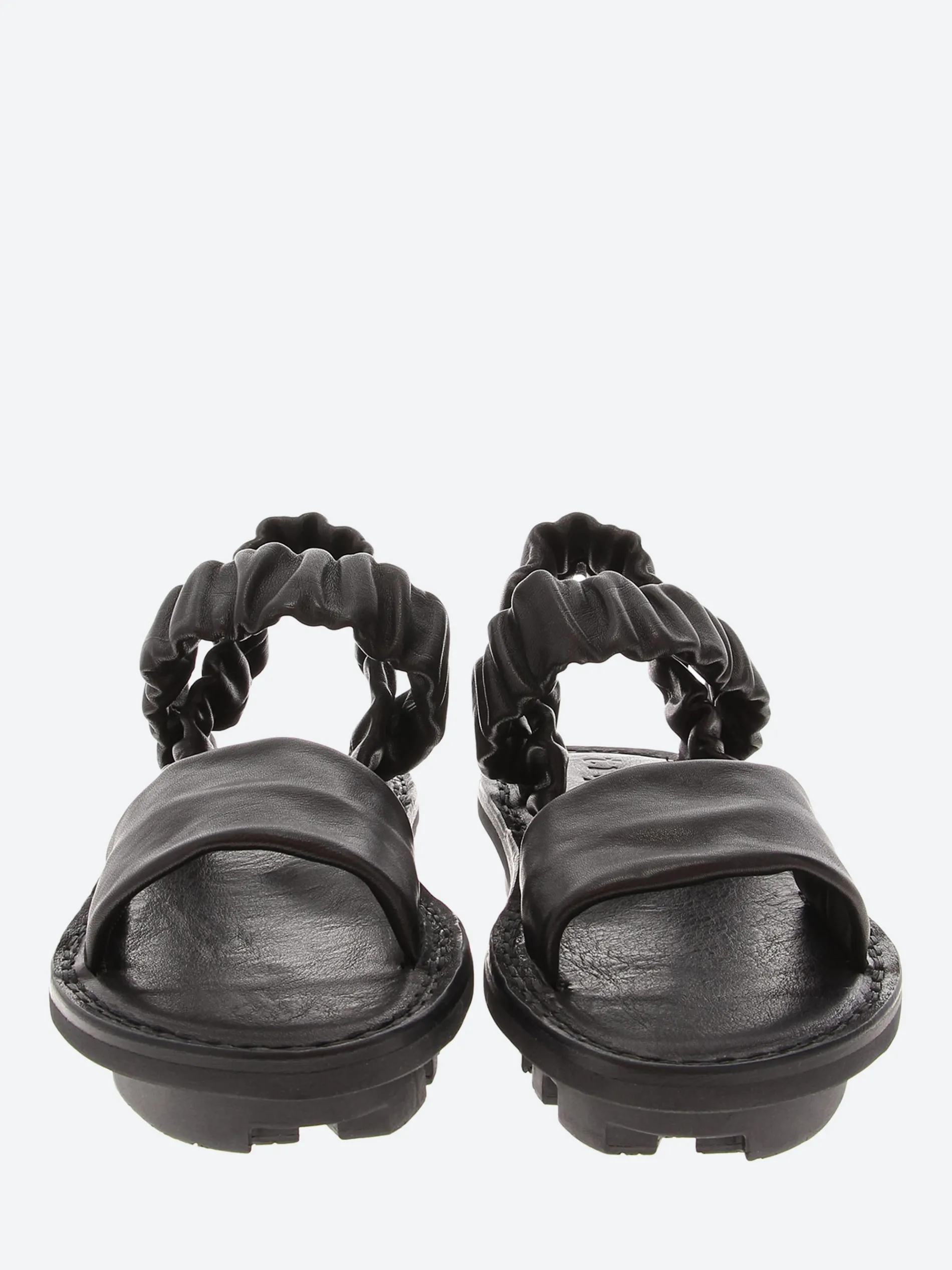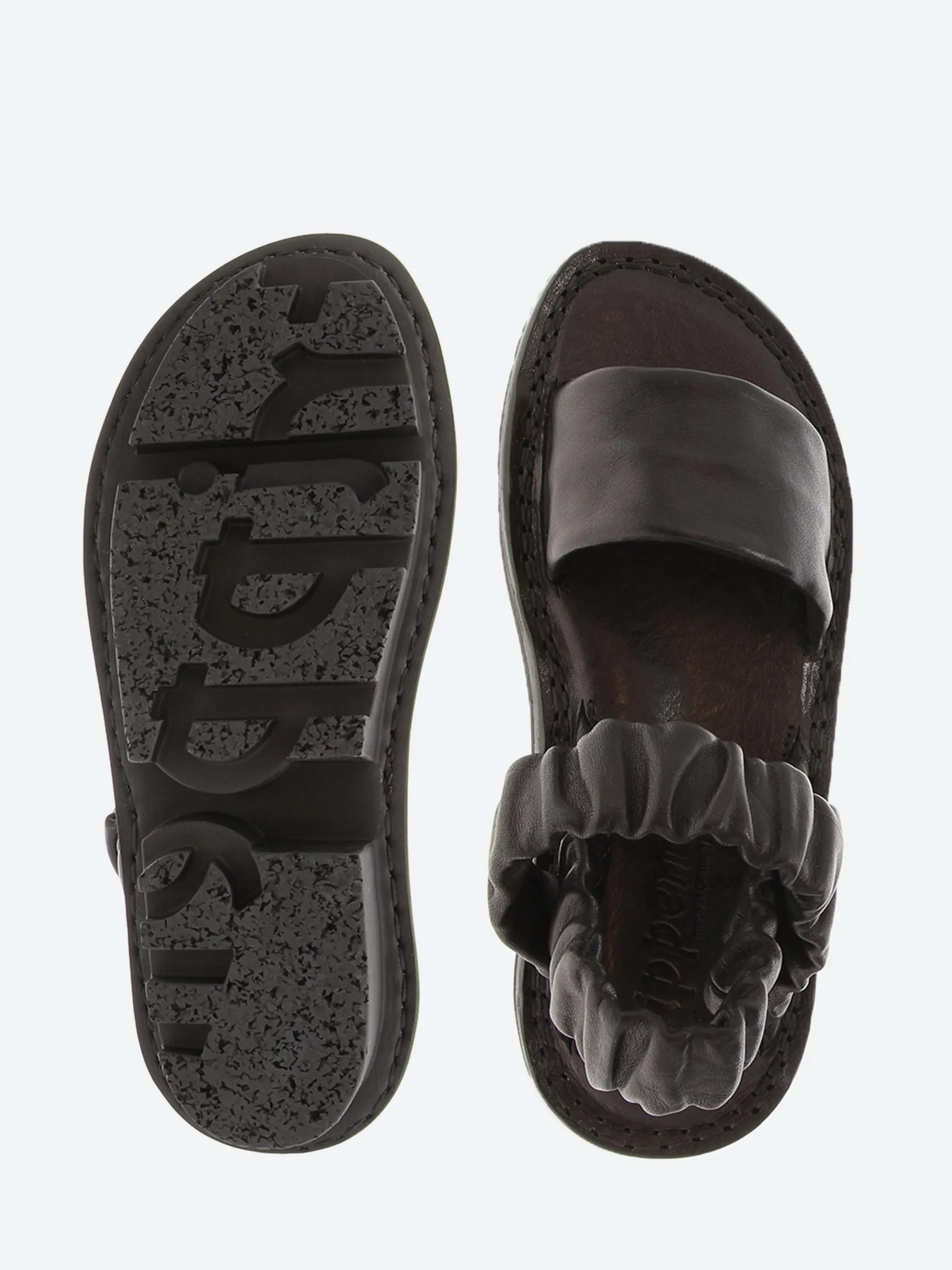Classic sandal with a smooth leather strap across the front of the foot and leather-covered elasticated straps across the instep and heel.