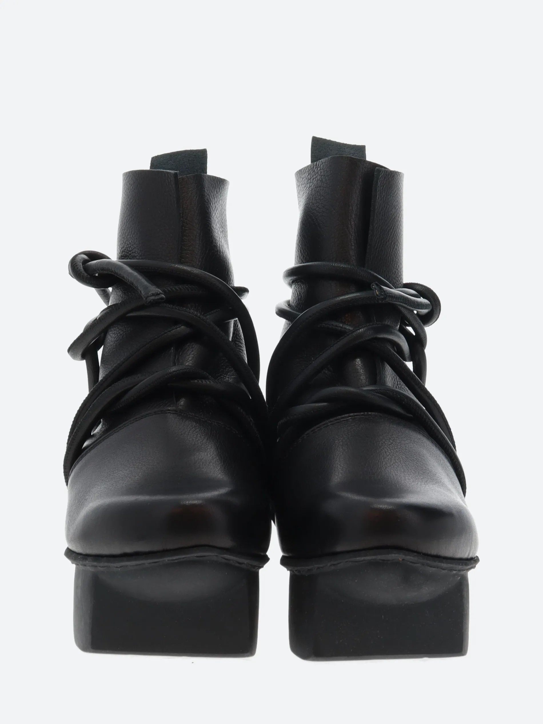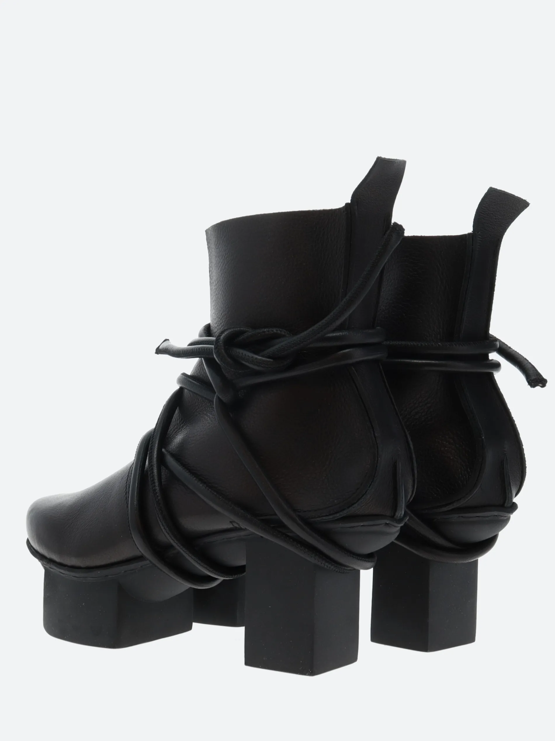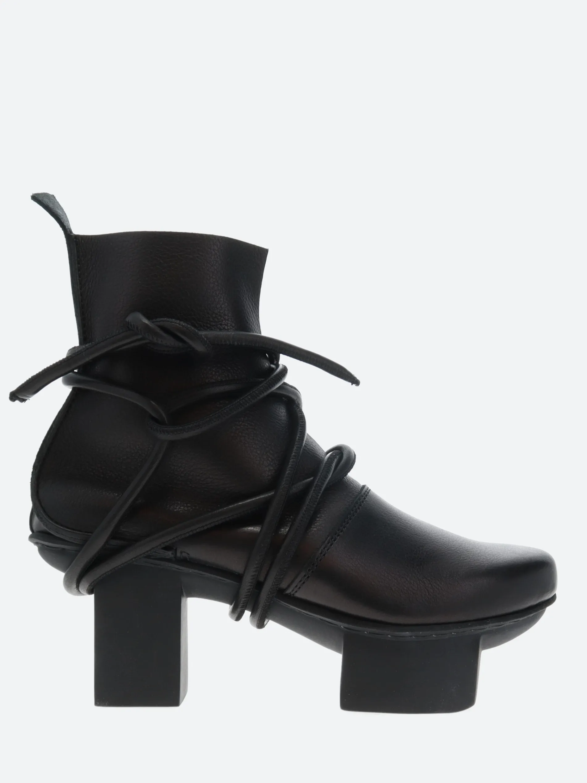 The wide leather cord is wrapped several times around the foot and ankle and fastened with a reef knot. It is riveted on the inside in such a way as to make this ankle boot fully functional despite its unusual appearance.