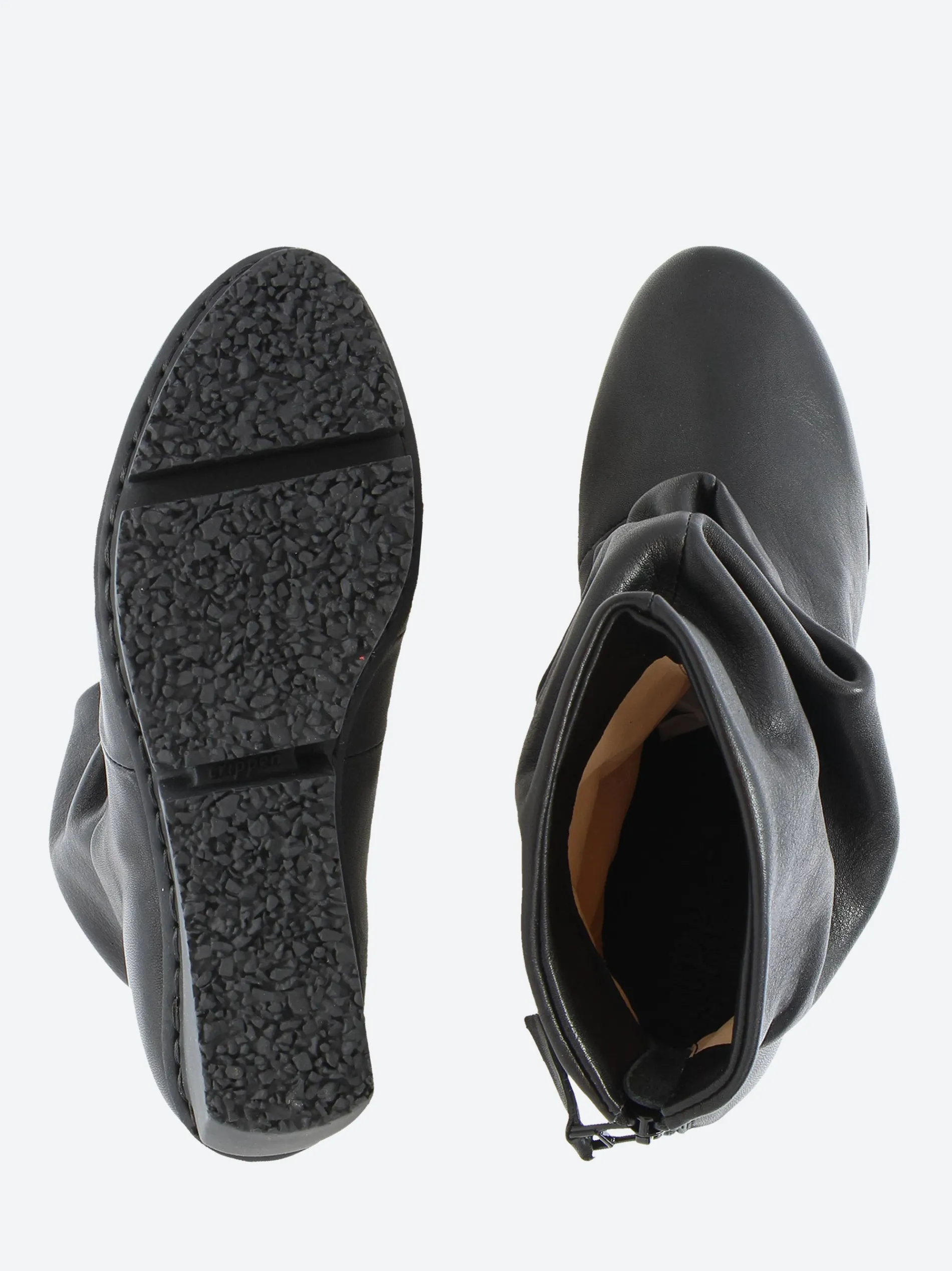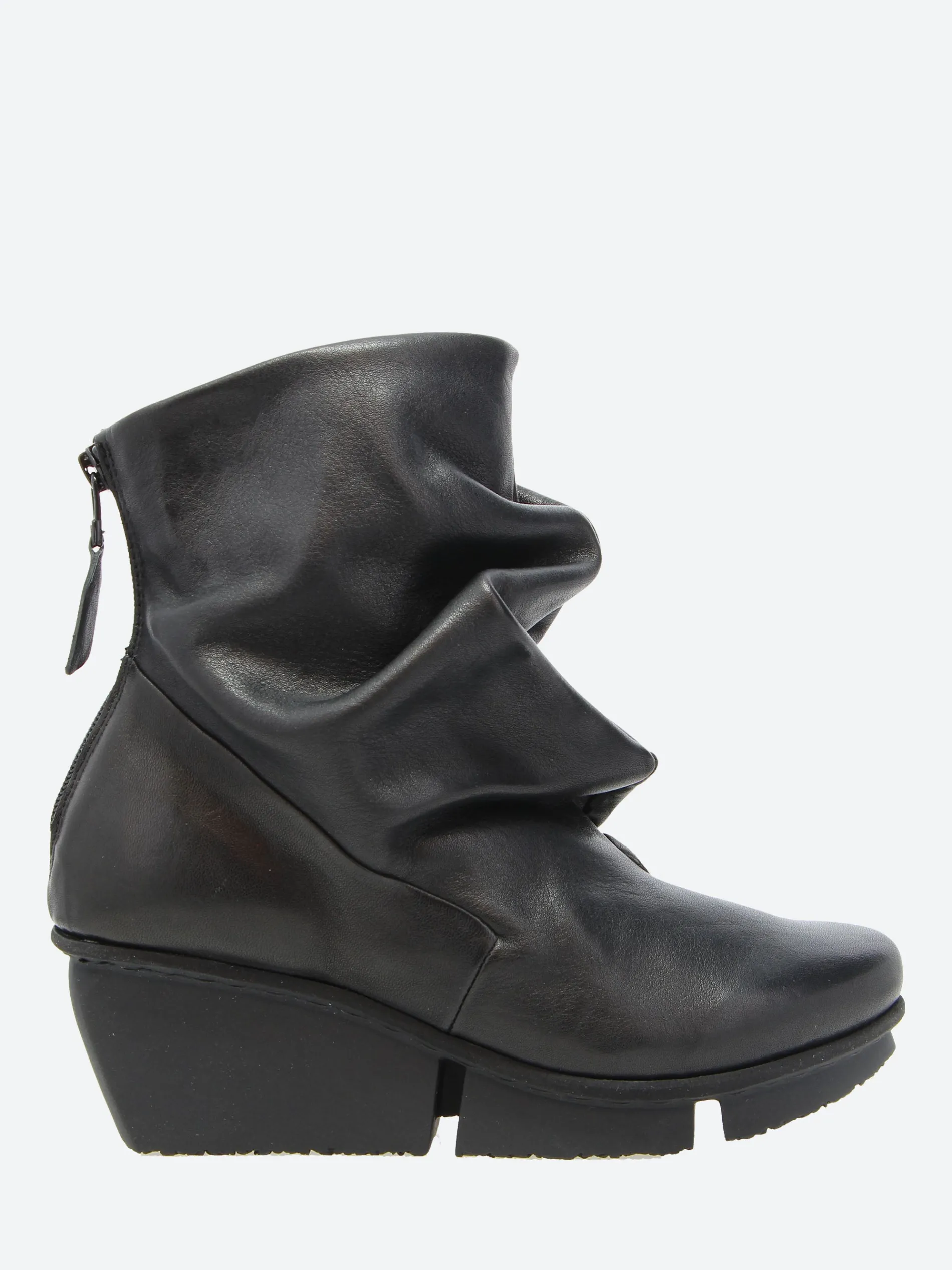 The shape of this casual ankle boot is created by the volume of the soft leather, which folds over the entire front area in gentle waves. The boot fastens with a zipper at the back.
