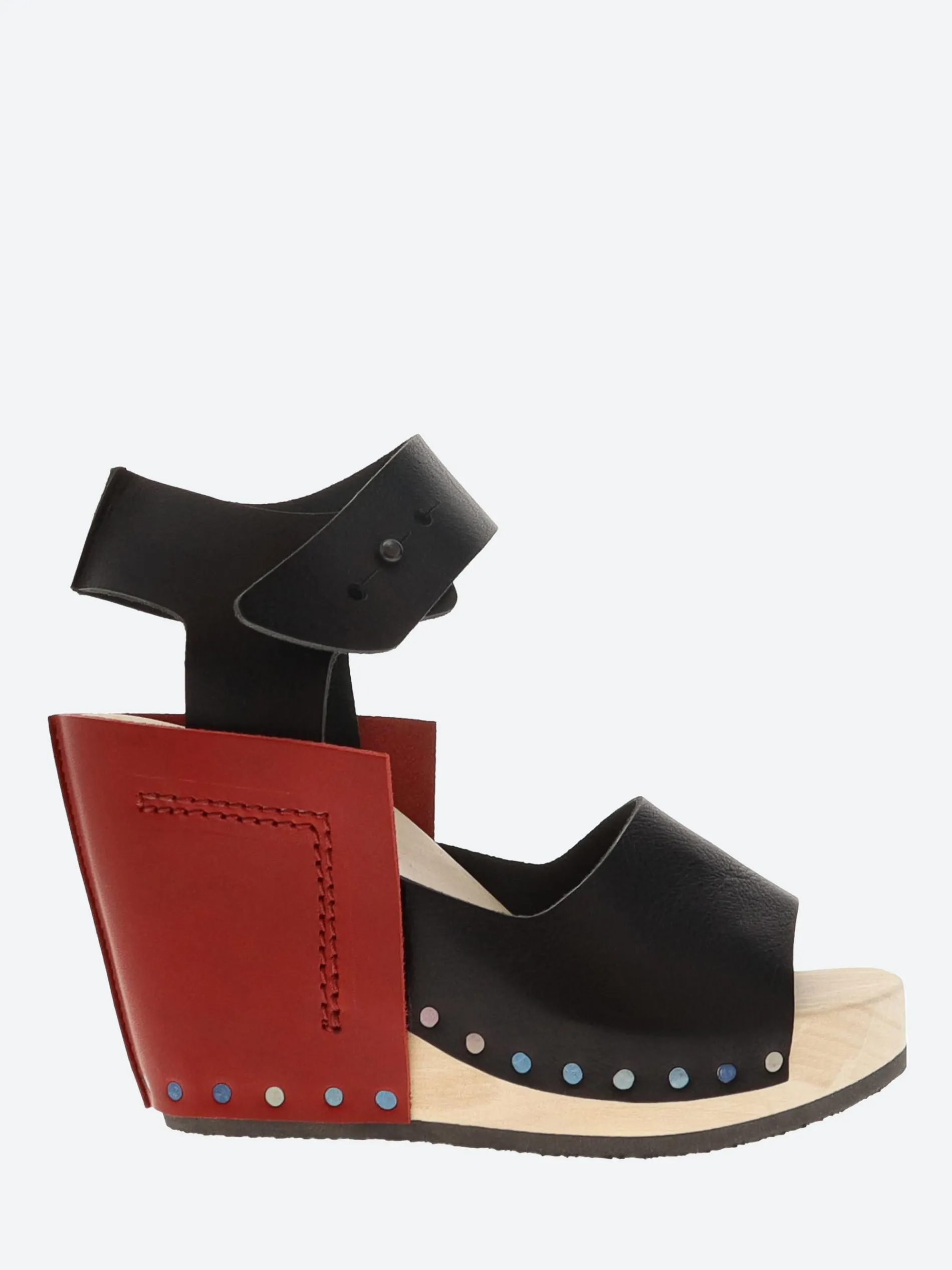 Trippen Wood Stand, this simple sandal on a high wooden sole is characterized by a dominant rectangle of leather wrapped around the heel.