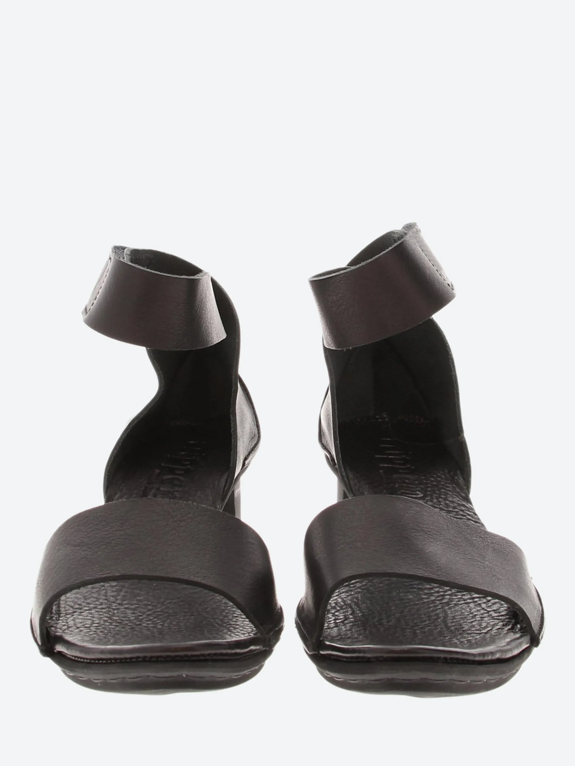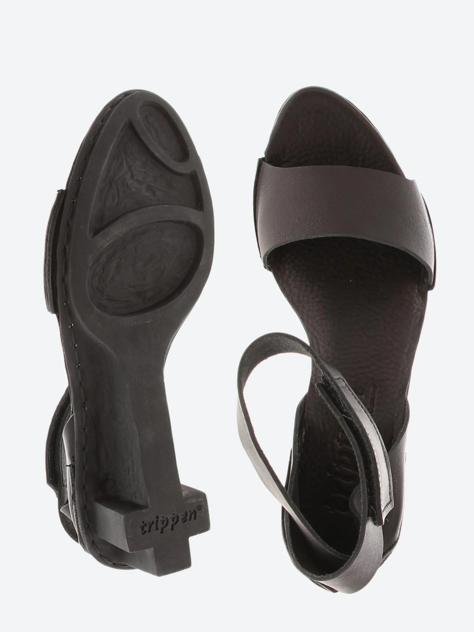 Simple sandal open wide over the toes and closed at the heel with a broad strap running dynamically around the ankle and a Velcro fastening.