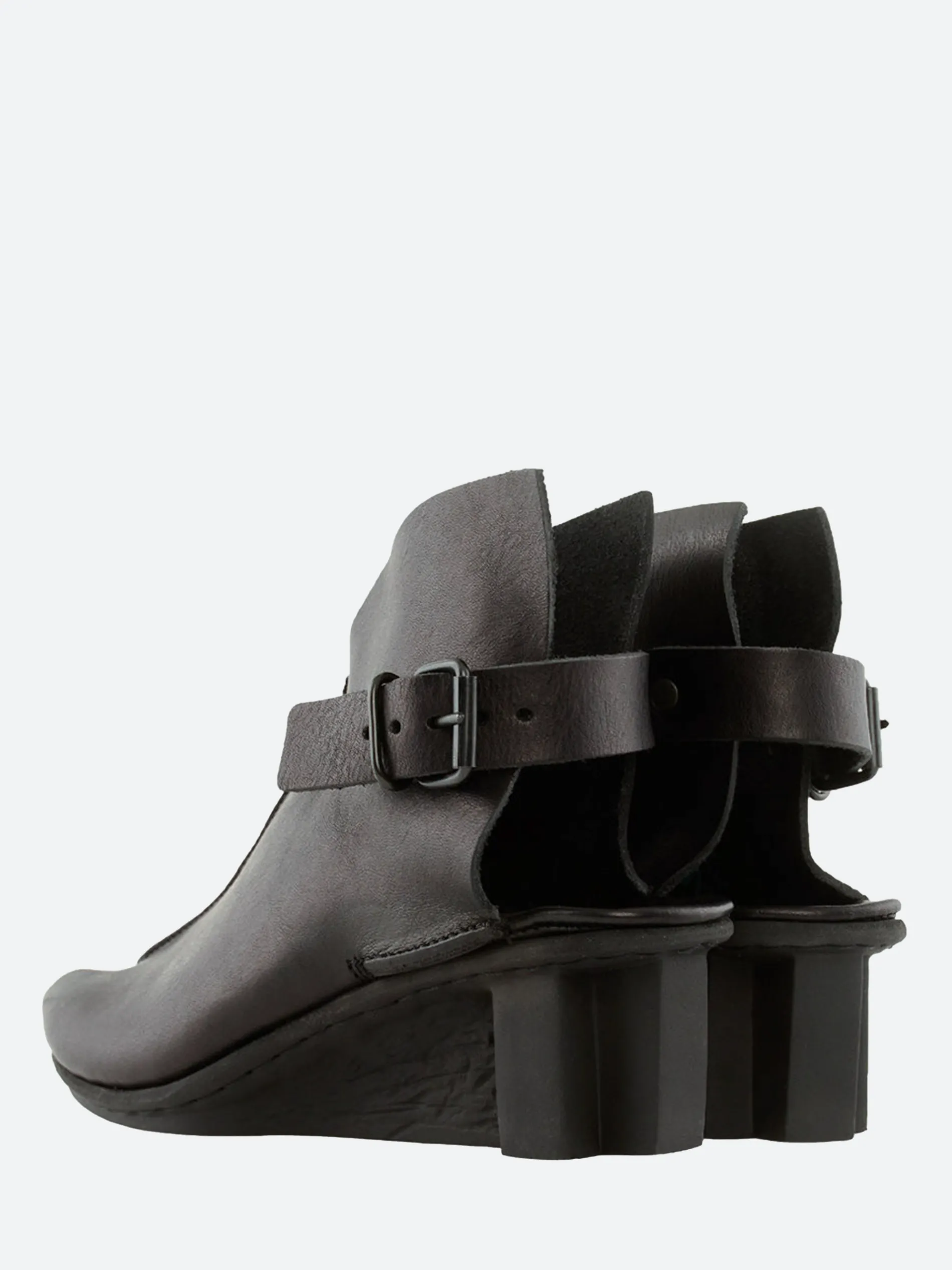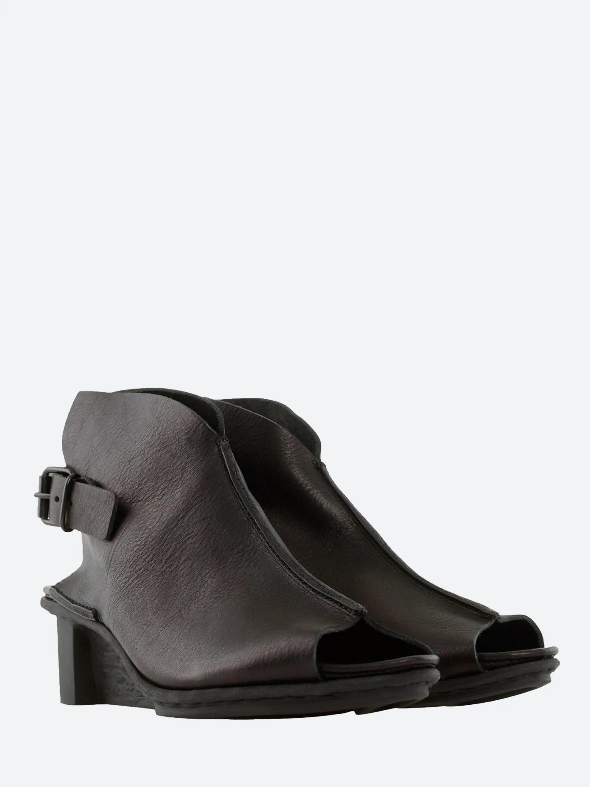 Curved, wing-shaped, high-cut sandal with strap and buckle fastening around the heel.