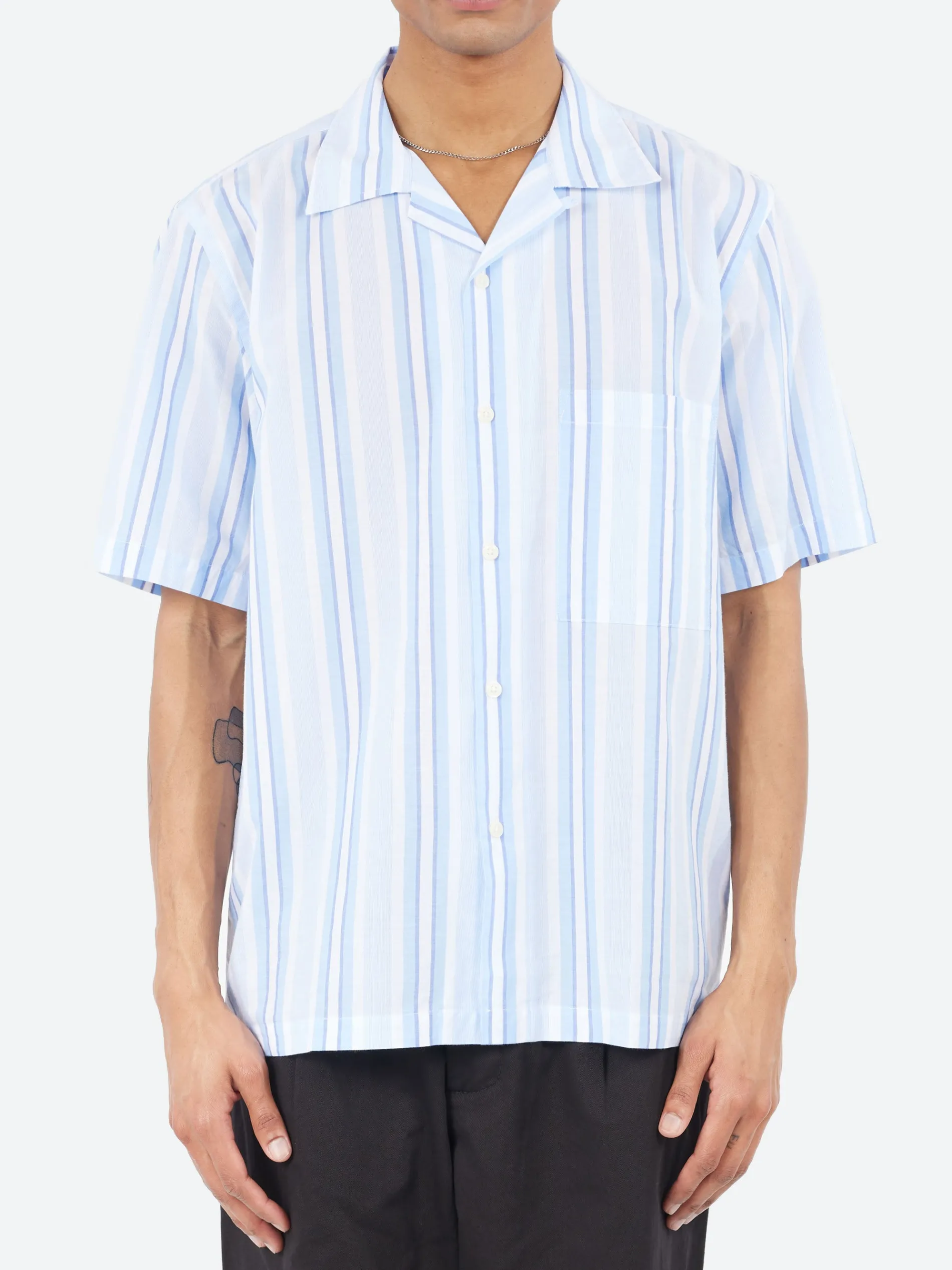 A more spacious and relaxed fit than Universal Works Road Shirt—which lends itself to a slightly larger collar too. With a loop-close top button, which looks great worn open-necked for a laid-back look. This also has a slightly elongated hem at the back with a side split, and a square pocket on the chest.