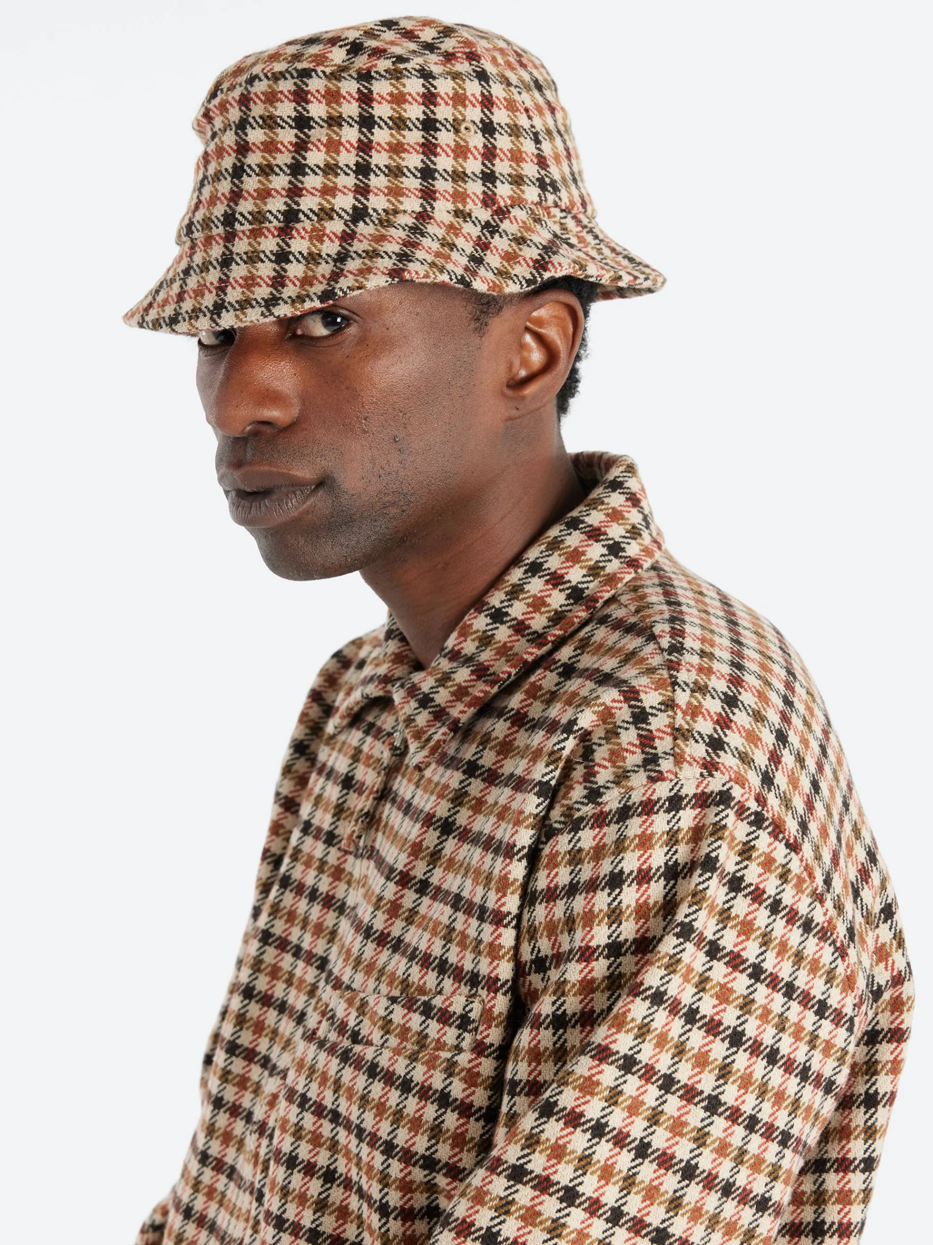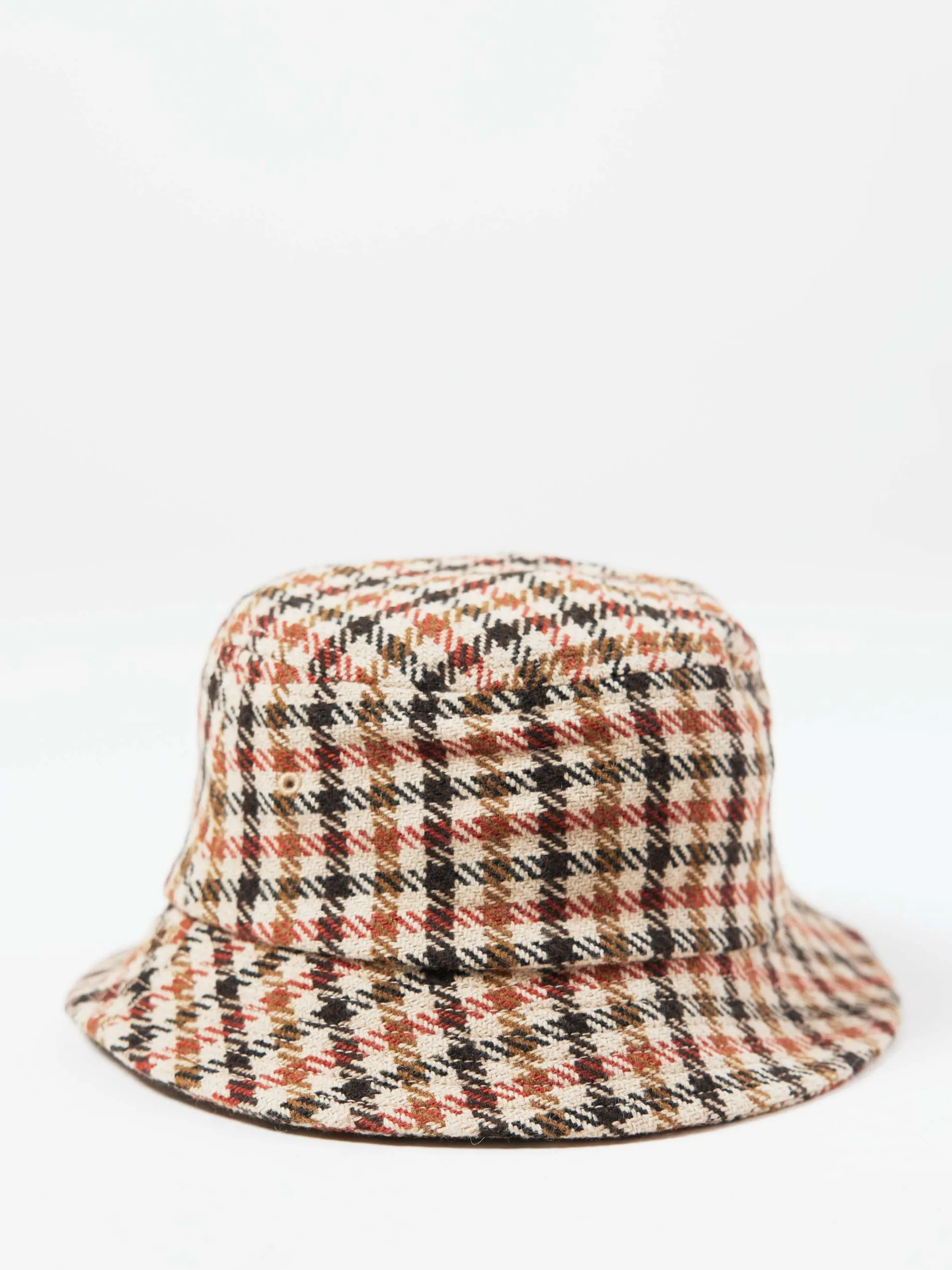 A short-brimmed bucket hat, with embroidered eyelets. Made from a chunkier, thicker houndstooth in a four-color palette.