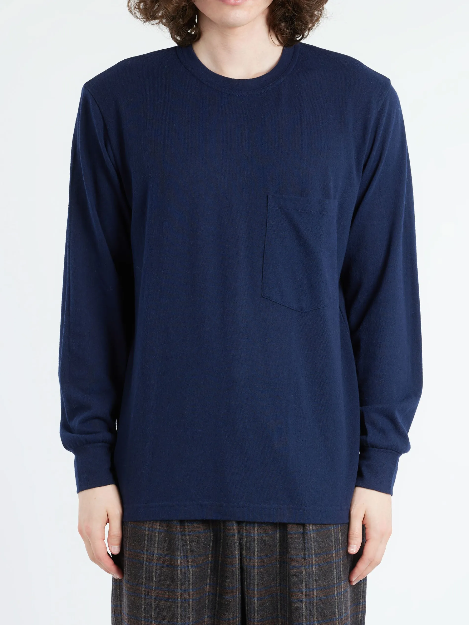 A loose cut, long sleeve t-shirt for an easy wear. Side split hem enables a slightly dropped rear hem, self-fabric cuffed sleeves and a front patch pocket.