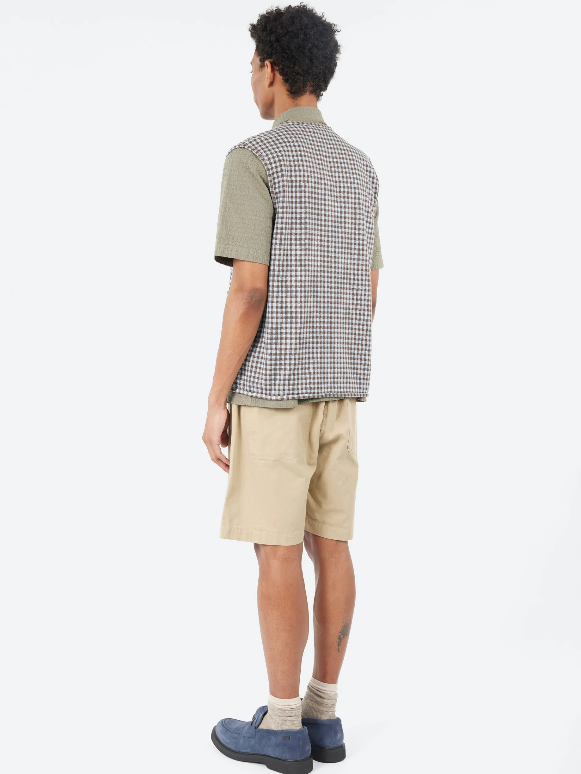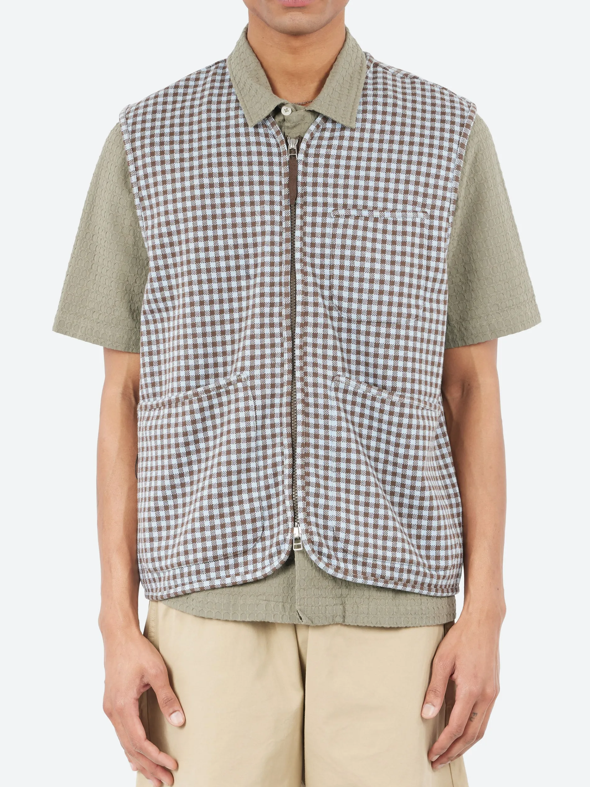 The Universal Works gilet offers a loose fit with a straight cut, featuring a two-way zip for added versatility and styling options. It also includes two angled lower patch pockets and a single chest patch pocket for practical storage and a stylish finish.