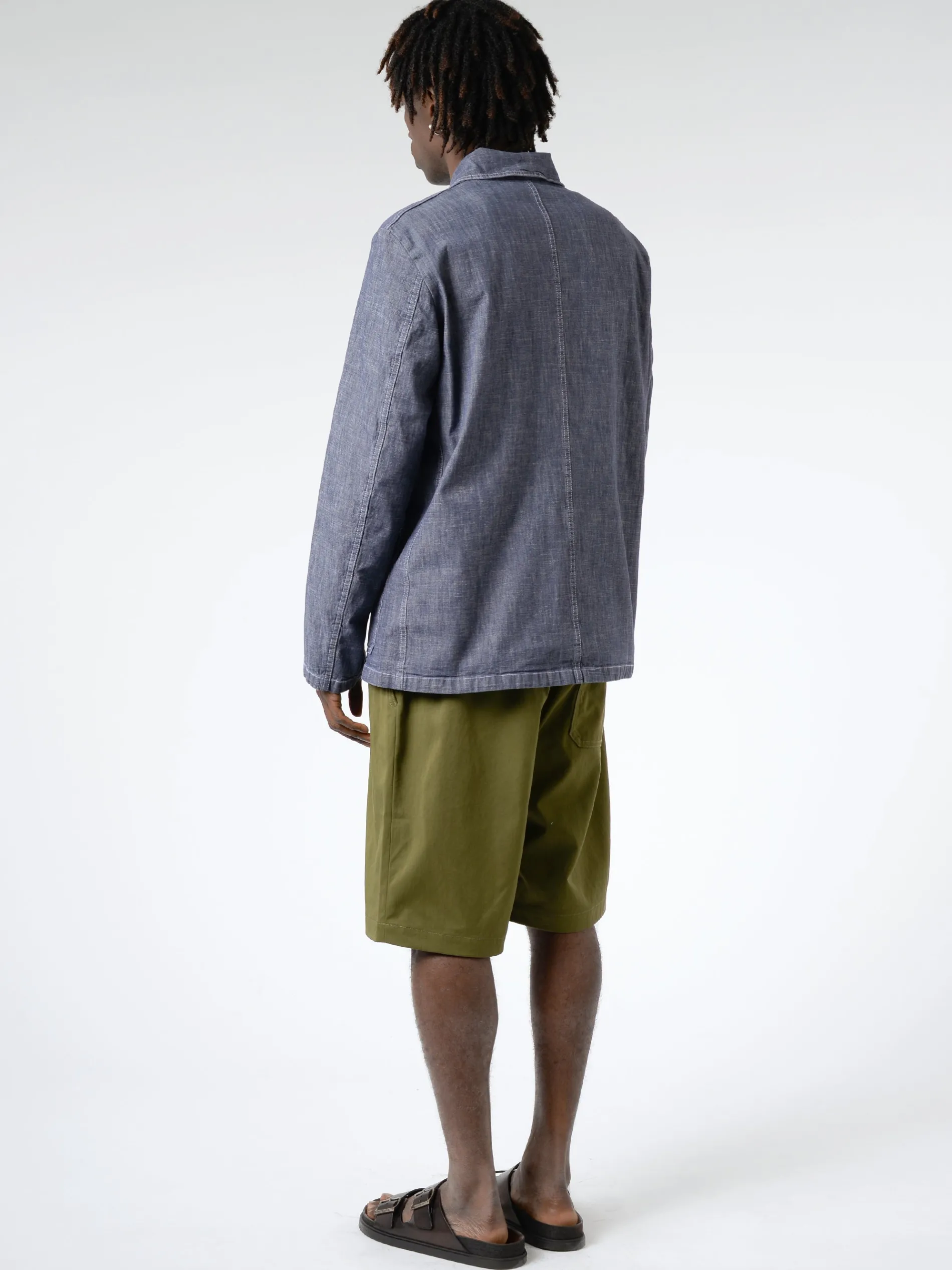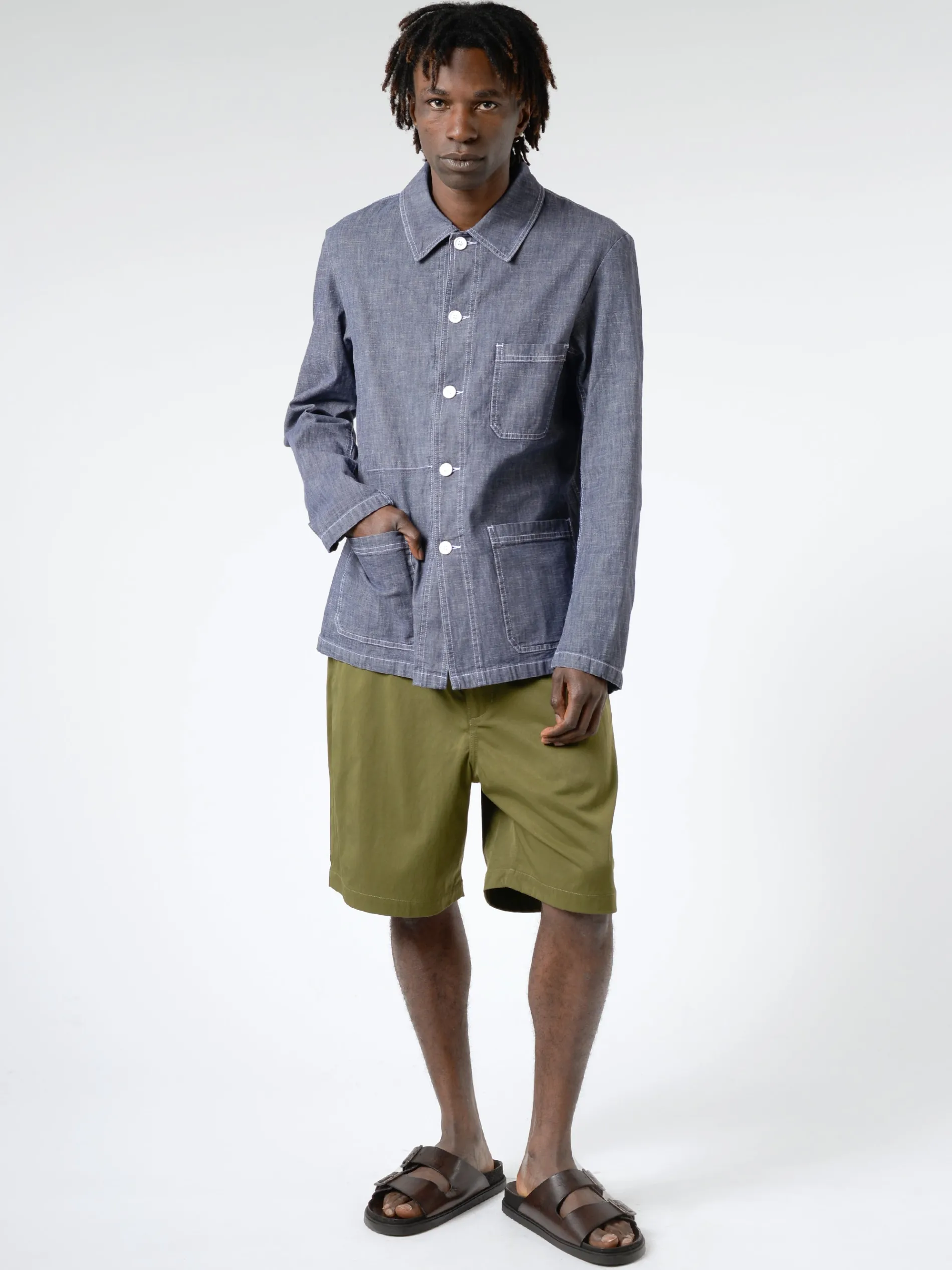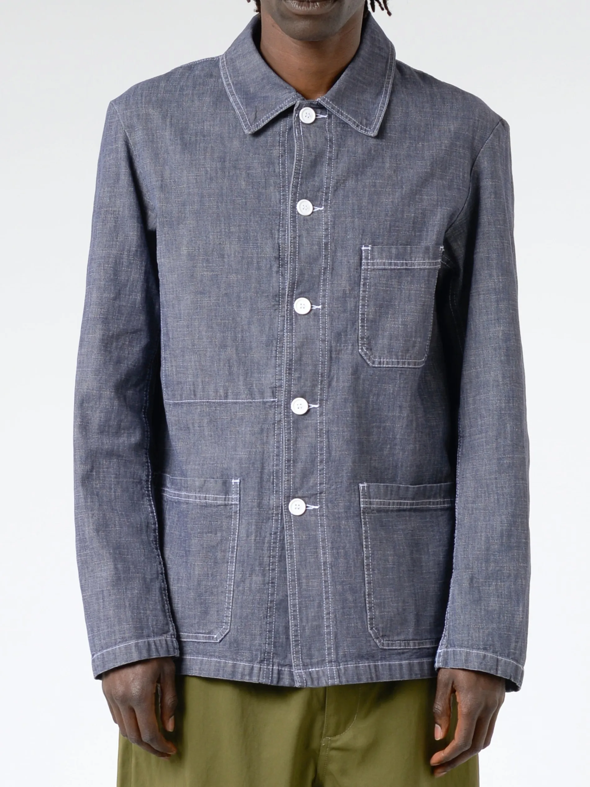 A classic French workwear jacket made from cambric fabric with white stitching. This fabric is made in Cambric, a genuine fabrics formerly originating from Cambrésis and weaved with linen by mulquiniers workers.