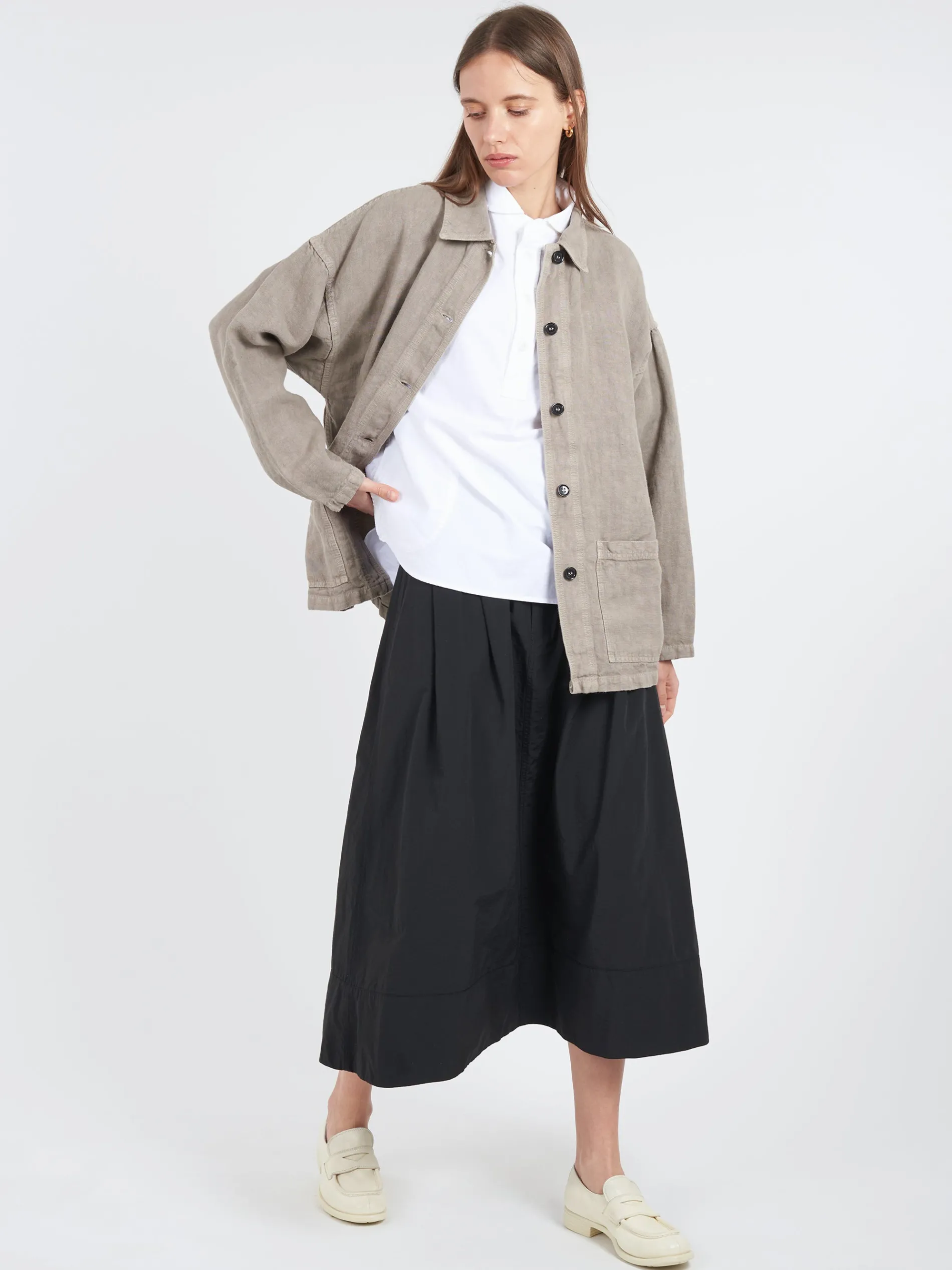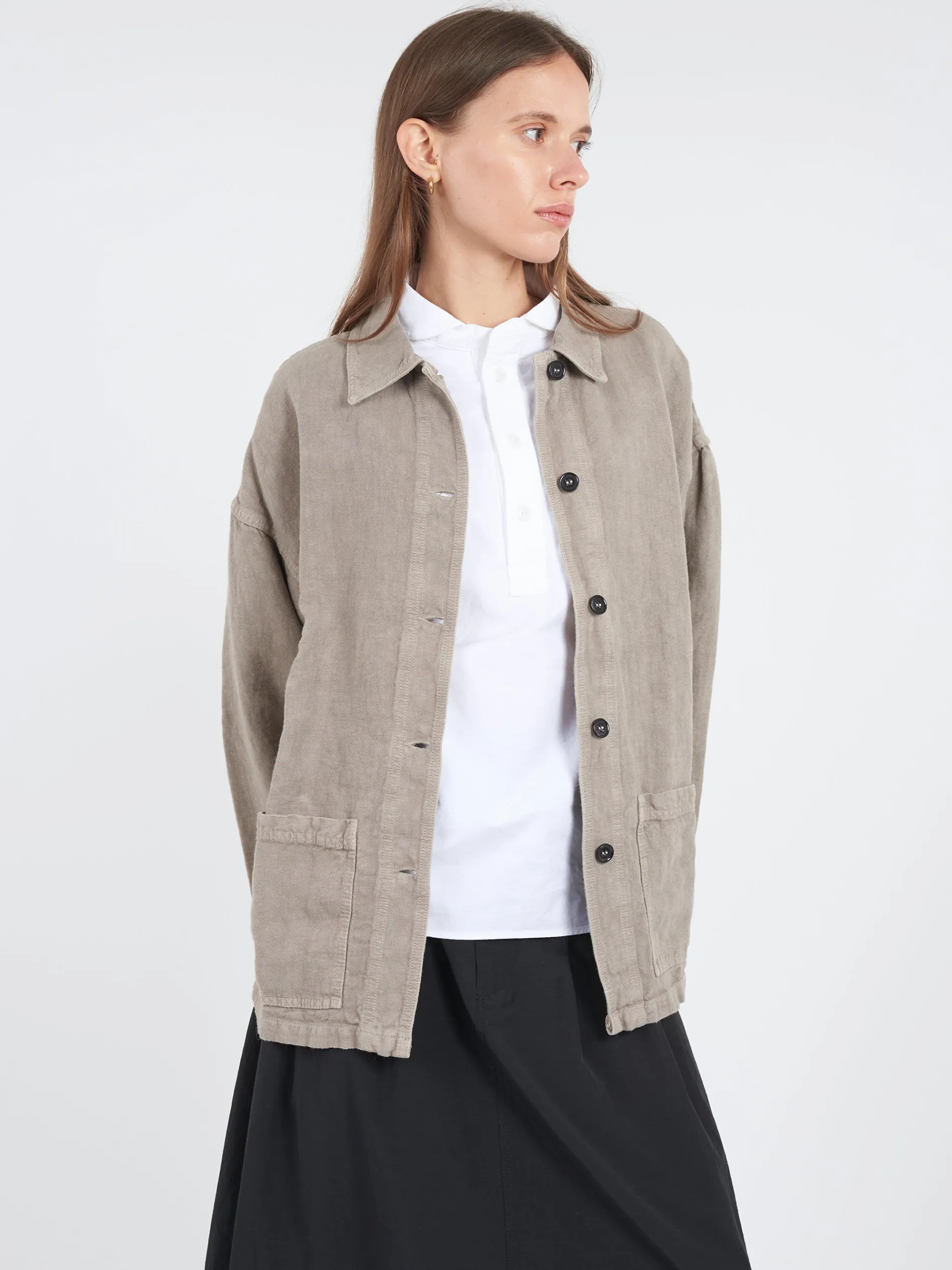 Vetra oversized workwear jacket in overdyed heavy linen canvas, the brand’s specialty vintage-like cloth.