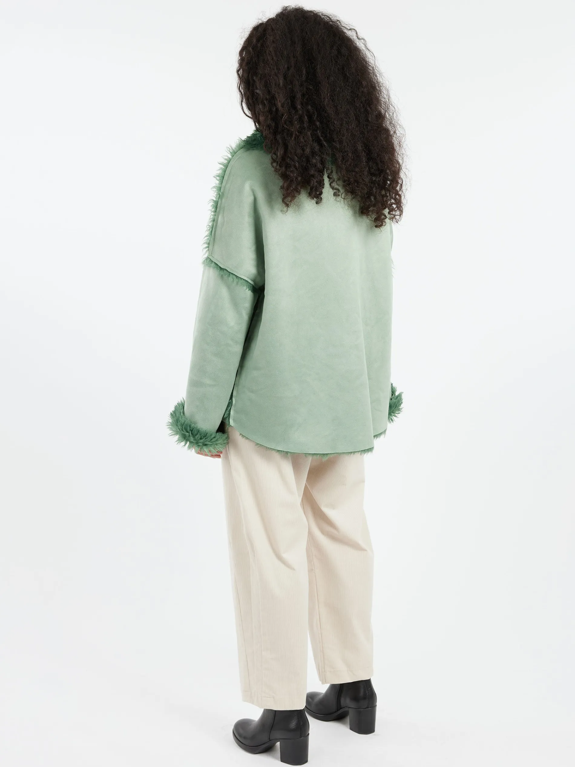 This jacket features a smooth design with faux shearling accents and lining, creating an effortlessly stylish aesthetic.