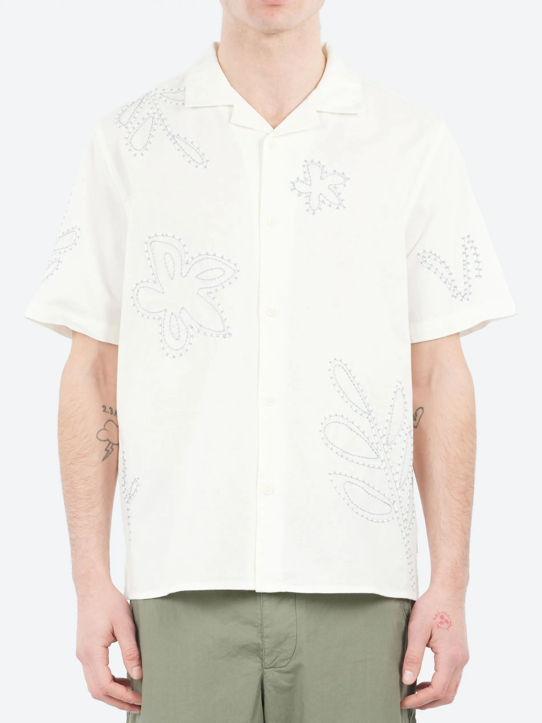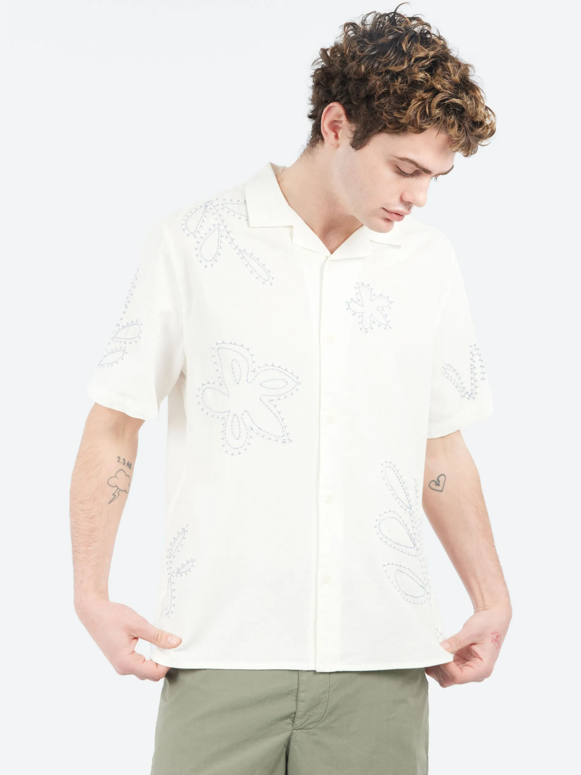 Wax London staple Didcot short-sleeve shirt makes a triumphant return for SS25. Cut for a relaxed, breezy fit, this version is made from a breathable cotton blend and showcases a raised pale blue fine cord embroidered floral design.