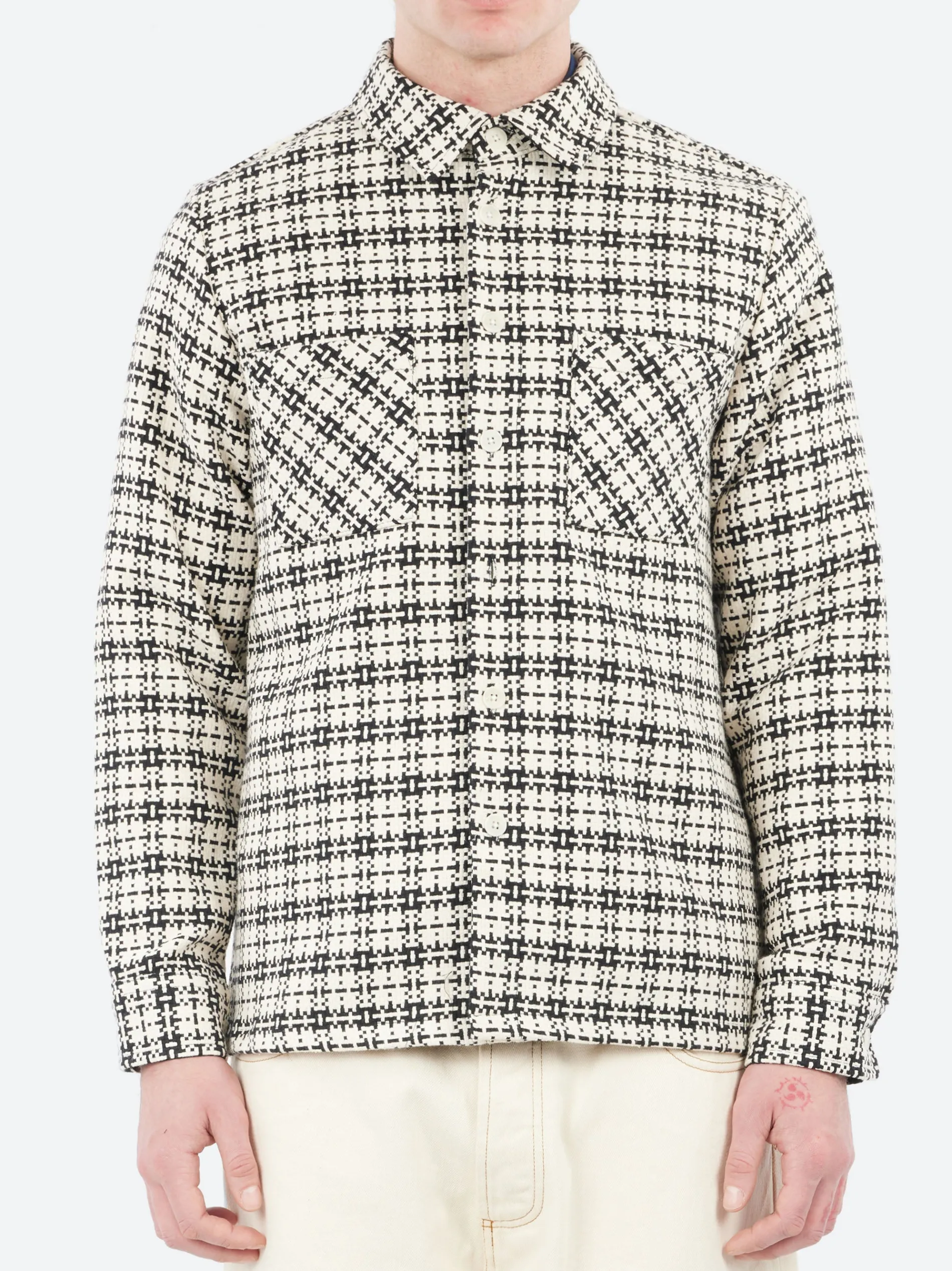 The Wax London signature piece. The Whiting, a year-round staple, returns in a new yard check woven design that mixes black and ecru yarns. This fabric is made sustainably by a family-run French mill using recycled cotton and features environmentally-friendly Corozo nut buttons and front patch pockets.