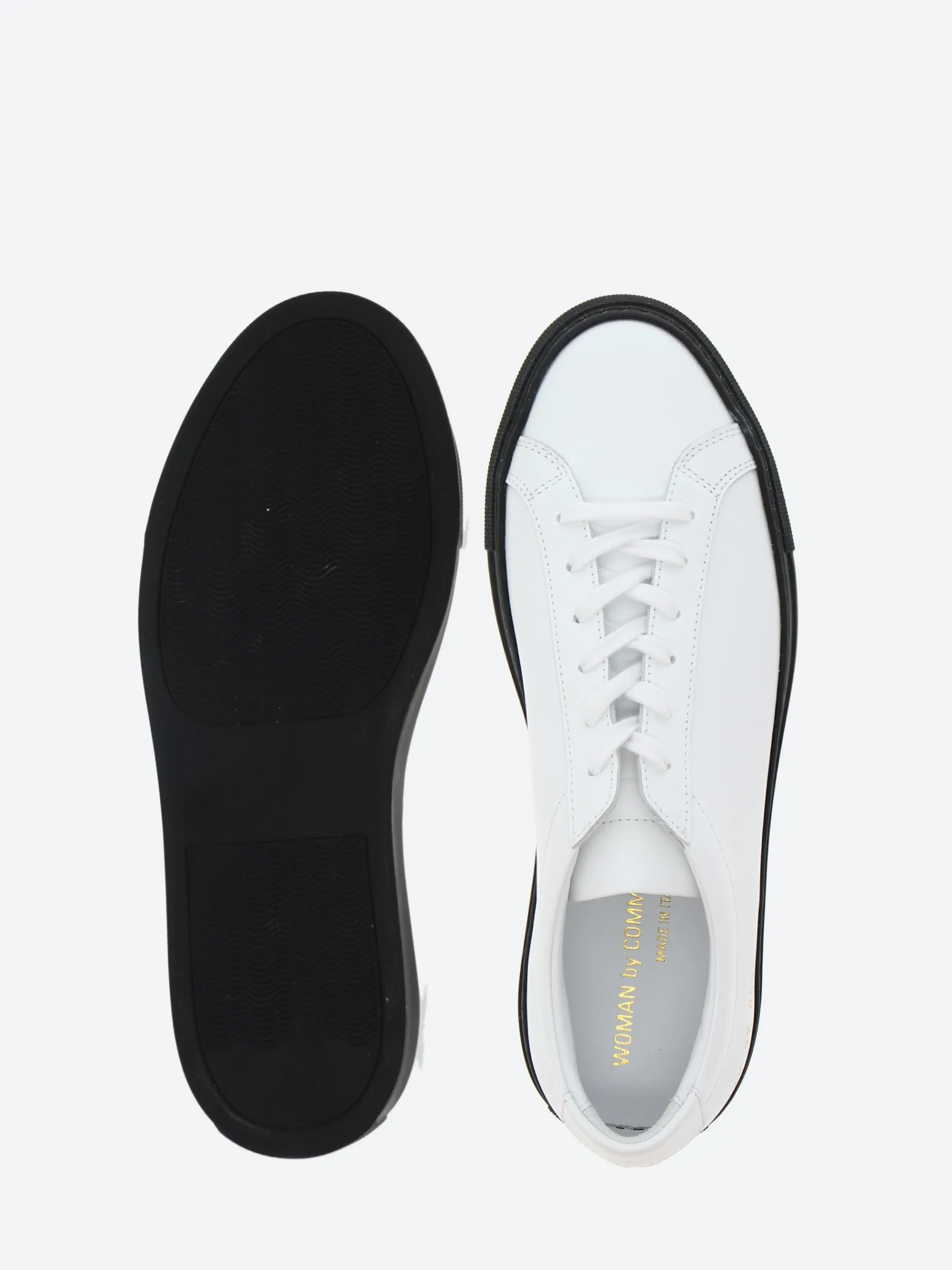 Woman by Common Projects Achilles is the original Common Project style. Using top grain leather for the upper and a full leather lining makes this a luxury Italian made sneaker. The clean lines and minimal gold branding make for a modern take on a classic tennis shoe.