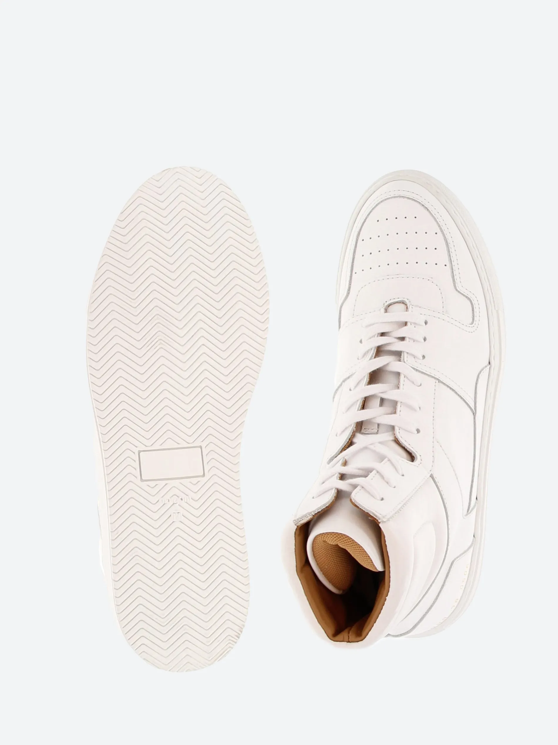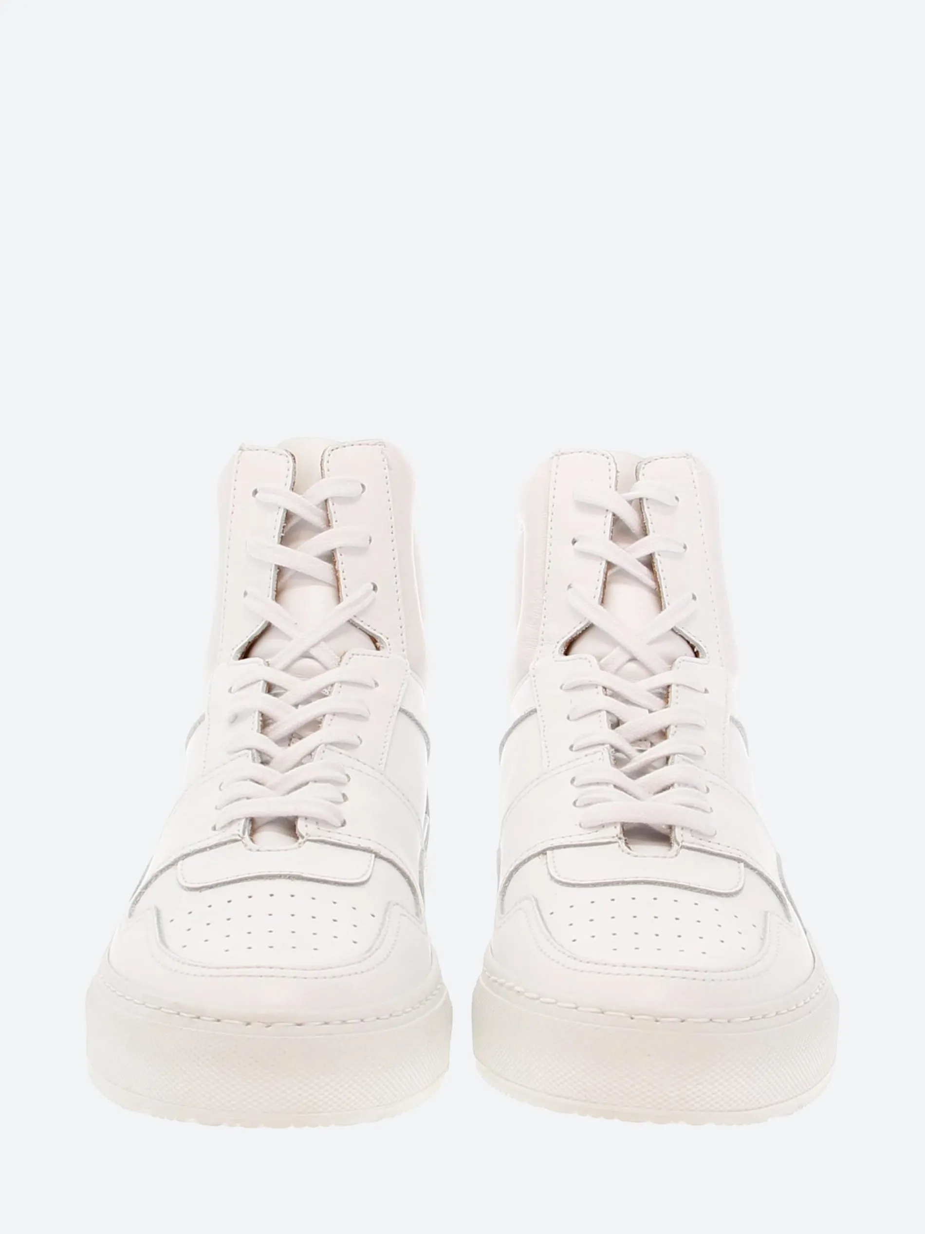 Woman by Common Projects lace-up high top sneaker. Using top grain leather for the upper and a full leather lining makes this a luxury Italian made sneaker. The clean lines and minimal gold branding exemplify everything the brand stands for.