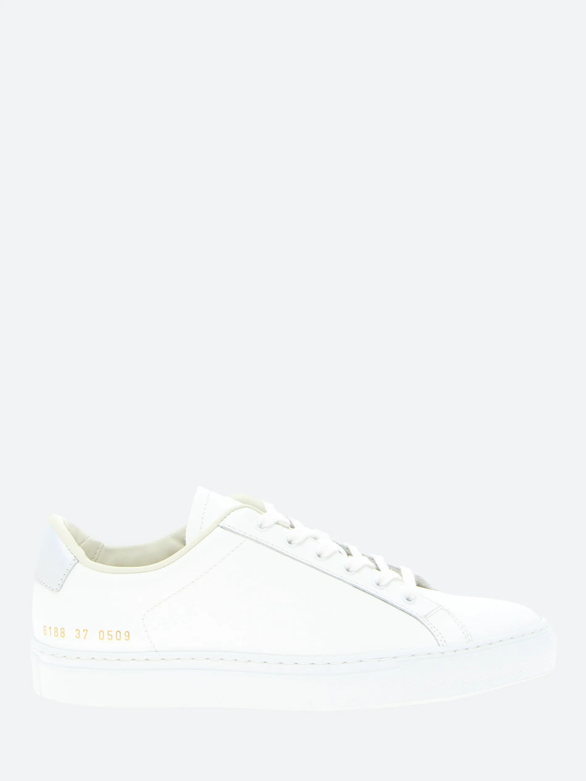 The Retro Classic sneakers by Common Projects feature a timeless low-top silhouette with the brand’s signature foiled motif on the sides. These minimalist sneakers are crafted from supple leather with a polished finish. The contrasting heel cap adds a touch of distinction. Made in Italy, these sneakers combine comfort and high-end craftsmanship for a standout look.