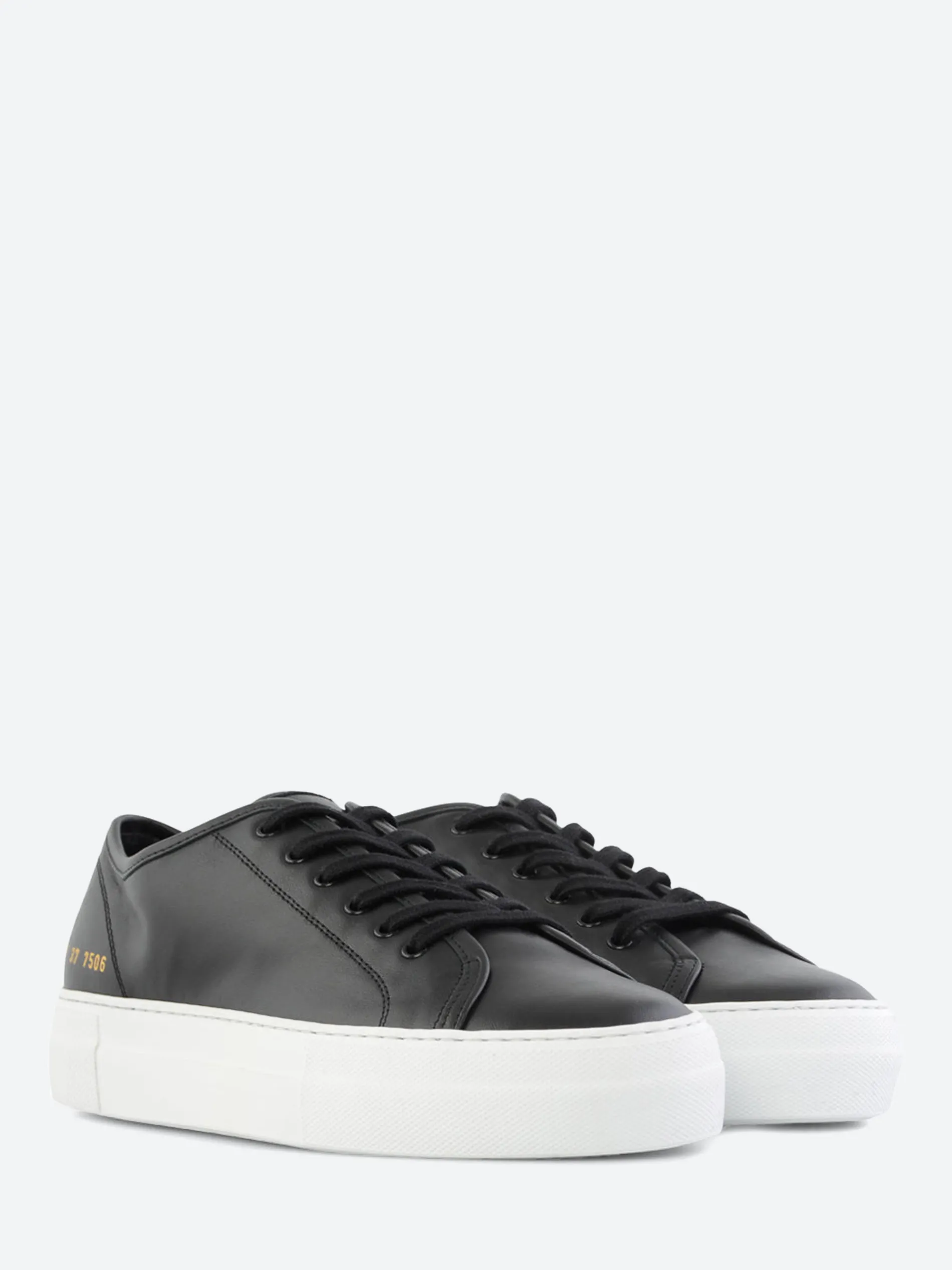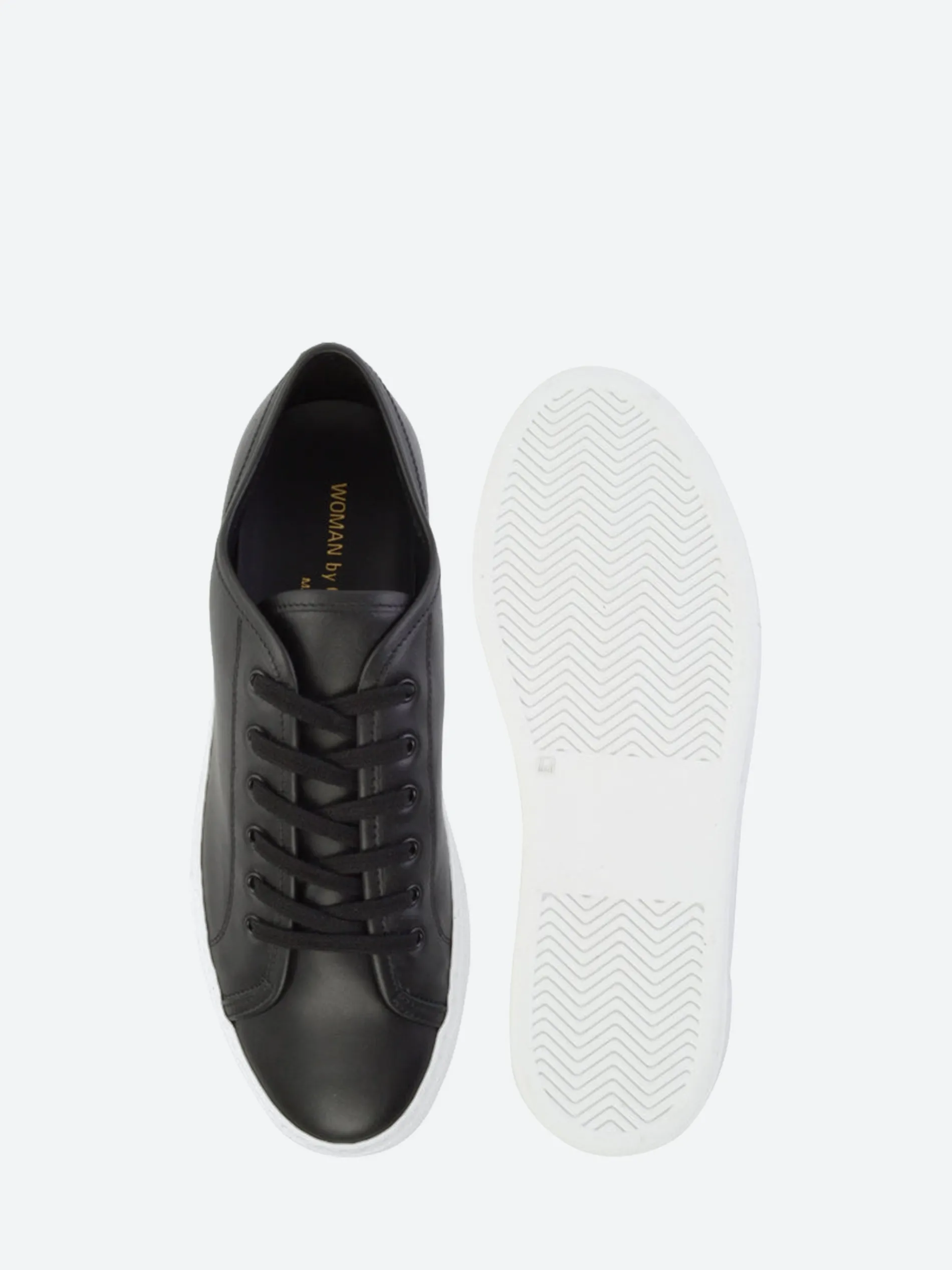 Woman by Common Projects Tournament Low takes cues from some of the most iconic sport footwear. Constructed from Italian nappa leather and leather lined. Features tonal stitching and finished with their signature gold-stamped serial number. Classic sneaker in Italian craftsmanship.