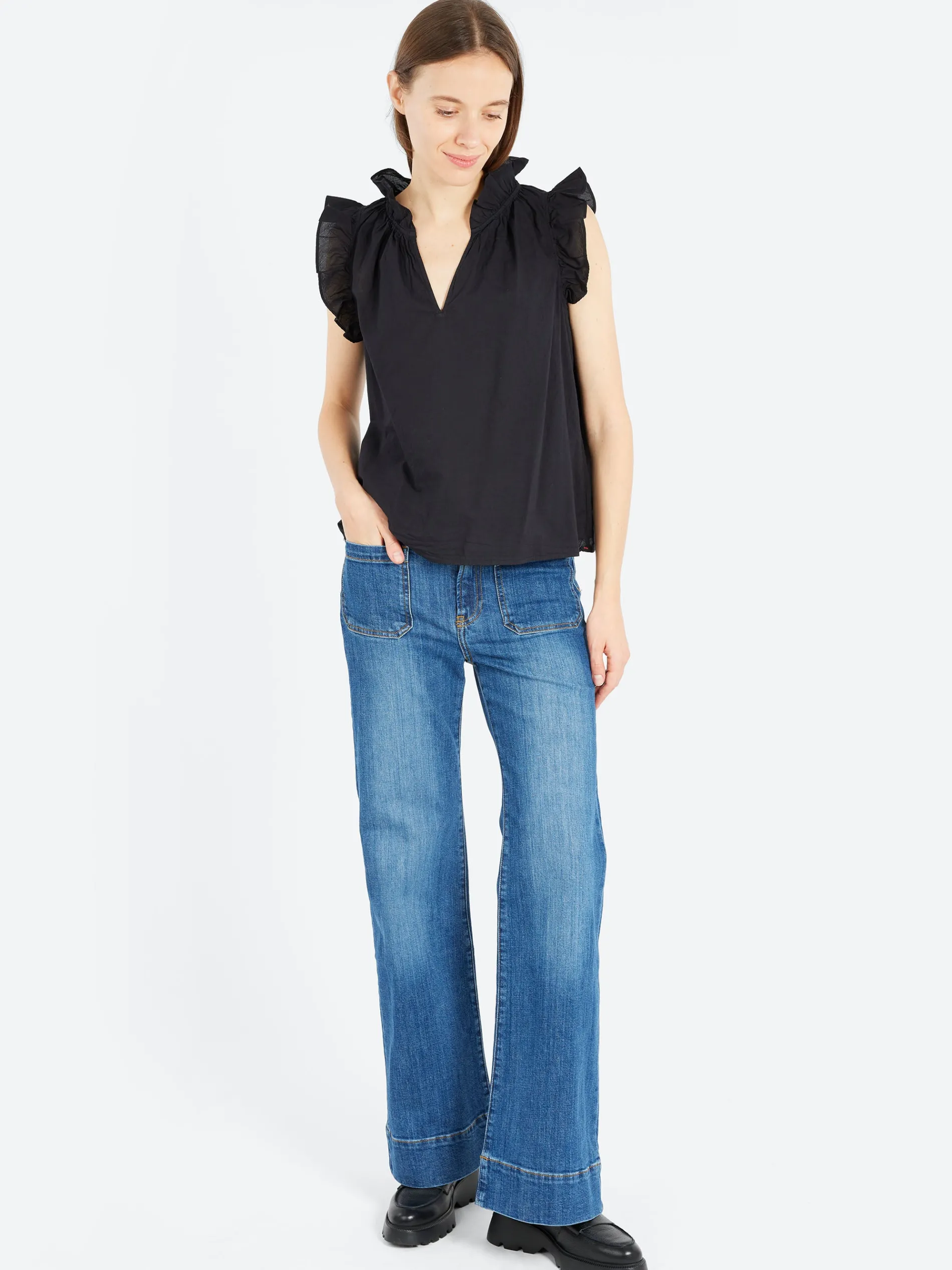 Bex is back this season in Xirena’s classic Cotton Poplin. This easy popover has a deep V-neck and ruffle detailing.