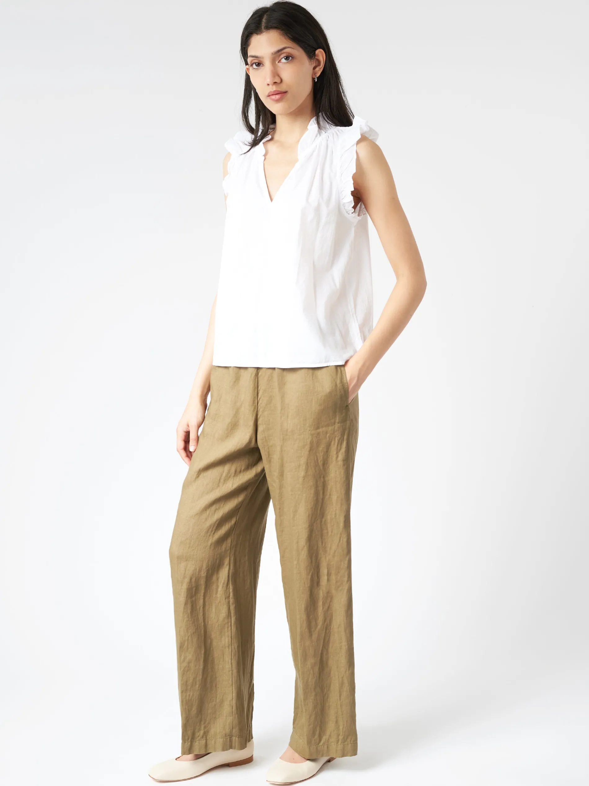 Bex is back this season in Xirena’s classic cotton poplin. This easy popover has a deep V-neck and ruffle detailing.