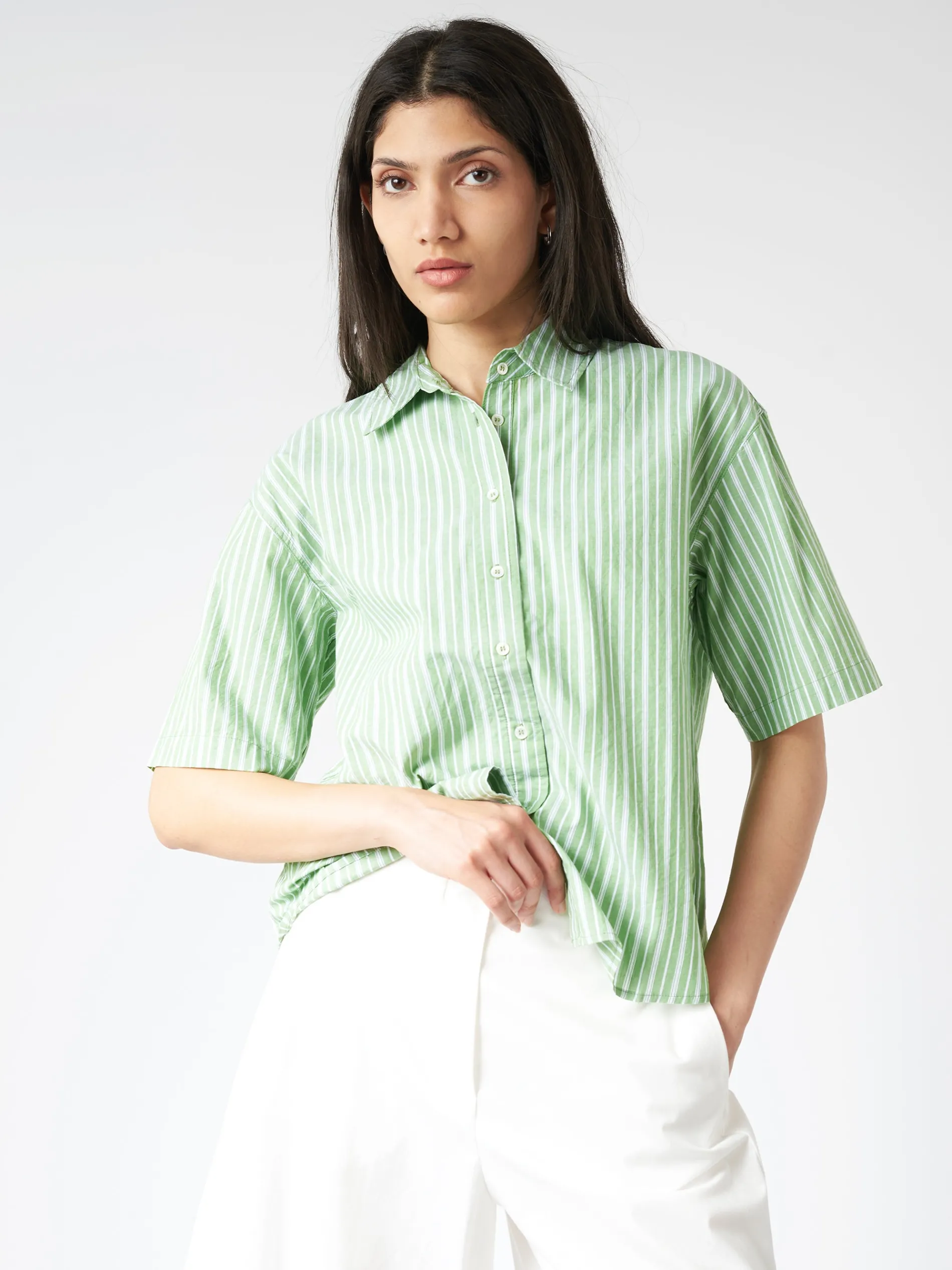 The Gracie Shirt is an easy button-front camp shirt with a boxy fit, updated in a pencil striped cotton.