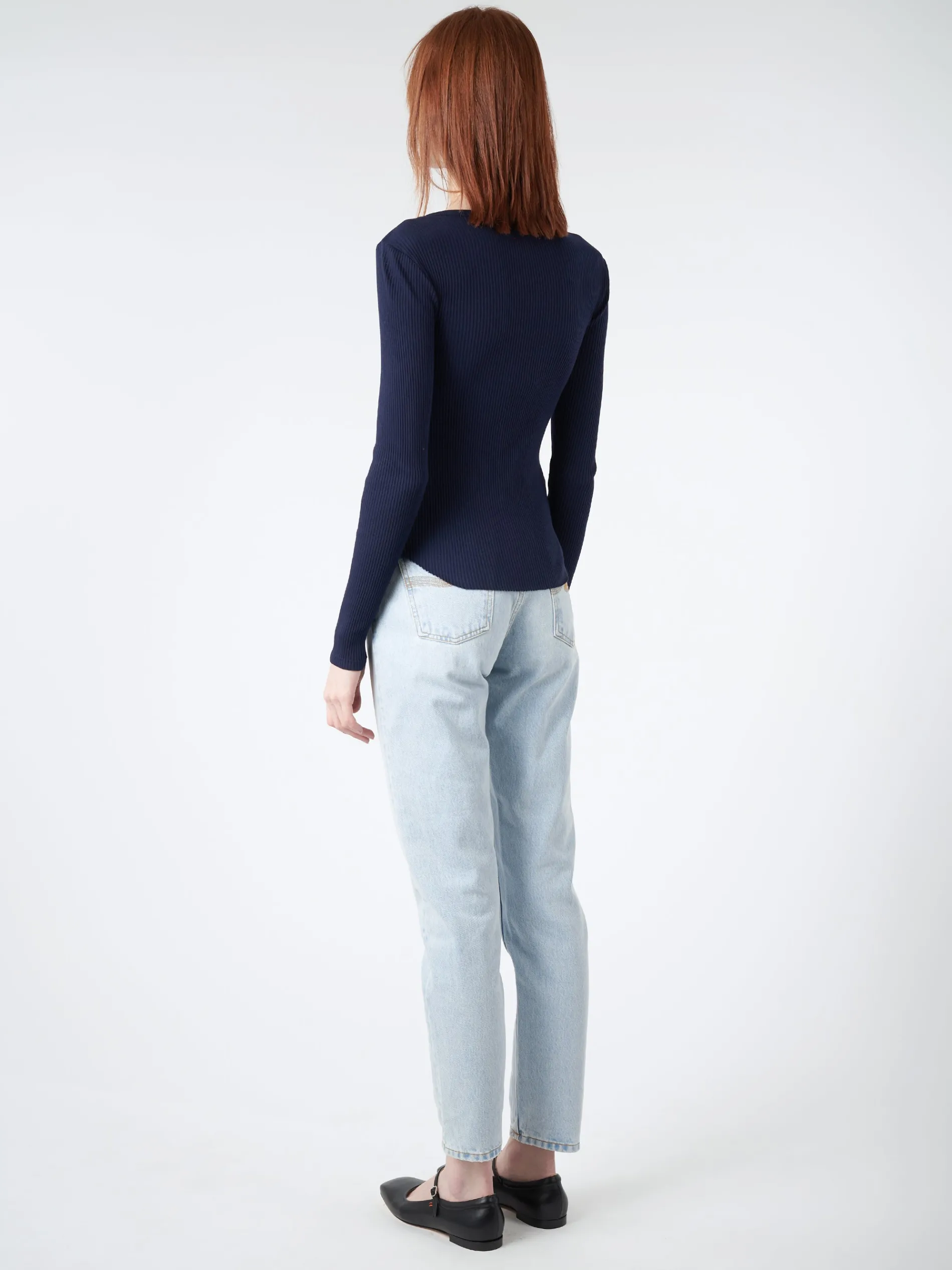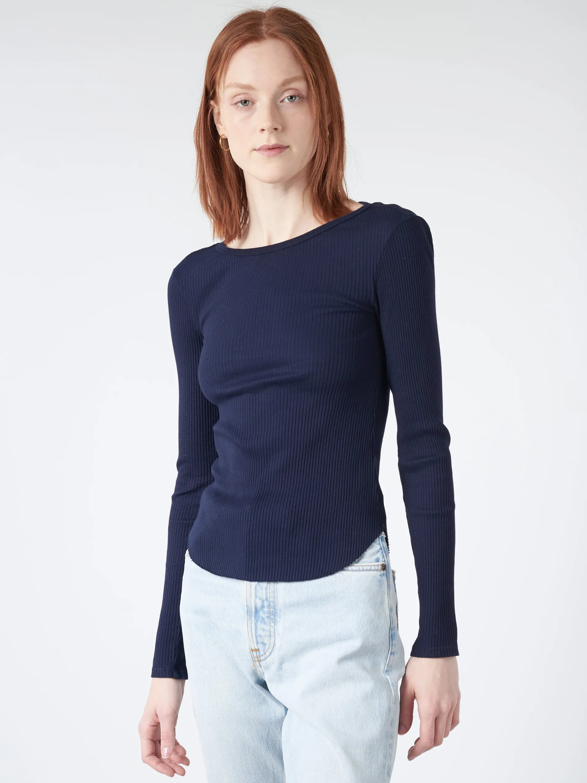 Tiegs is new this season in Xirena’s stretch cotton rib knit. This soft long sleeve tee has a raw shirttail hem and is a staple layering piece.