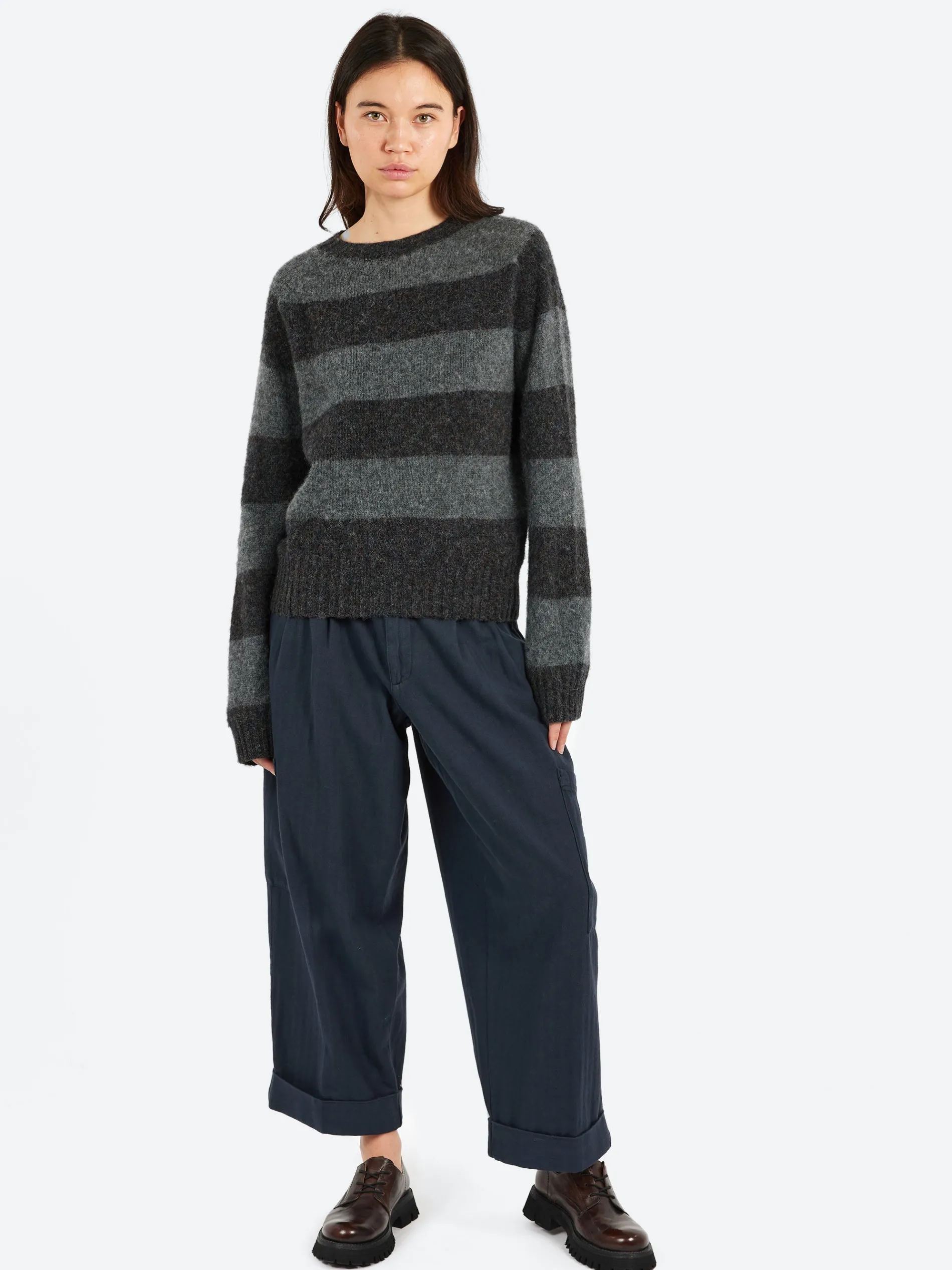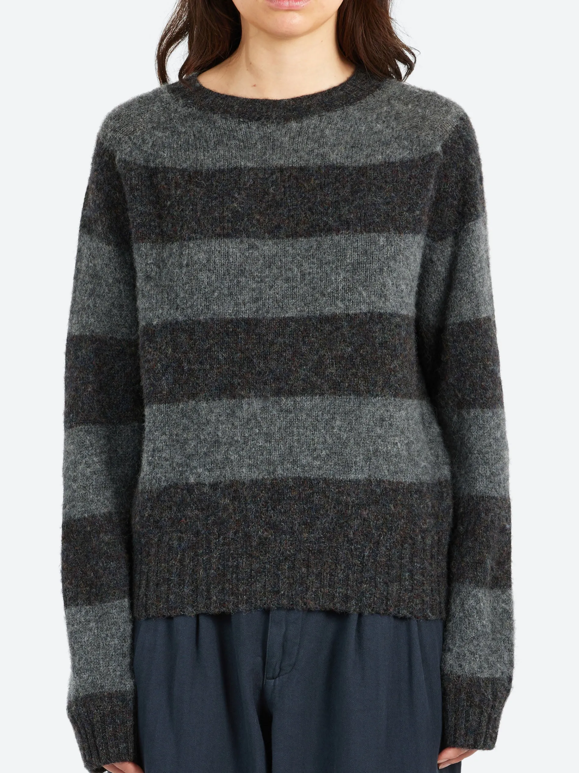 YMC knitted crew neck jumper made from brushed lambswool, offering a soft and cozy feel. The rib knit neck, cuffs, and hem add texture and structure, while the seam free construction enhances durability and ensures a smooth finish.