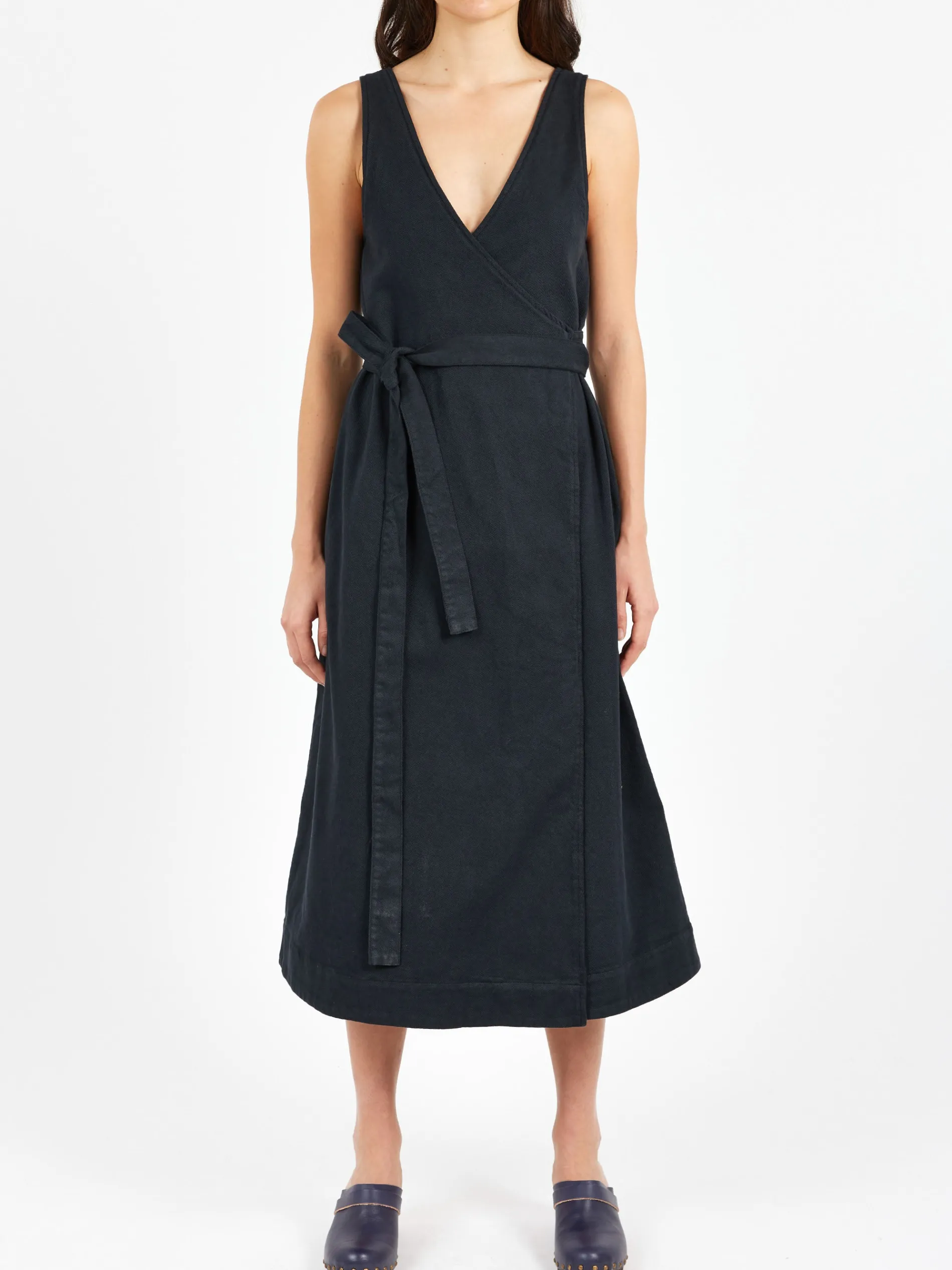 YMC mid-length sleeveless dress made from garment-dyed cotton twill, featuring a versatile wrap style with a fabric waist tie. It has a square neckline at the front and a V-shaped back, allowing you to style the dress either way for different looks. The design offers both comfort and flexibility, making it a stylish and adaptable addition to your wardrobe.