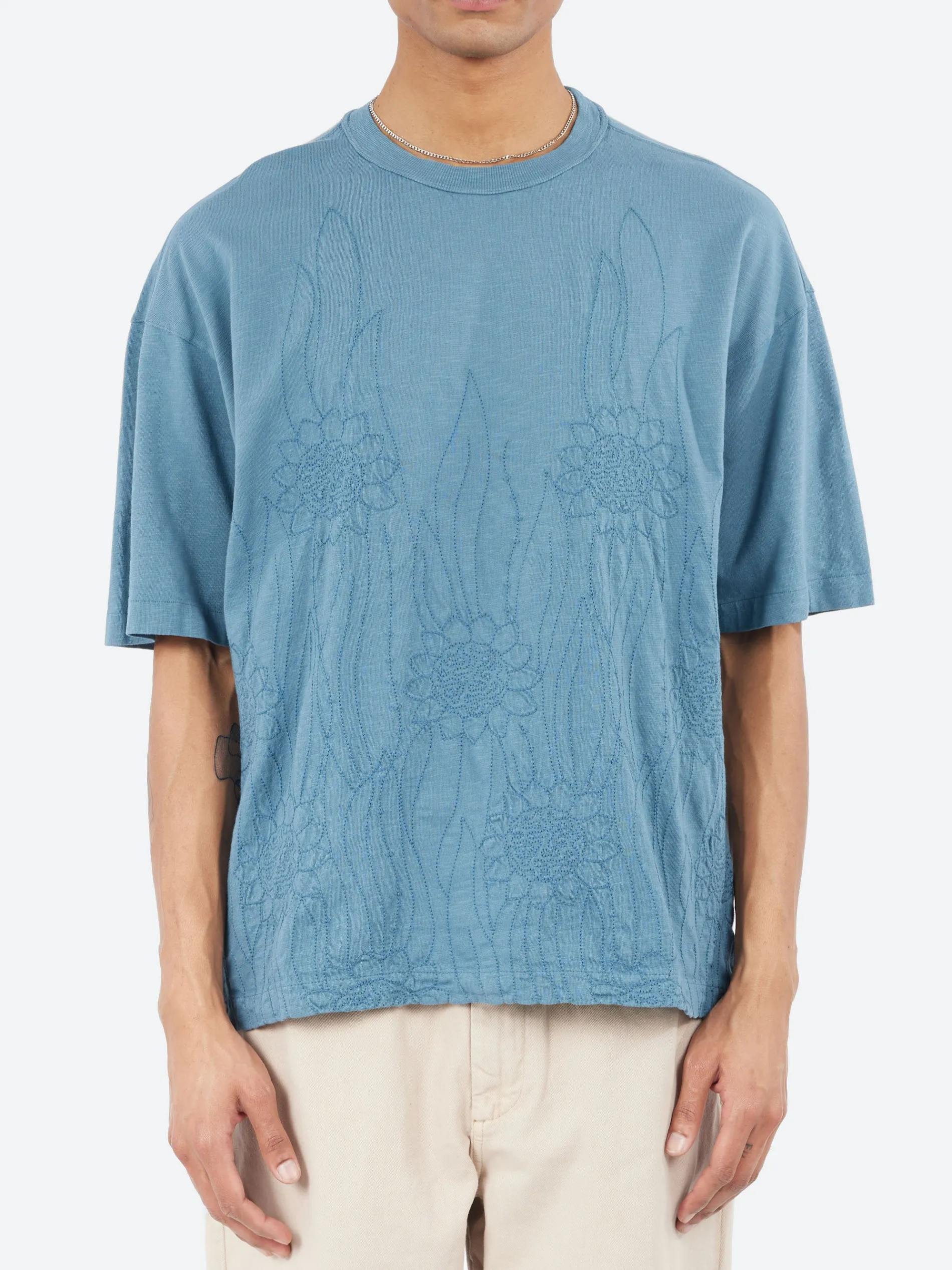 The YMC Triple T-shirt is made from midweight organic cotton jersey. It features a bound-style ribbed neckband for added durability, along with sunflower embroidery panels for a unique touch. The shirt also includes side seam vents for improved fit and mobility, all while providing an oversized fit for a relaxed, modern look.