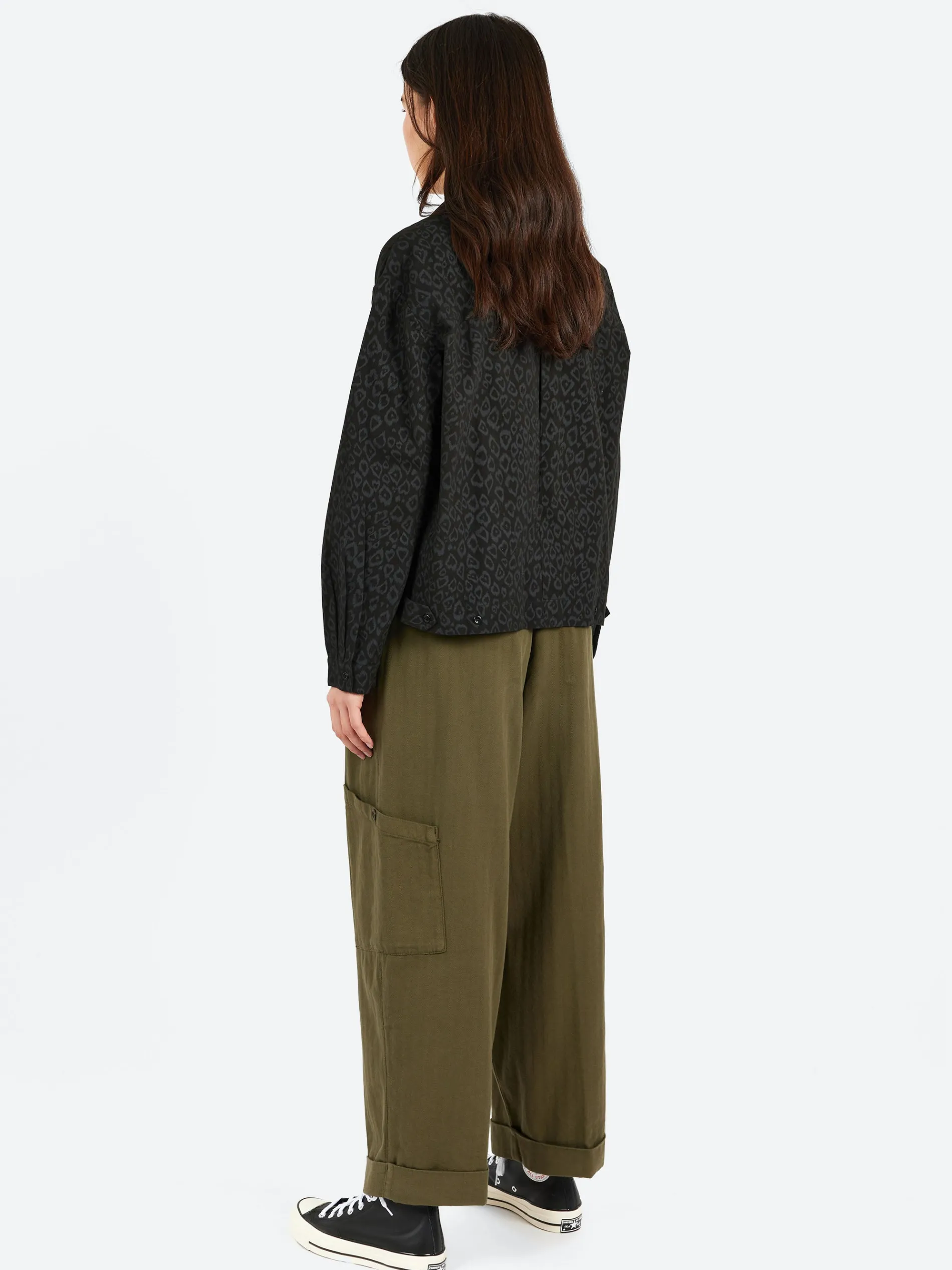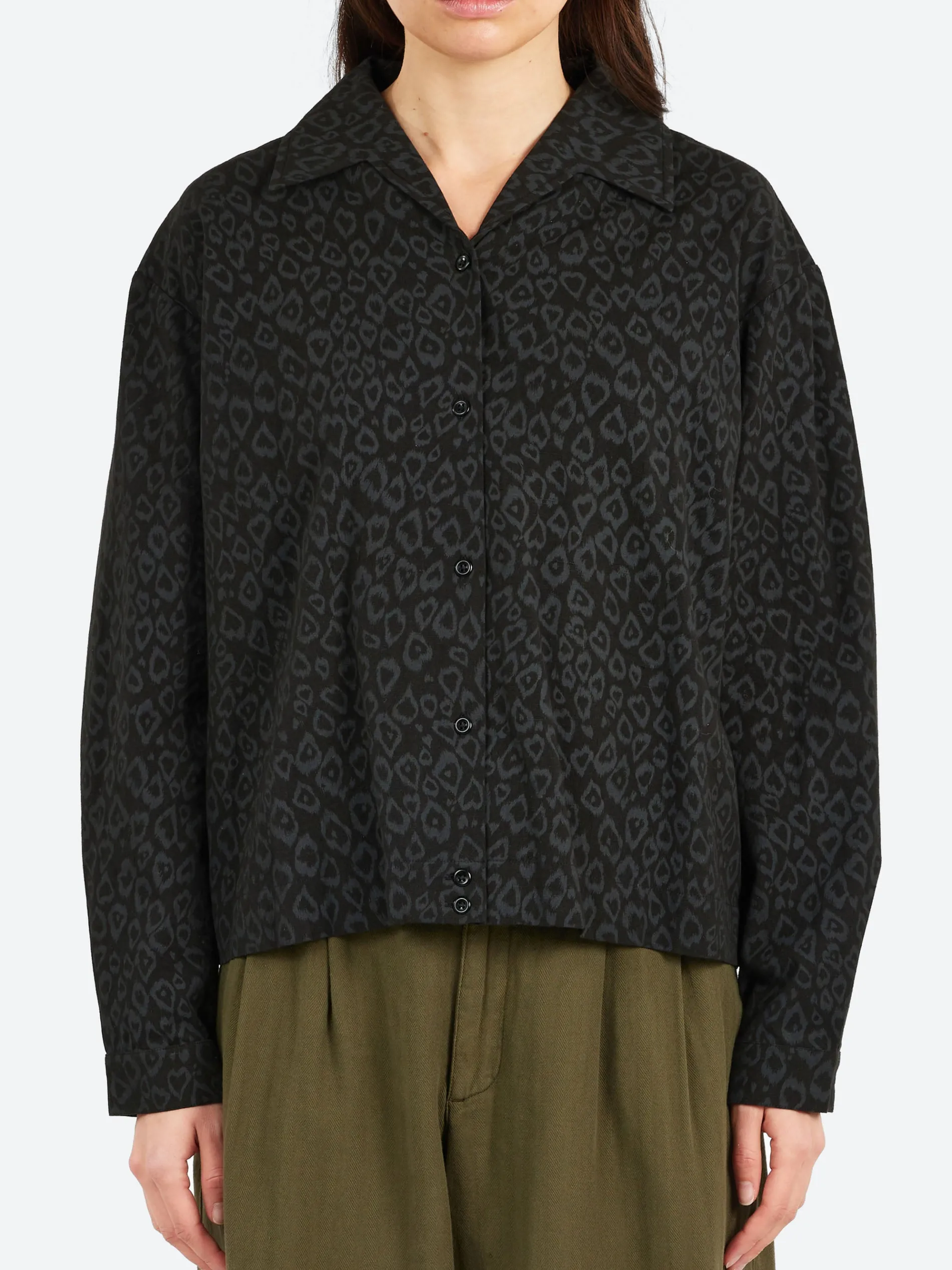 A boxy-fit long sleeve shirt crafted from an Indian cotton-linen blend, featuring a tonal leopard print design for a subtle yet striking look. The shirt has a grown-on collar, adding a seamless, modern touch to its design.