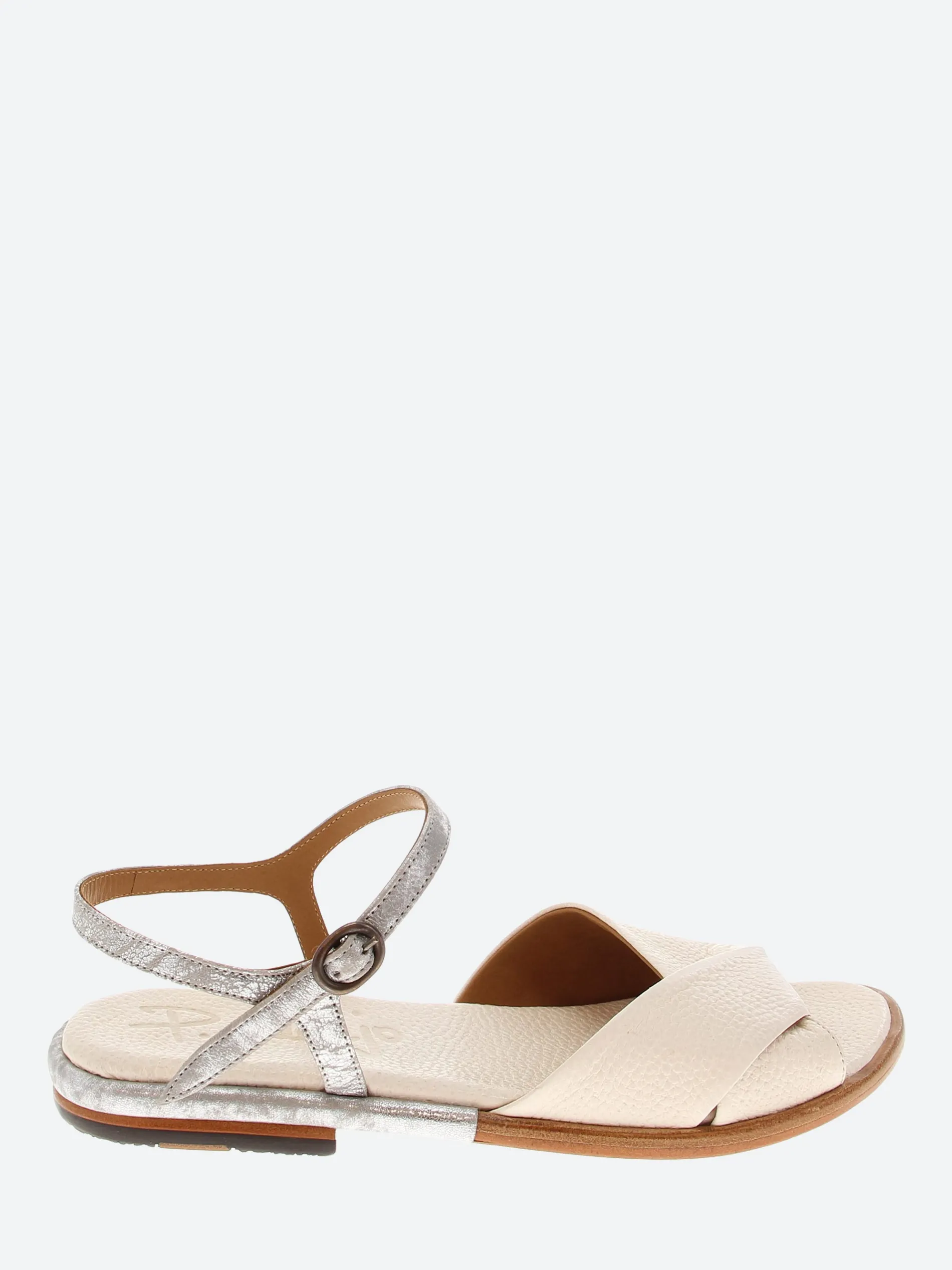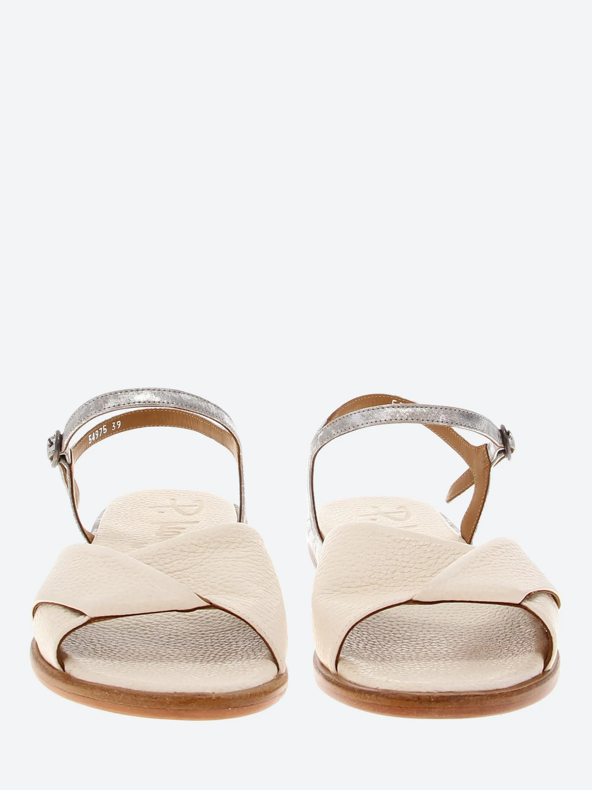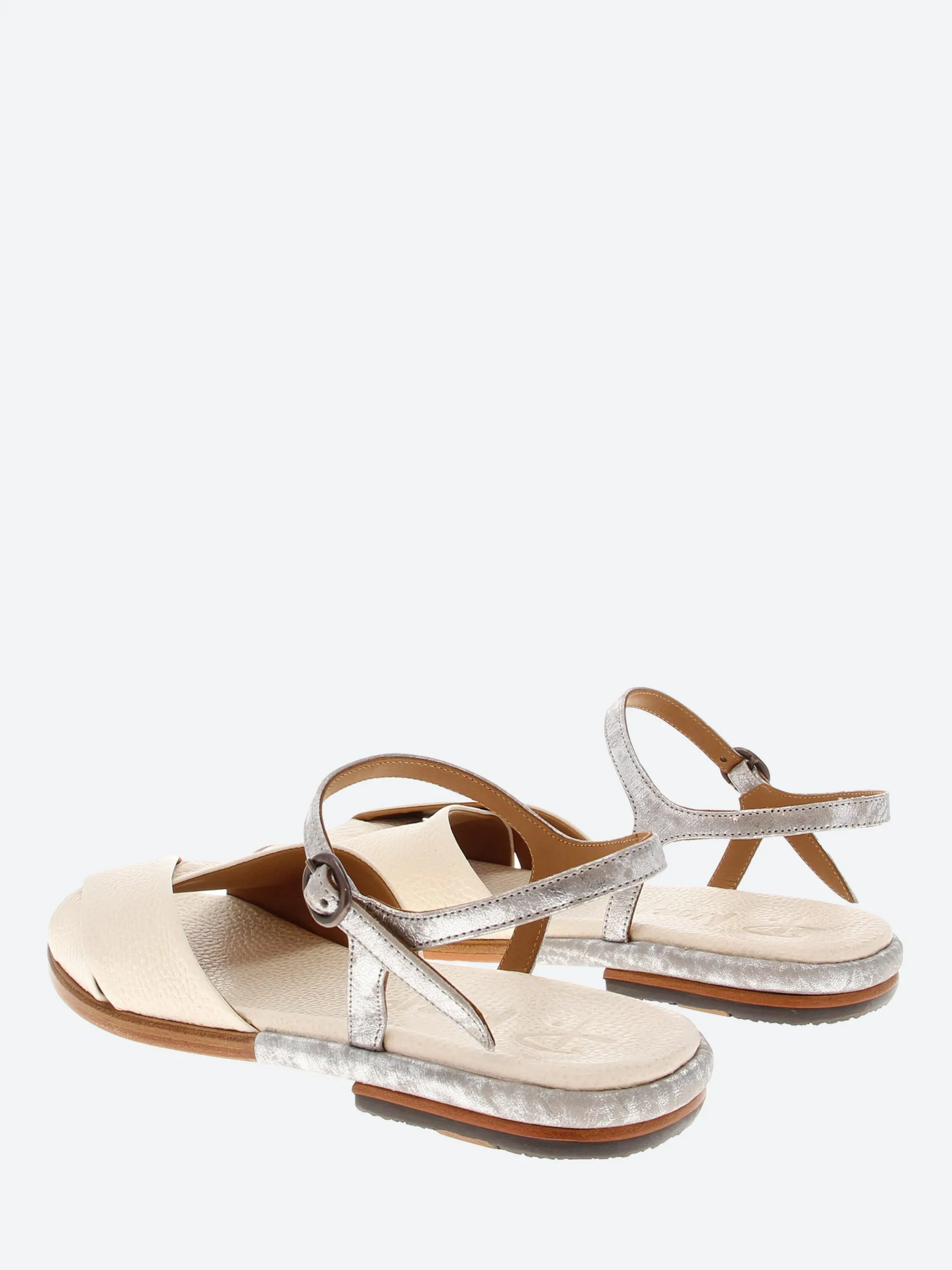 P. Monjo flat leather two-tone sandals designed in Menorca, Spain. Leather sole with non-slip rubber piece and insole made of the same leather.