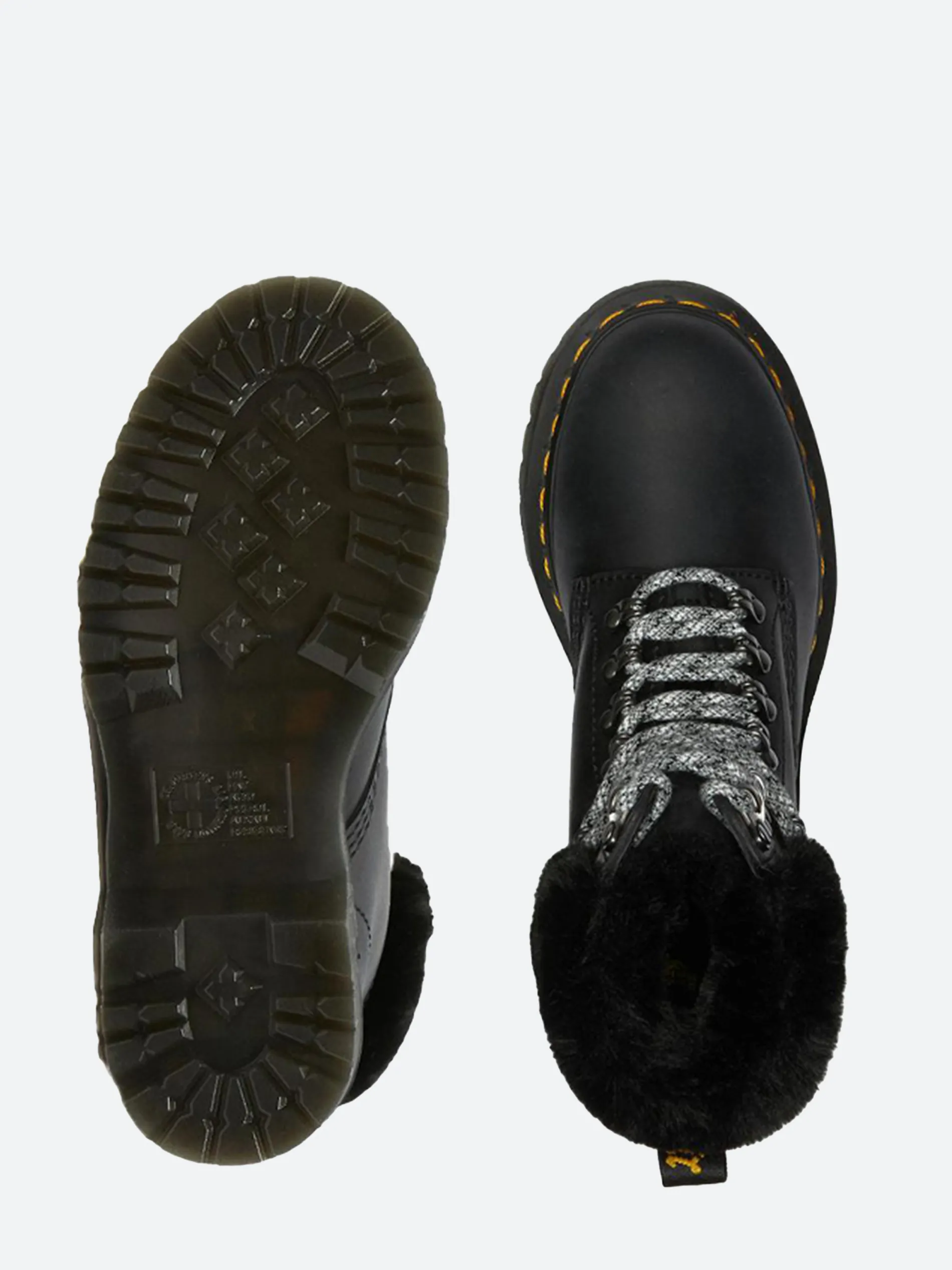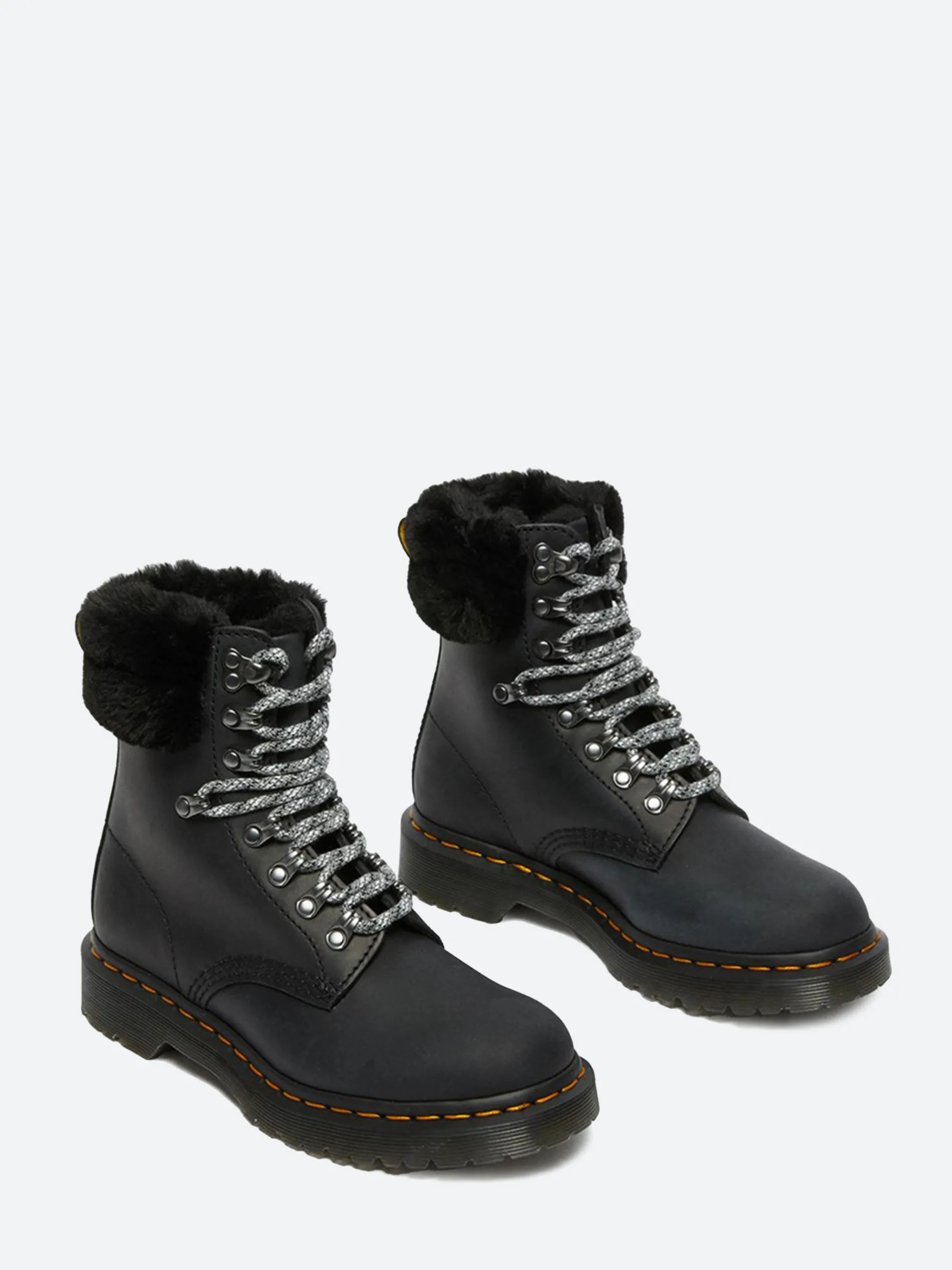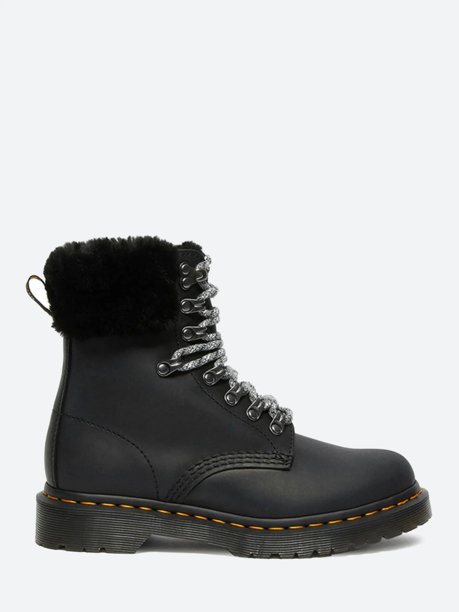 These WarmWair boots are crafted from tough-as-nails Streeter leather and lined with soft faux fur. Fitted with a matching faux fur collar, they’re detailed with staggered laces and a mix of hiker inspired hardware. The boots sit on a rugged commando sole with all Dr. Martens core markings in place: yellow welt stitching and a scripted AirWair heel loop.