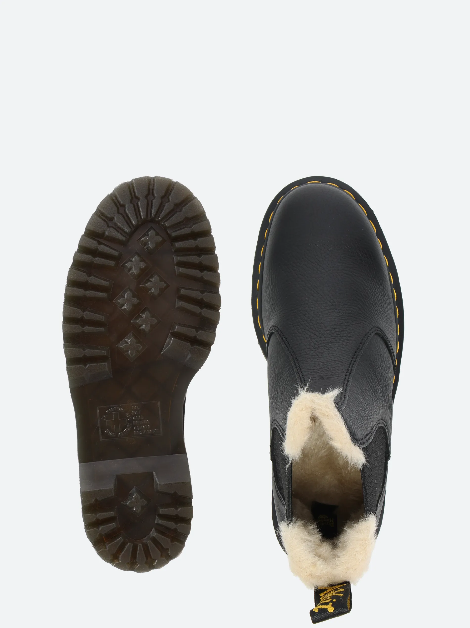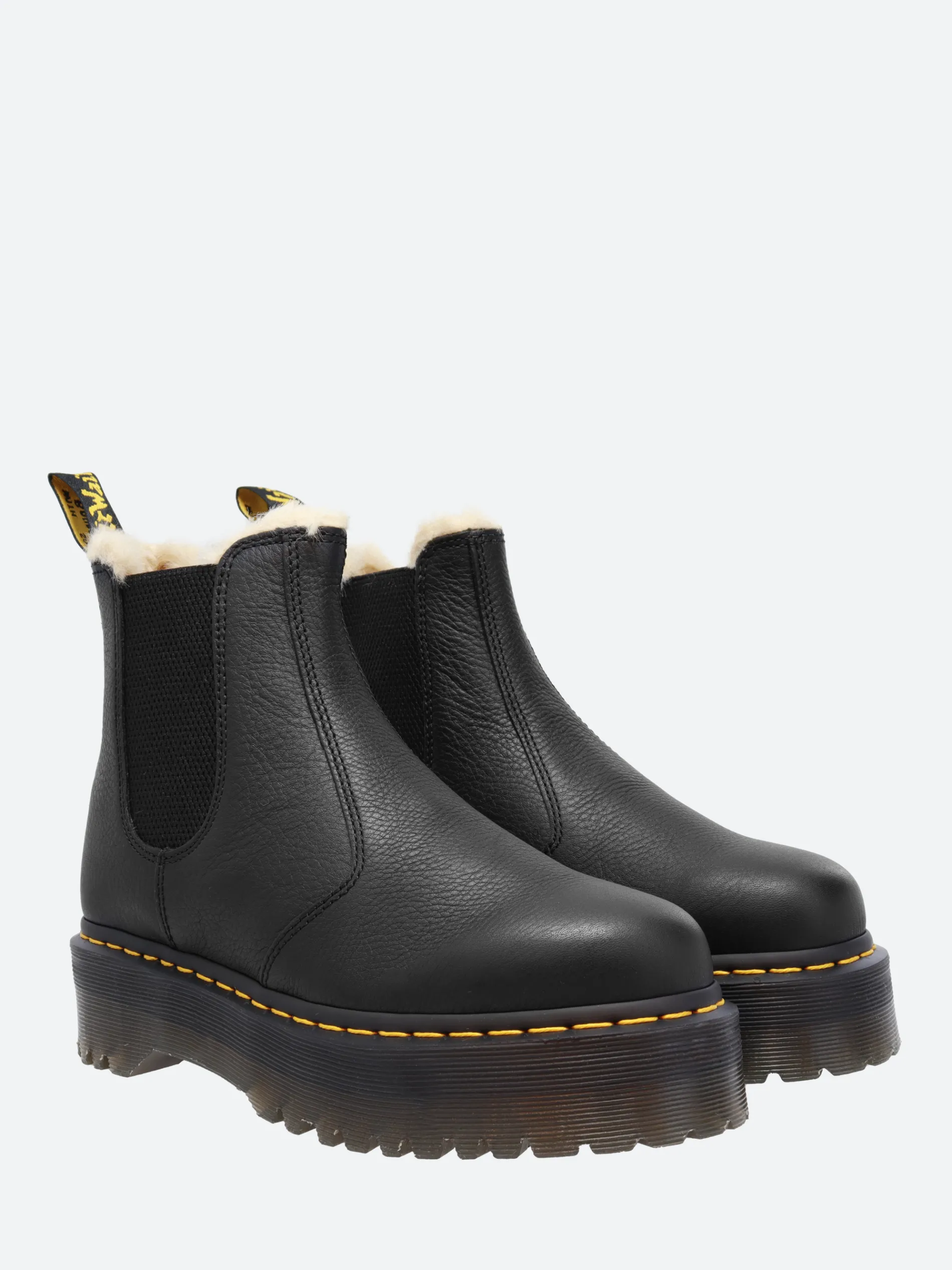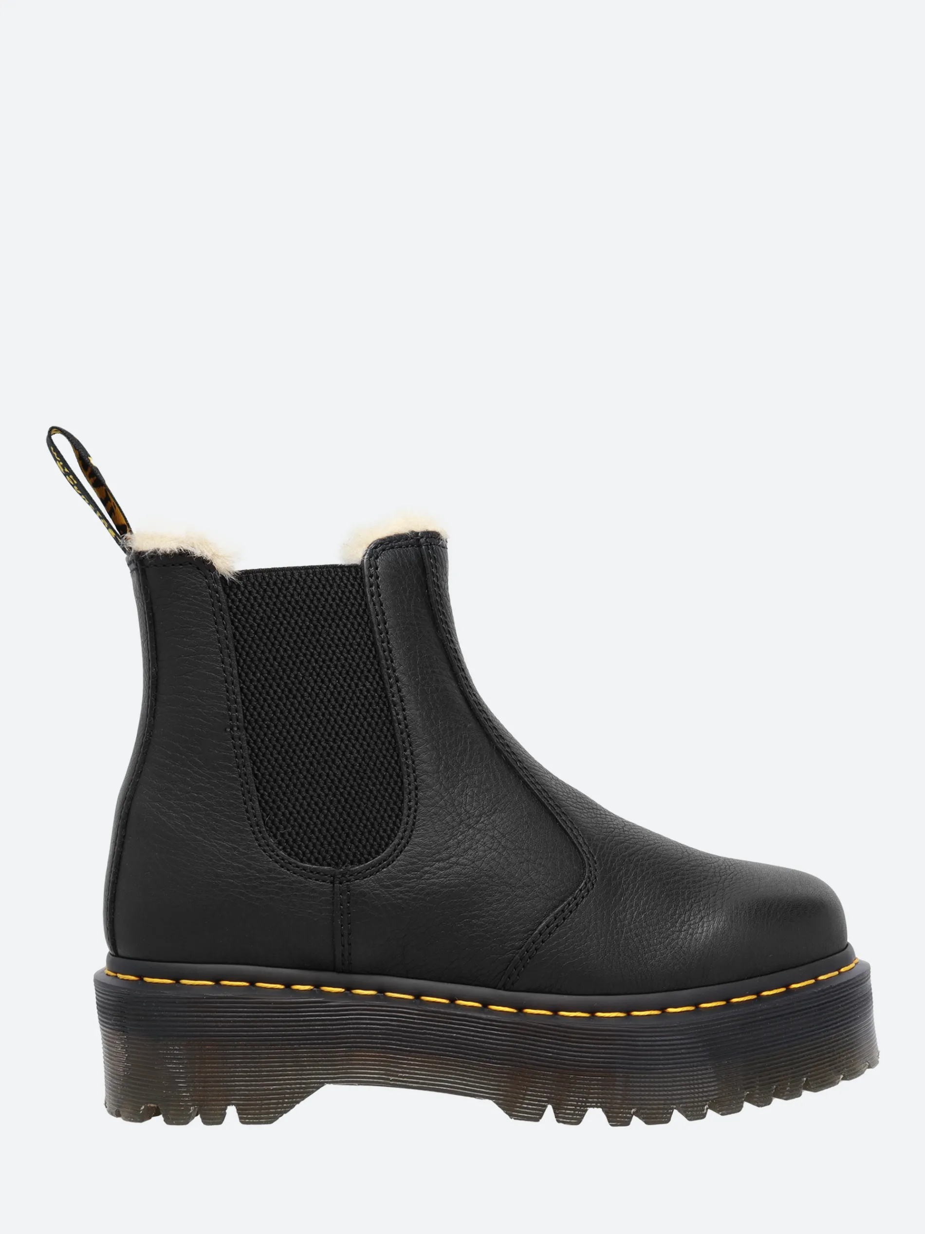 Dr. Martens 2976 Chelsea boot with an easy-on, easy-off elasticized gusset and a fur-lined trim. A versatile boot that works with everything.