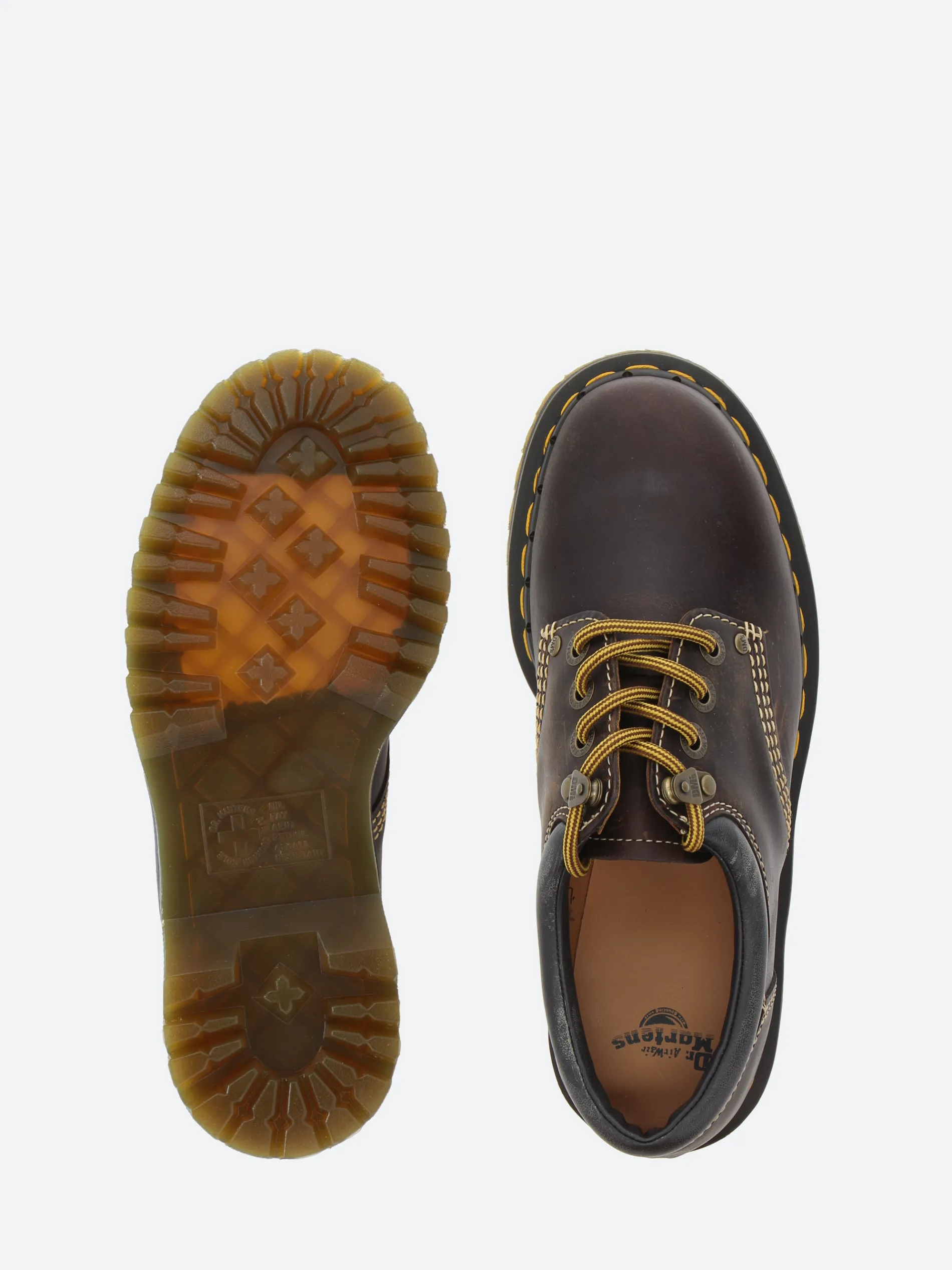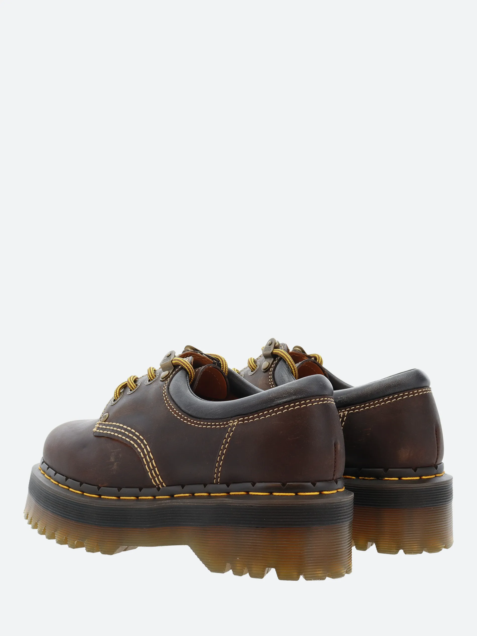 This archive-inspired rework of Dr. Martens’ 8053 shoe captures the spirit of long summer days. Built from rugged Crazy Horse leather designed to mark and change with every wear. The upper is detailed with contrast ecru stitching, antique brass eyelets, hiker laces and a brown and a padded ankle collar for added comfort. The formidable Quad sole is secured with a bitter choc notched welt and yellow welt stitching.