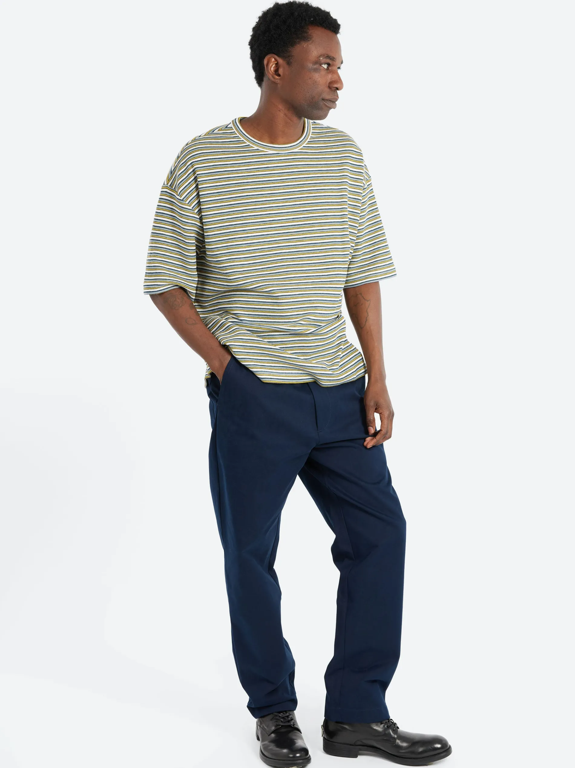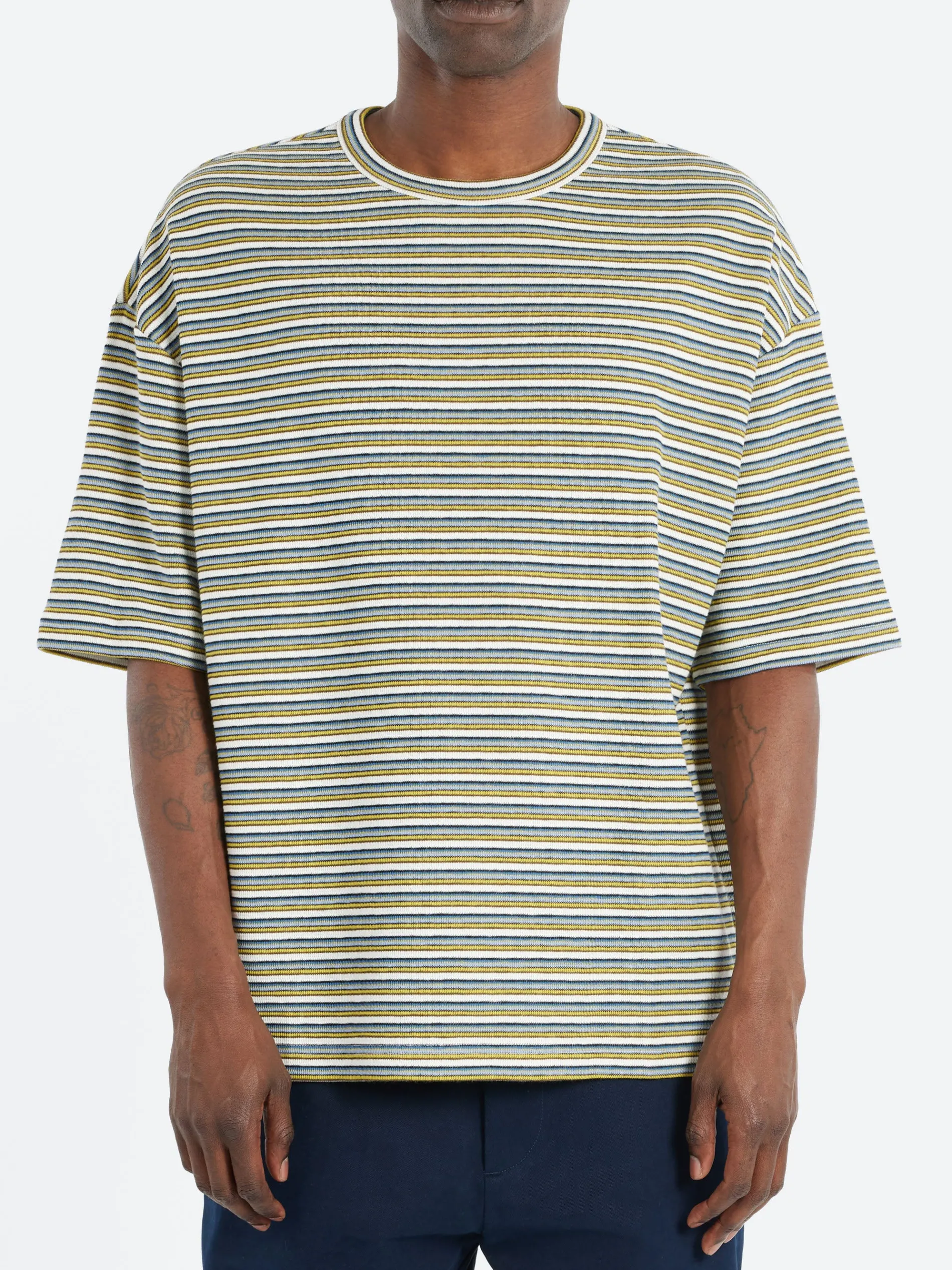 Heavyweight ecru t-shirt with multicolored stripes in organic cotton.